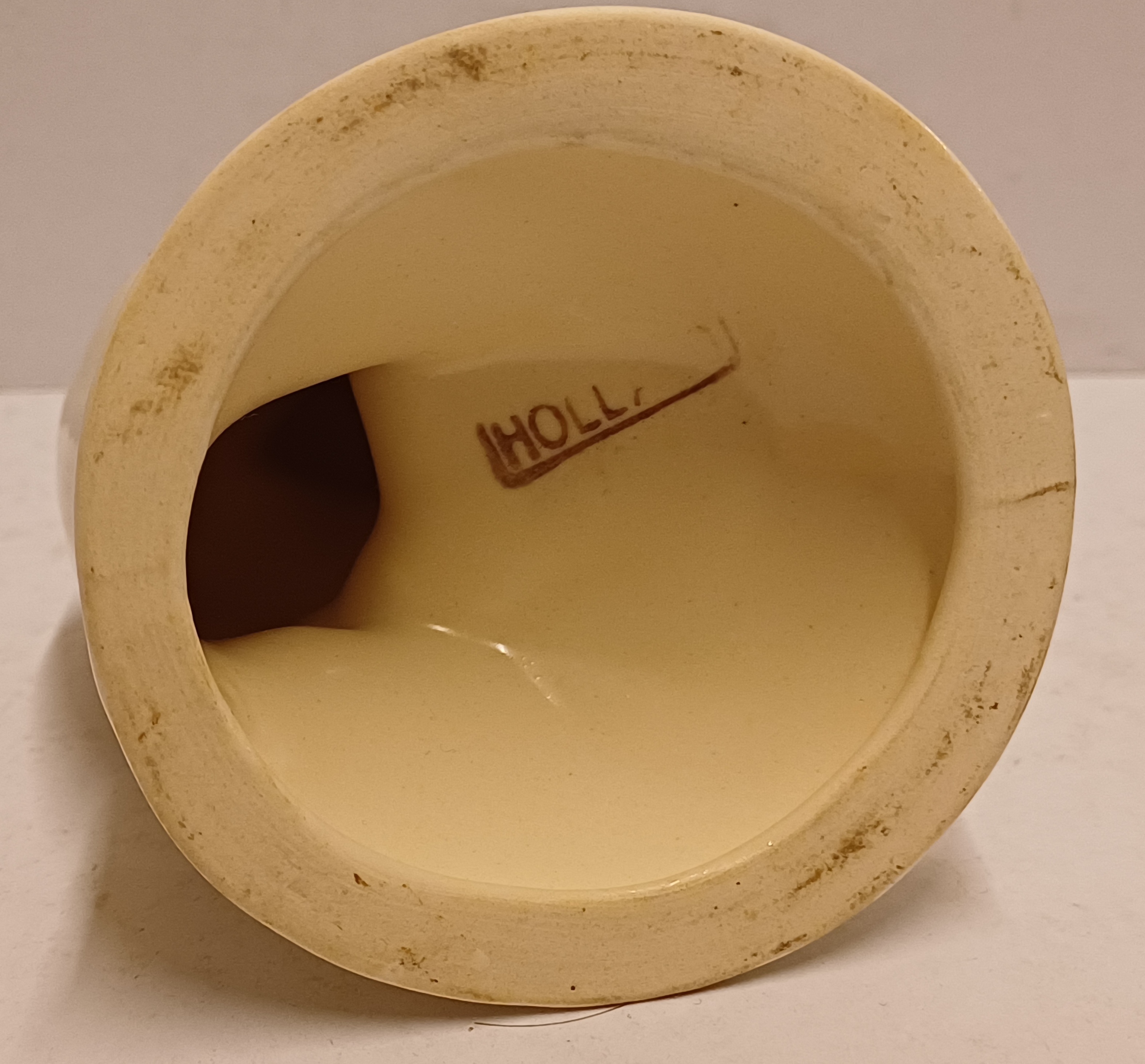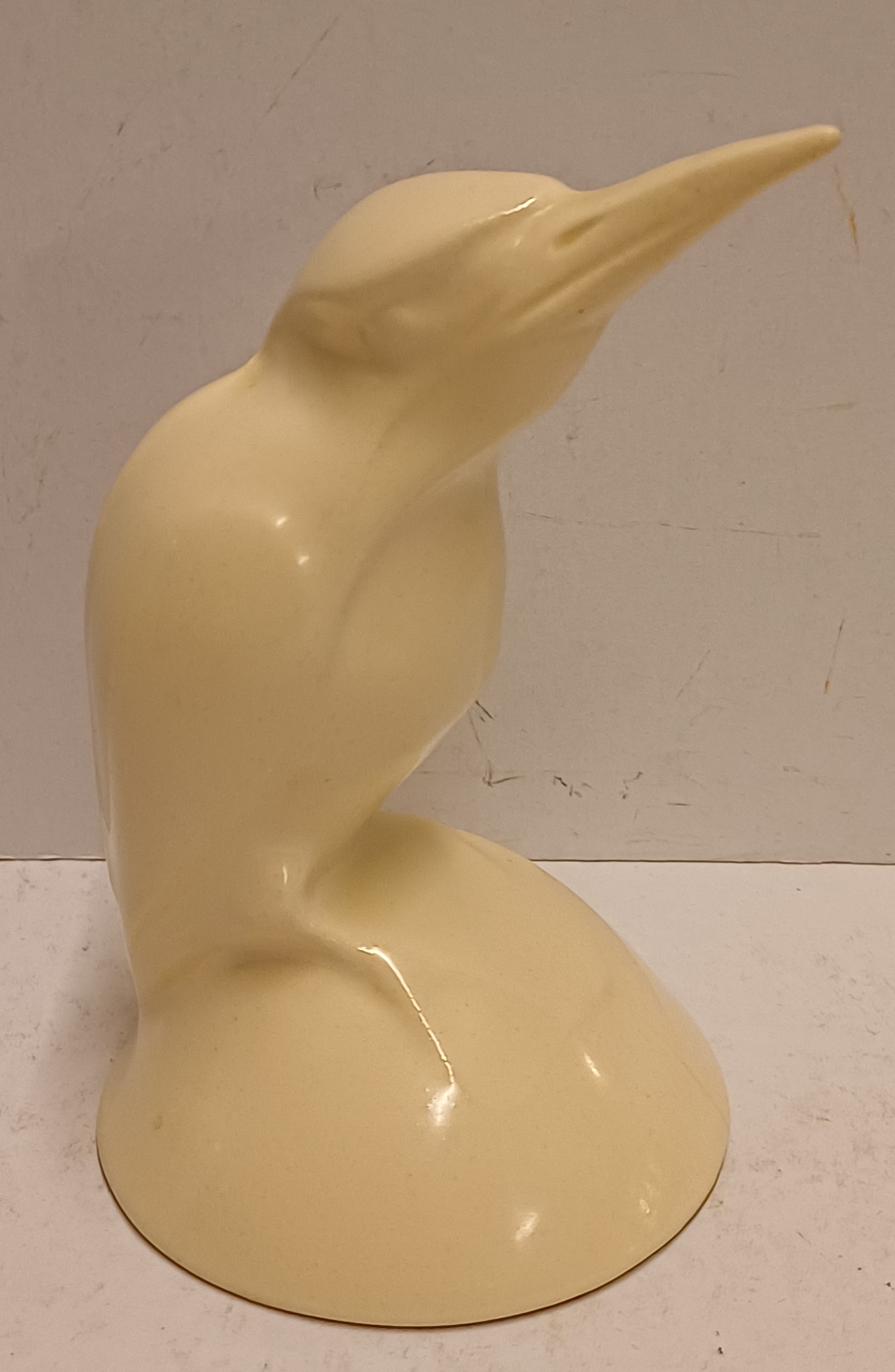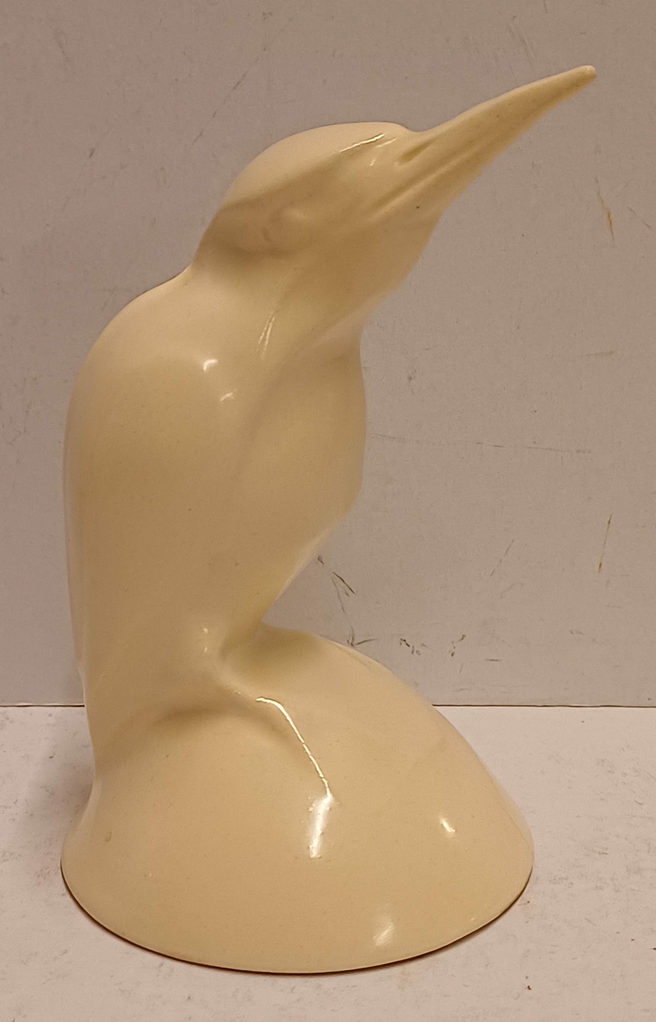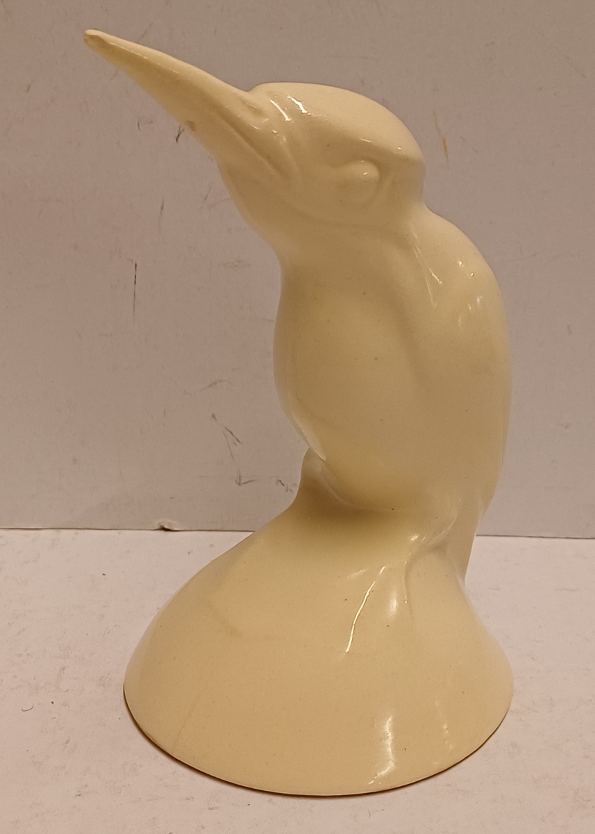 Creme plastiek van een zittende ijsvogel., Ontwerp Jan Schonk voor Plateelbakkerij Zuid Holland. Onderzijde met Bruin Holland stempel.