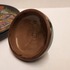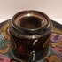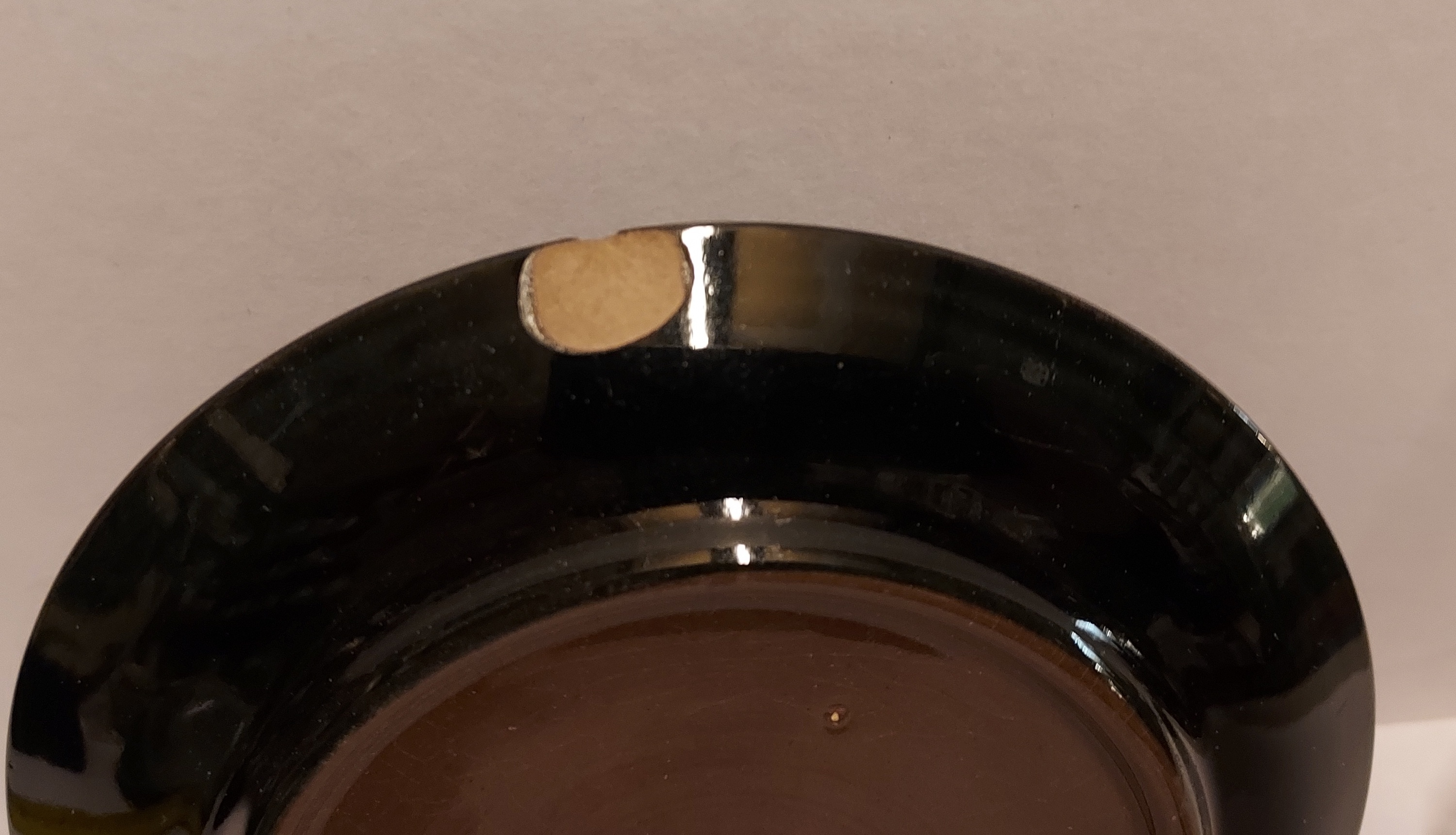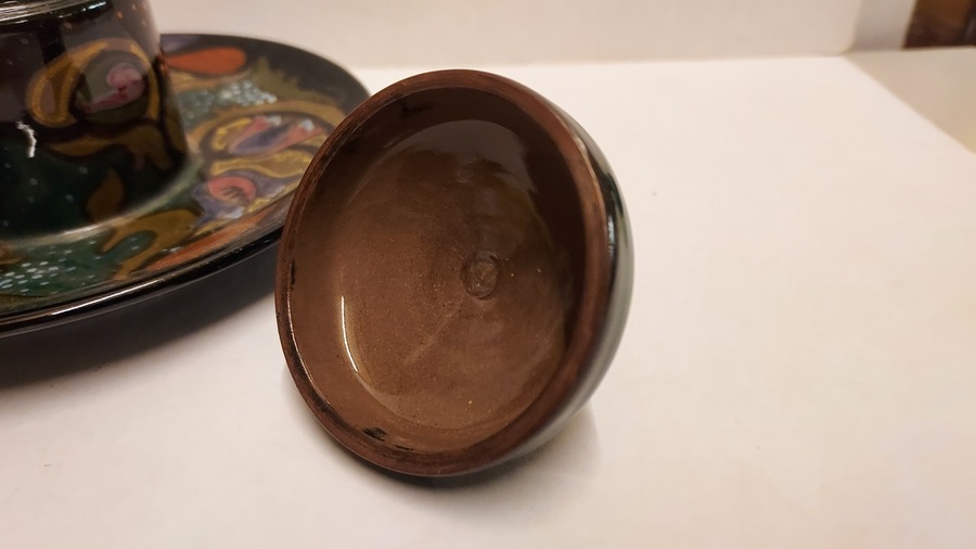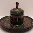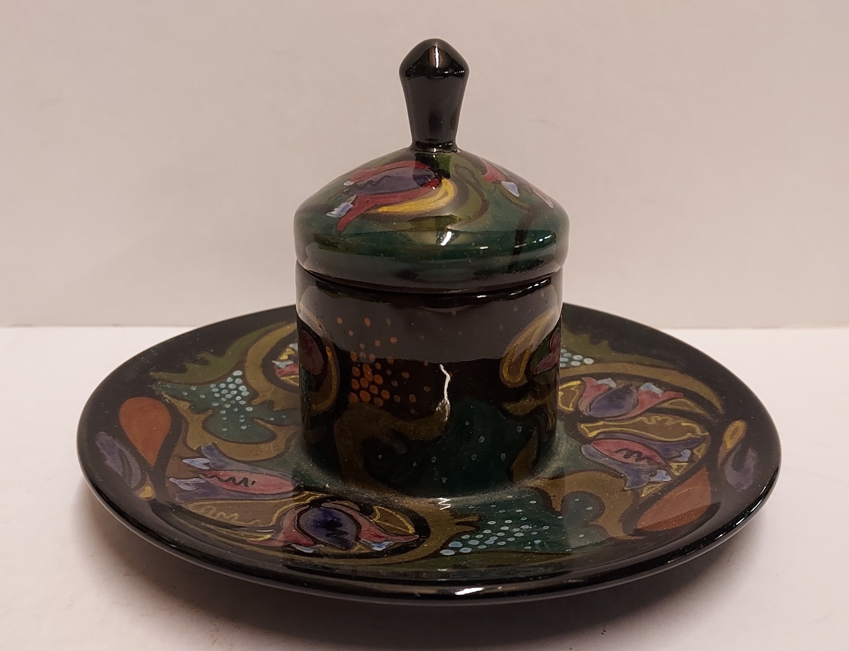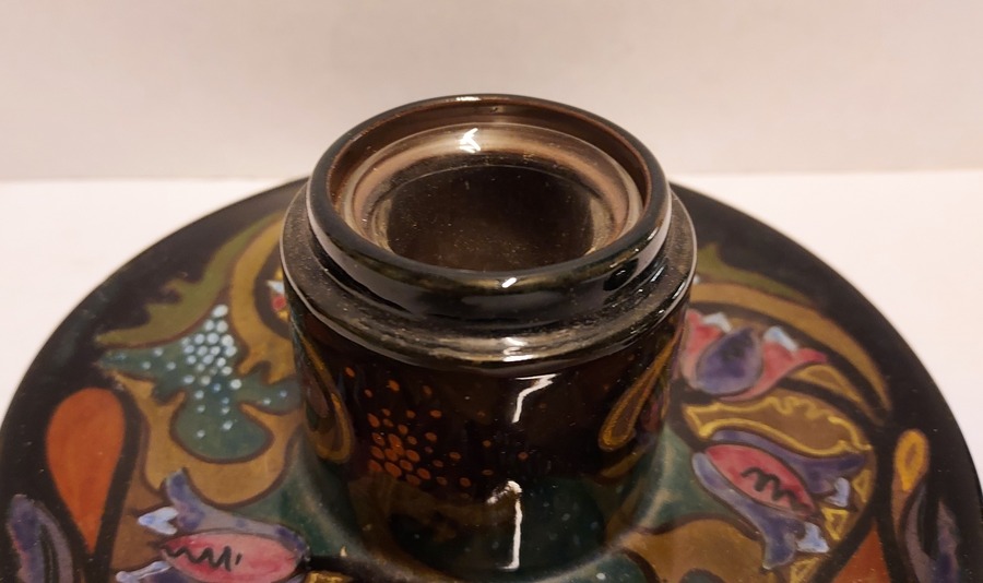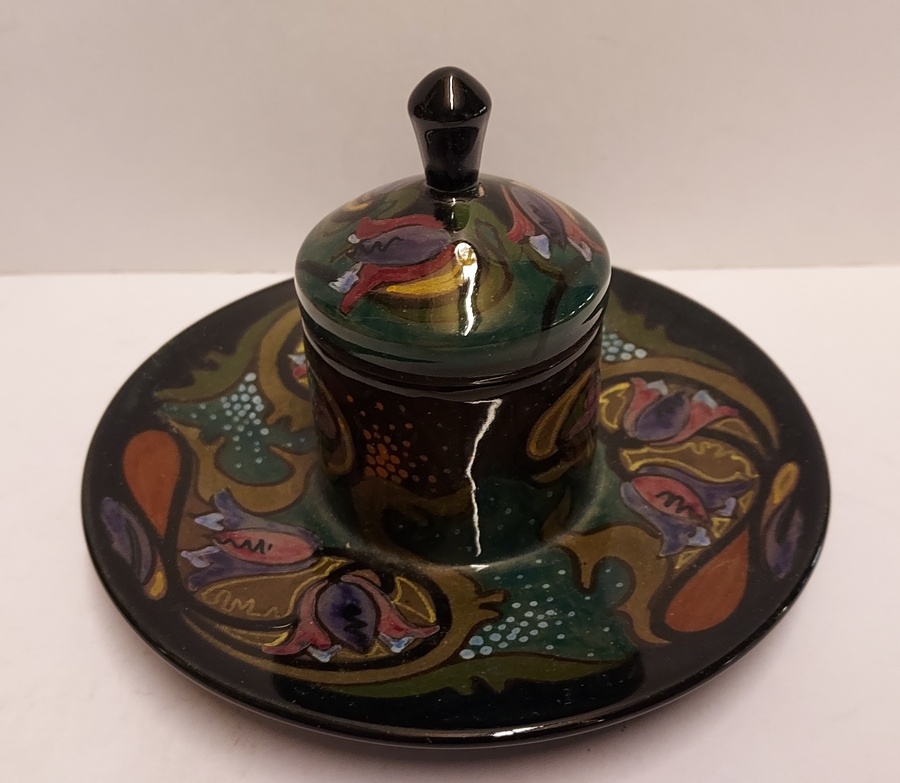 Glansplatelen inktpot met los deksel. Met gestileerd floraal decor. Onderzijde met fabrieksmerk.