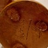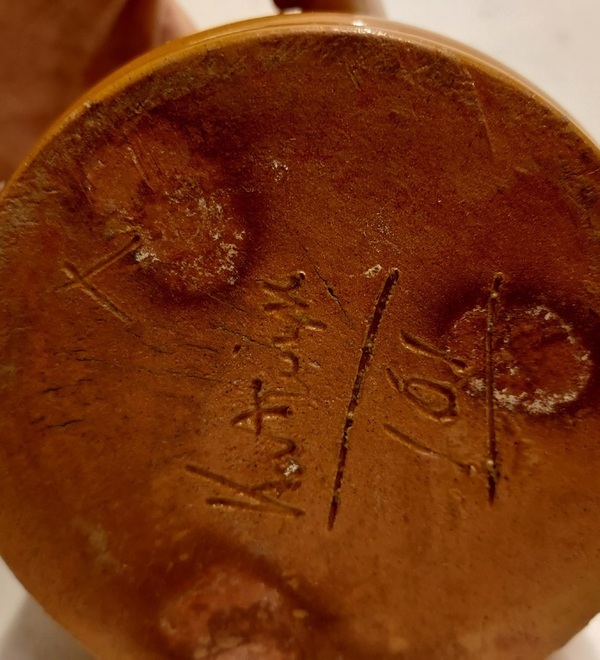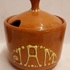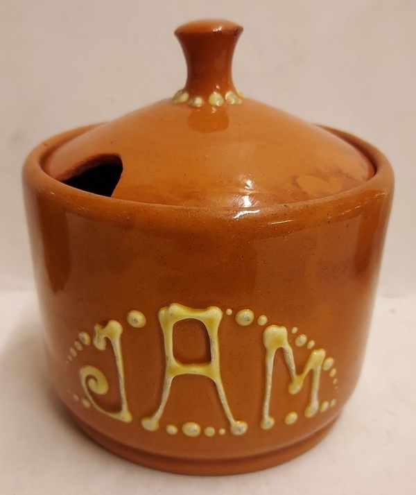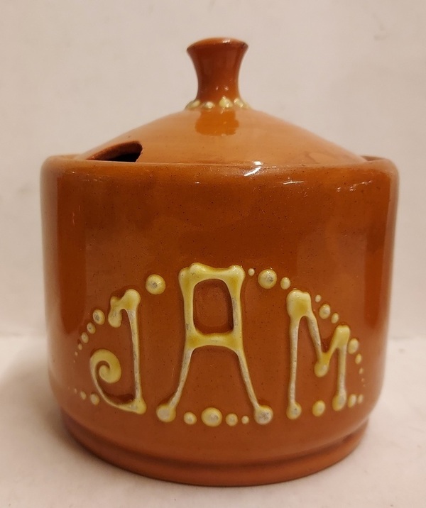 Earthenware lidded pot with slip decoration "Jam". Made in Katwijk.