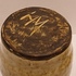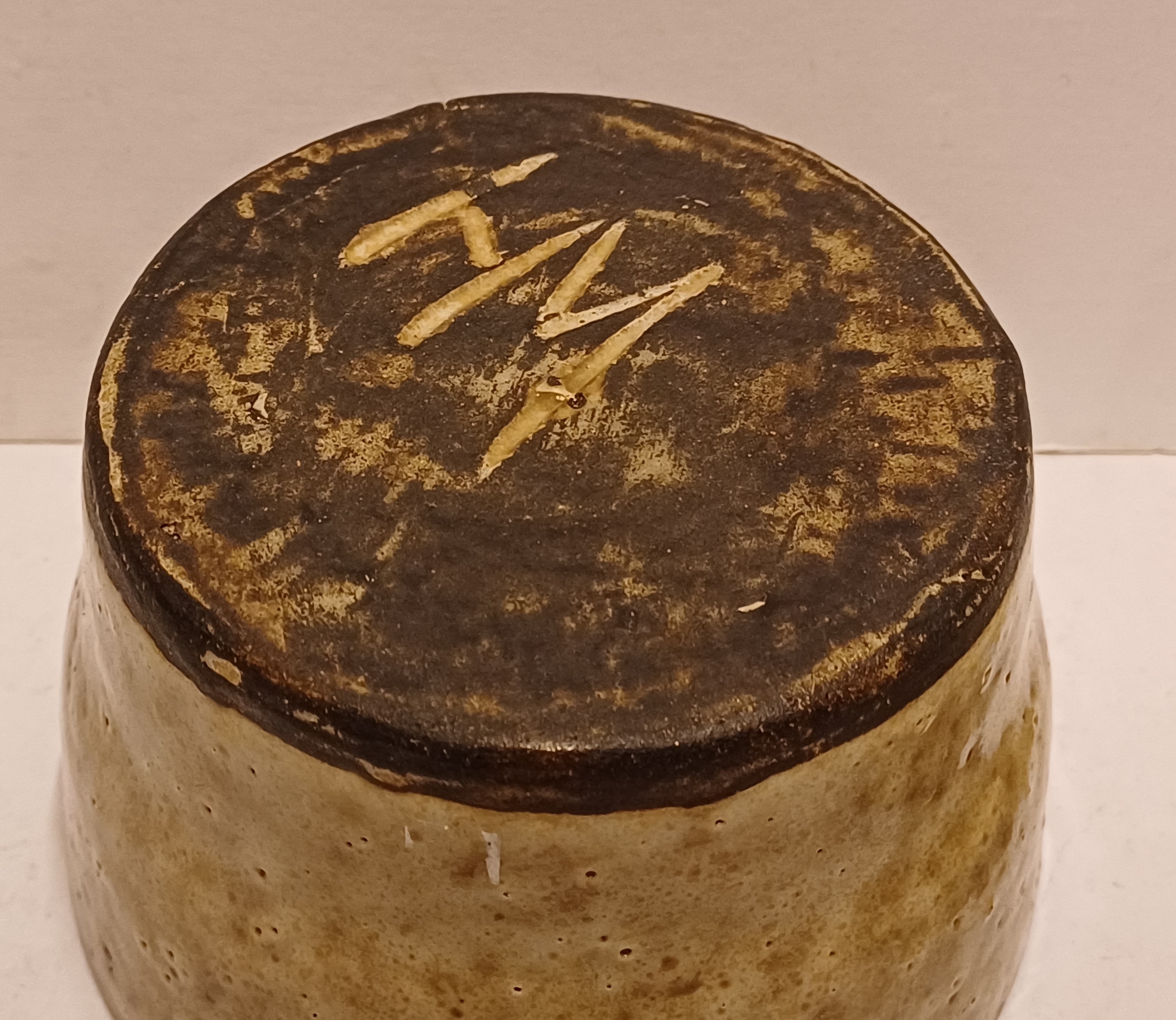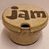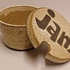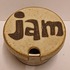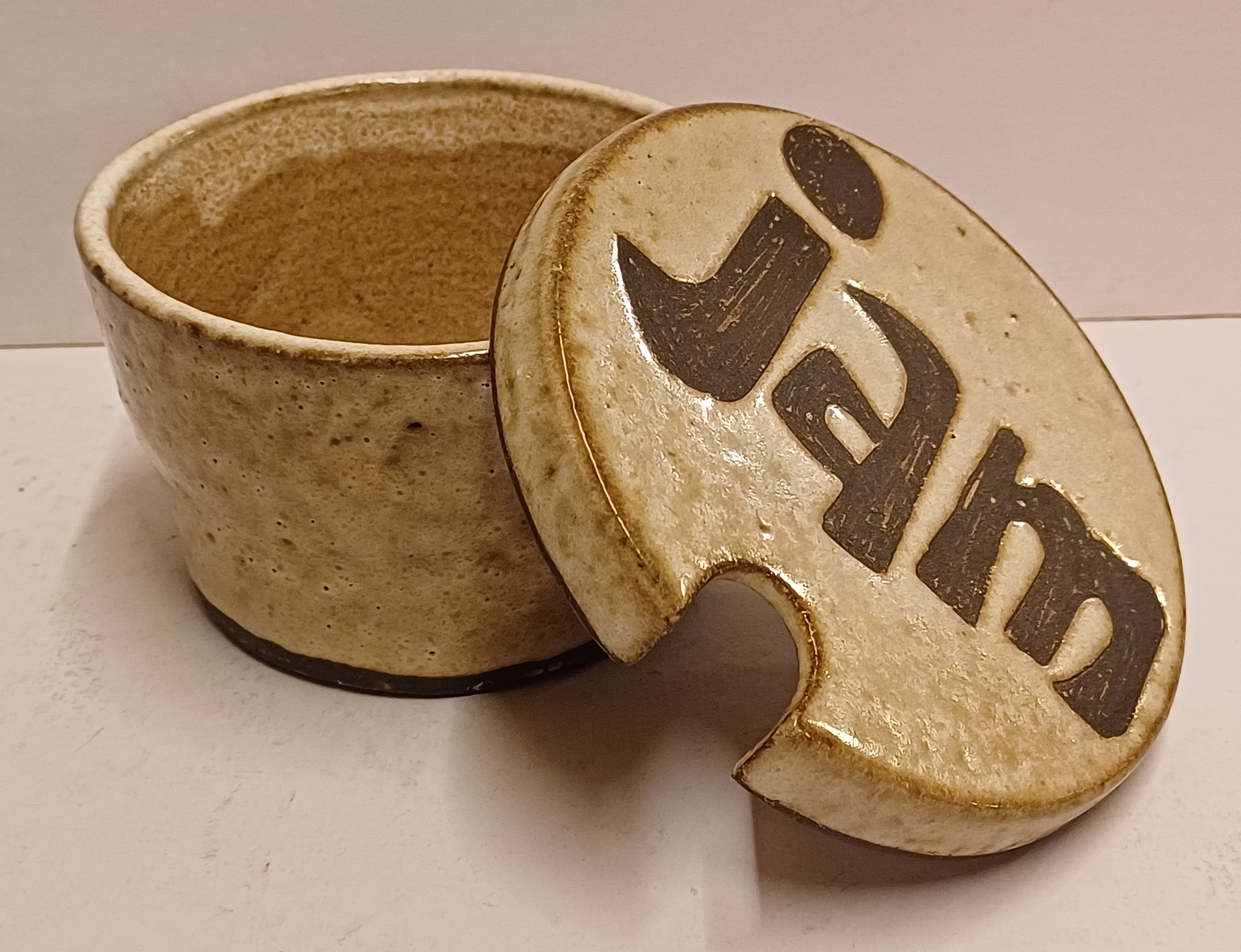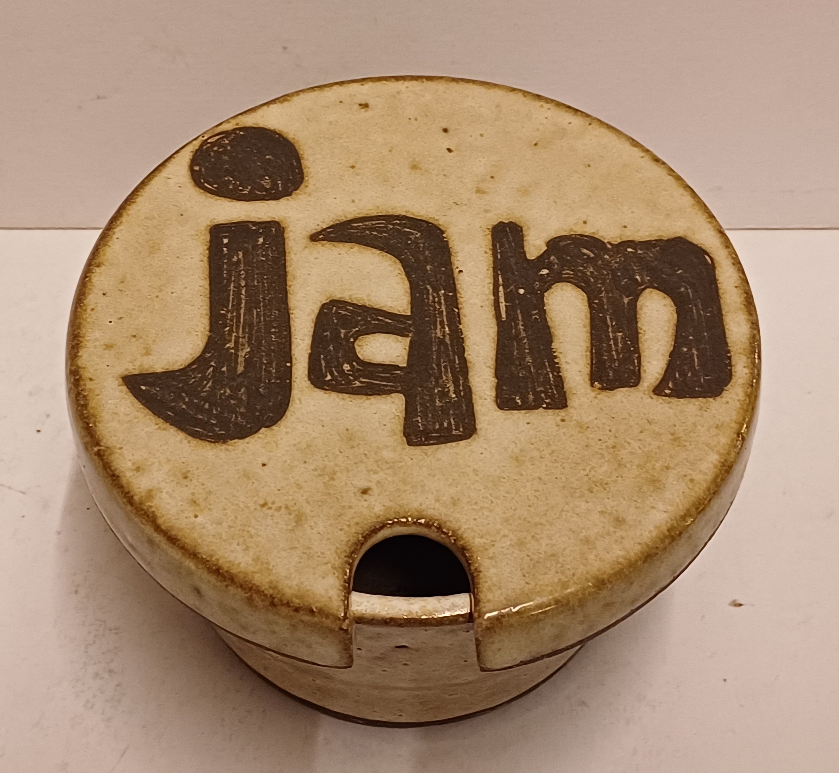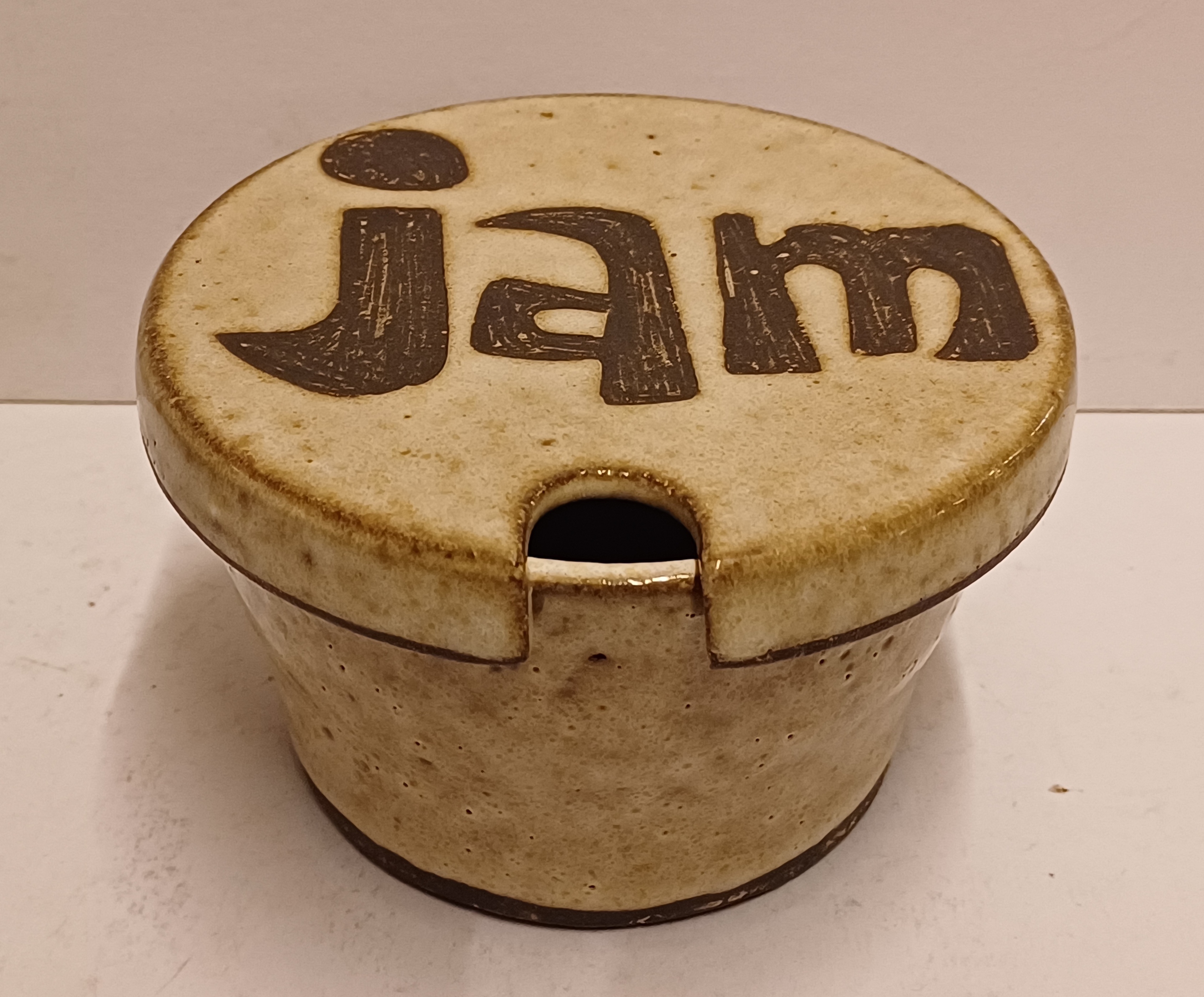 Earthenware round lidded box with the word "Jam" on the lid. Bottom with monogram.