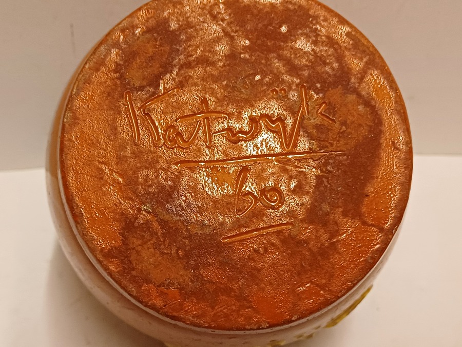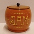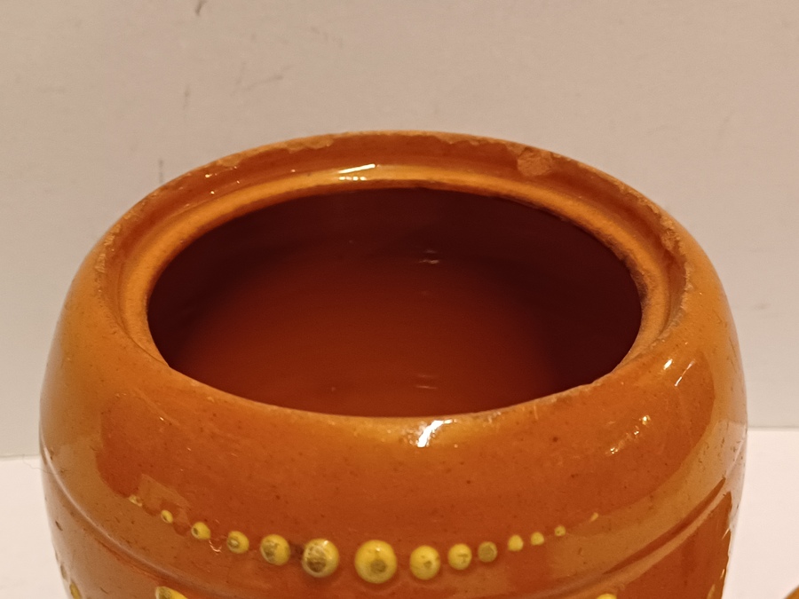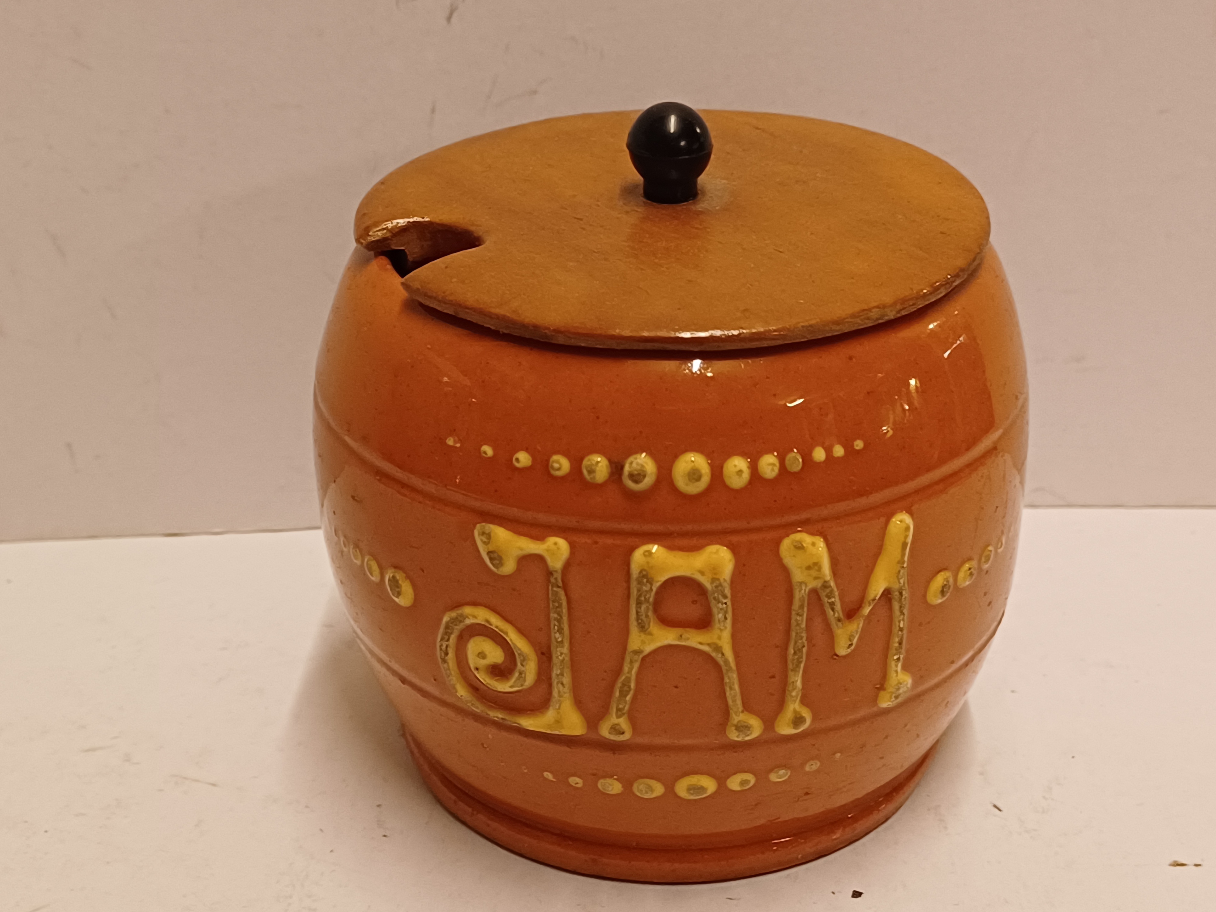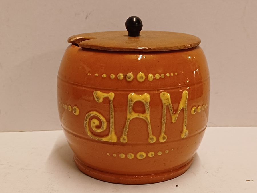 Earthenware jam pot with a wooden lid of a later date. Bottom with Katwijk signature.
