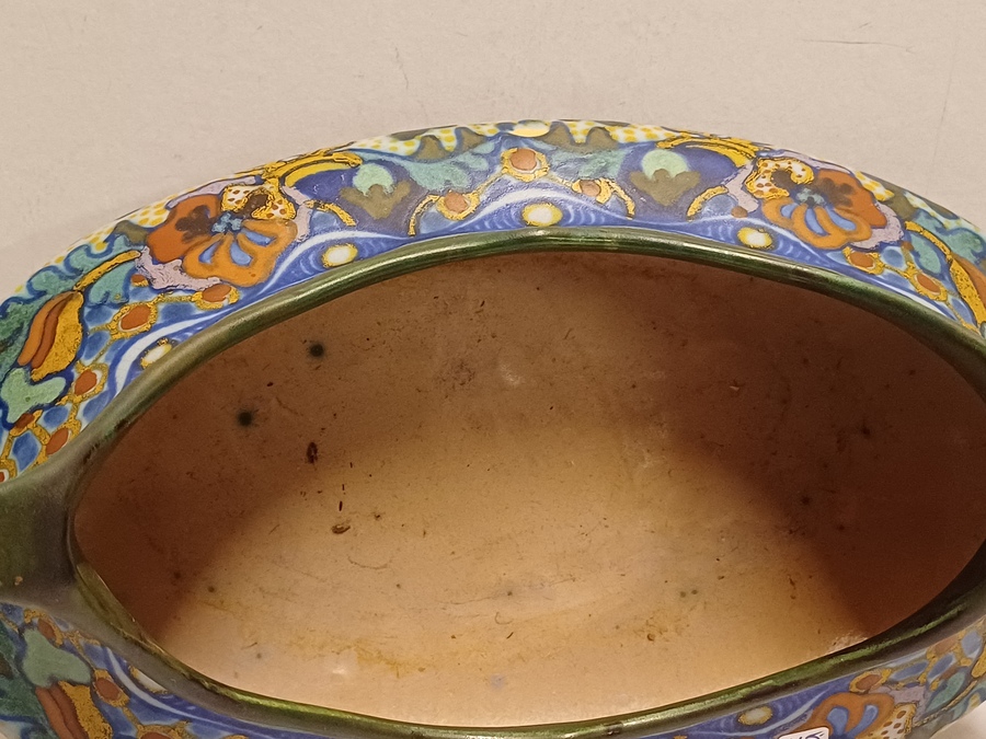 Platelen jardiniere met decore Corona. Onderzijde met fabrieksmerk decornaam en jaarletter.