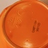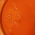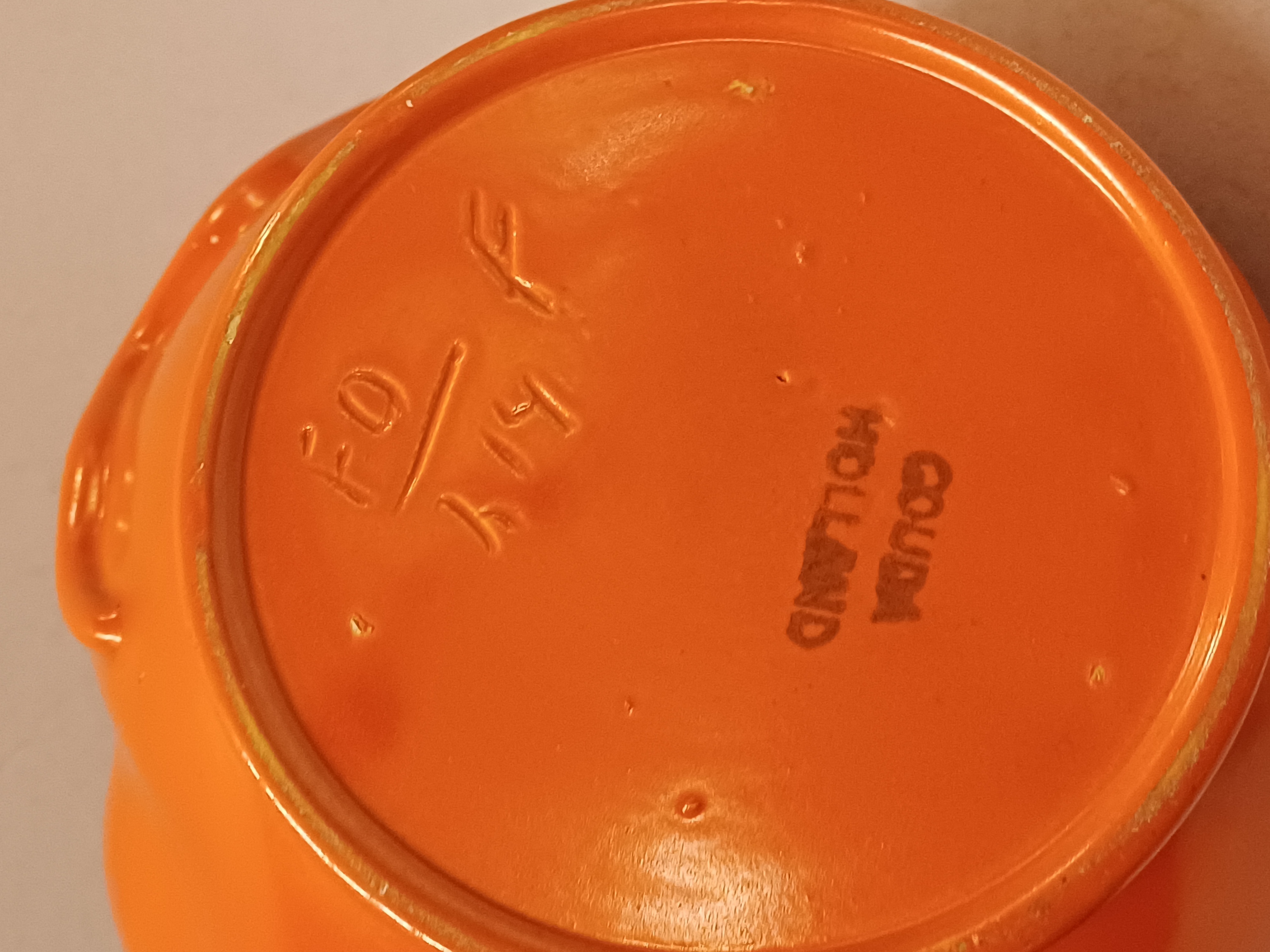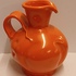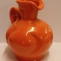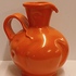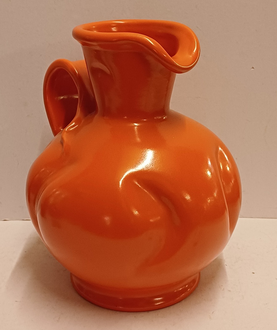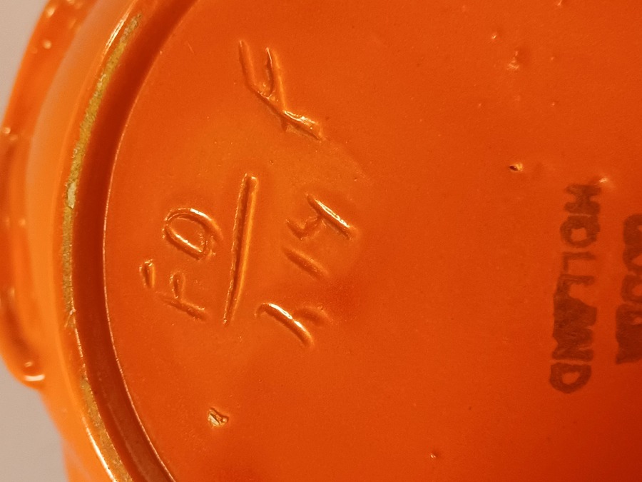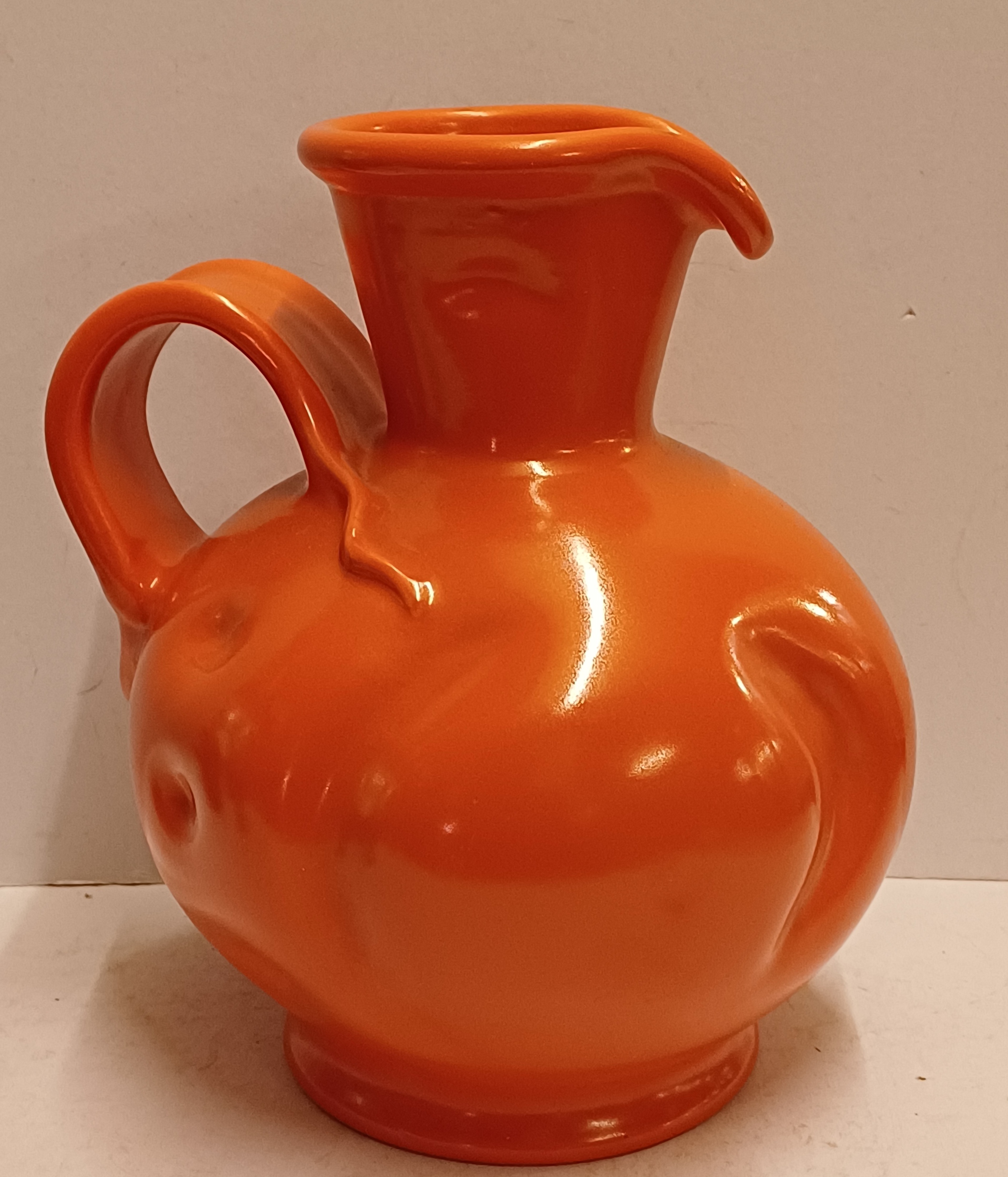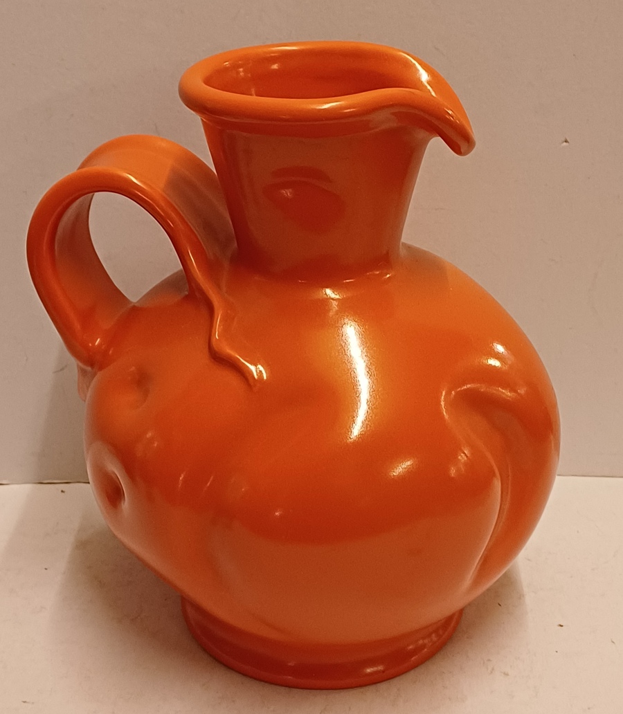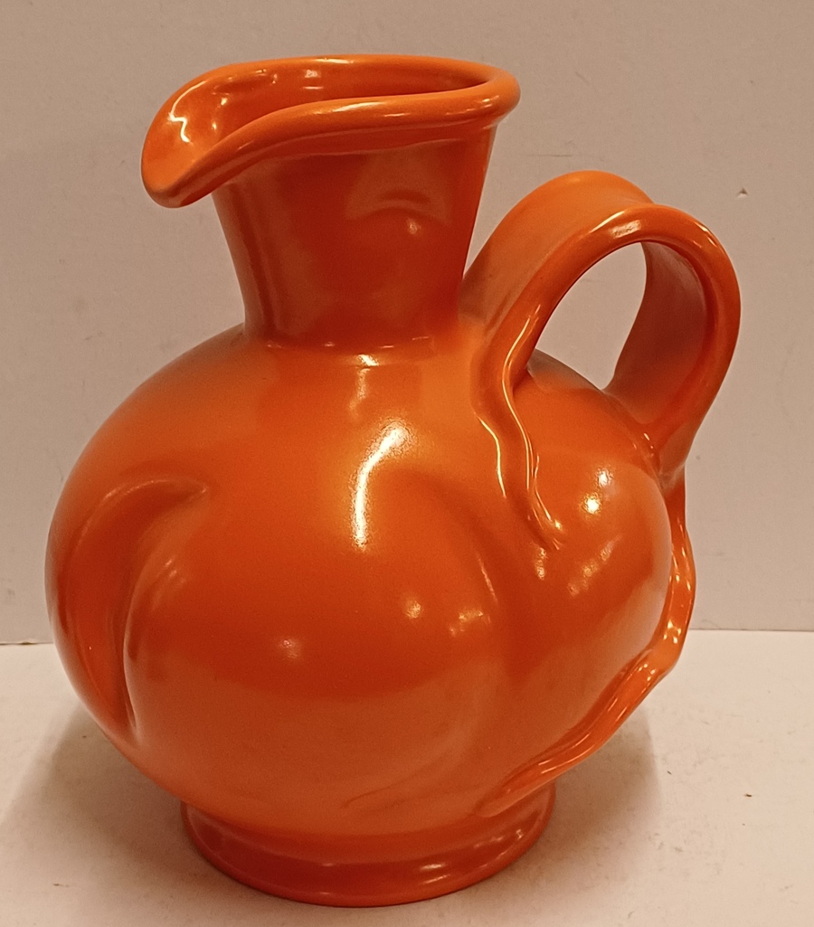Orange glazed earthenware pitcher with impressed forms and a wide handle. Designed by Fons Decker for Plateelbakkerij Zuid Holland. Bottom marked and numbered FO414.