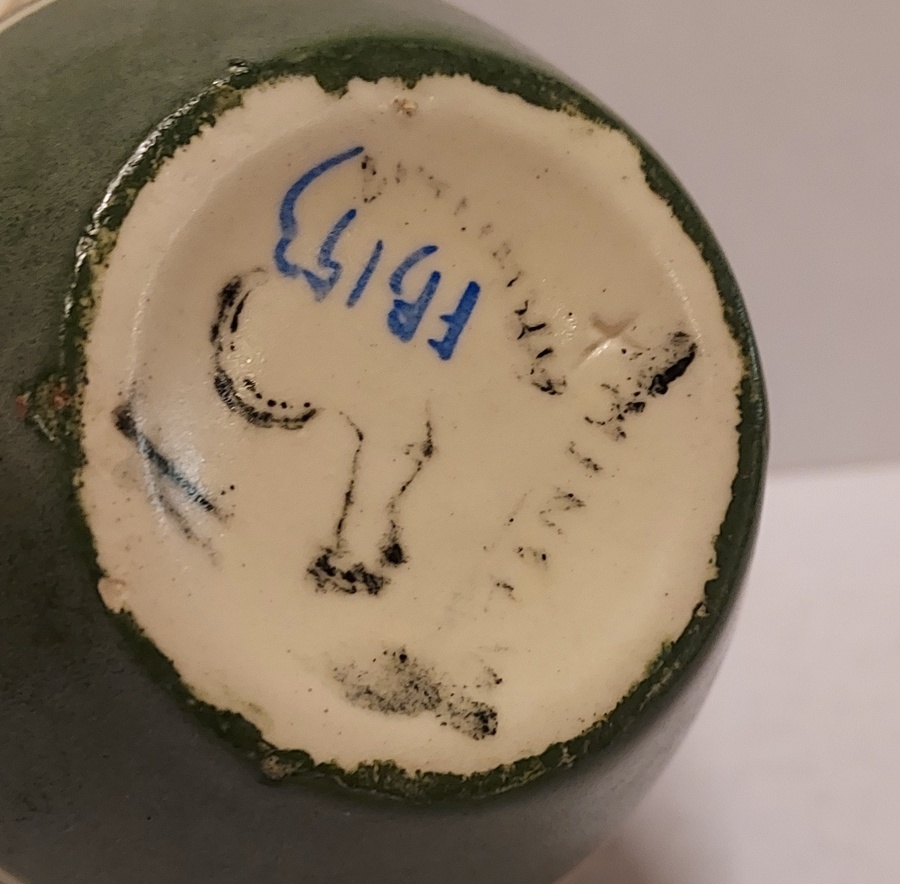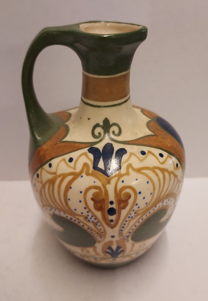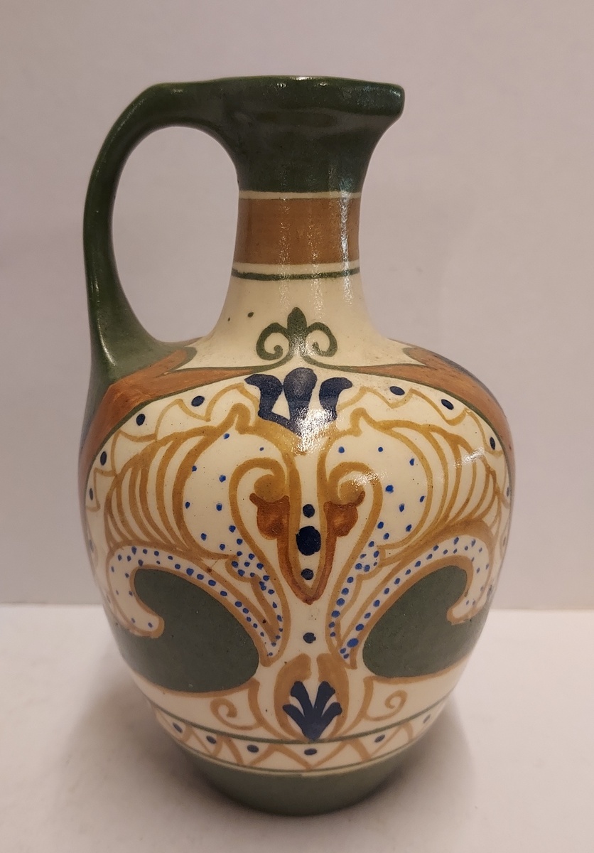 Faience pitcher with stylized Marantha decor. Bottom with factory mark and decor name.