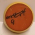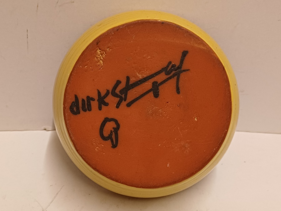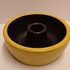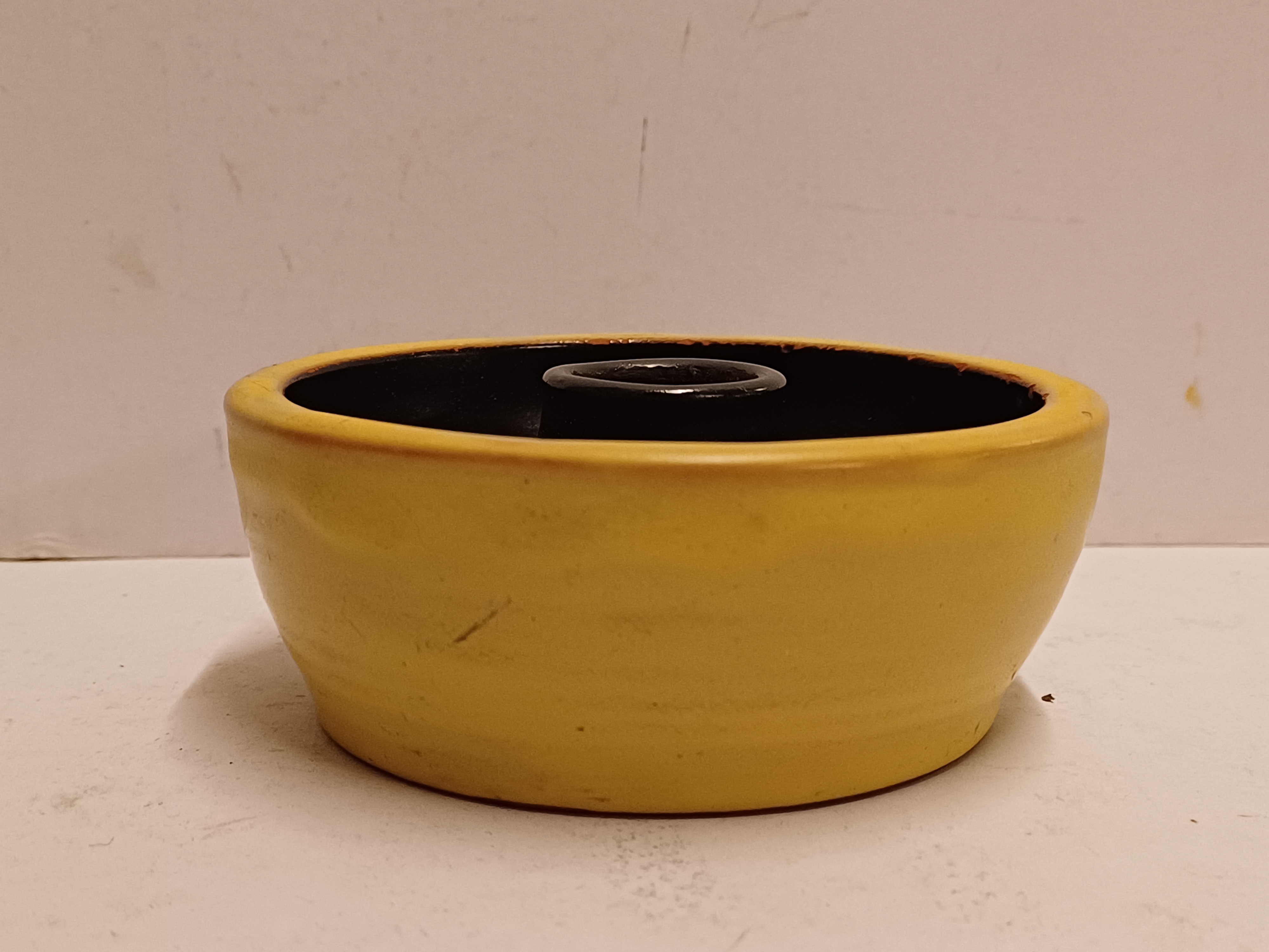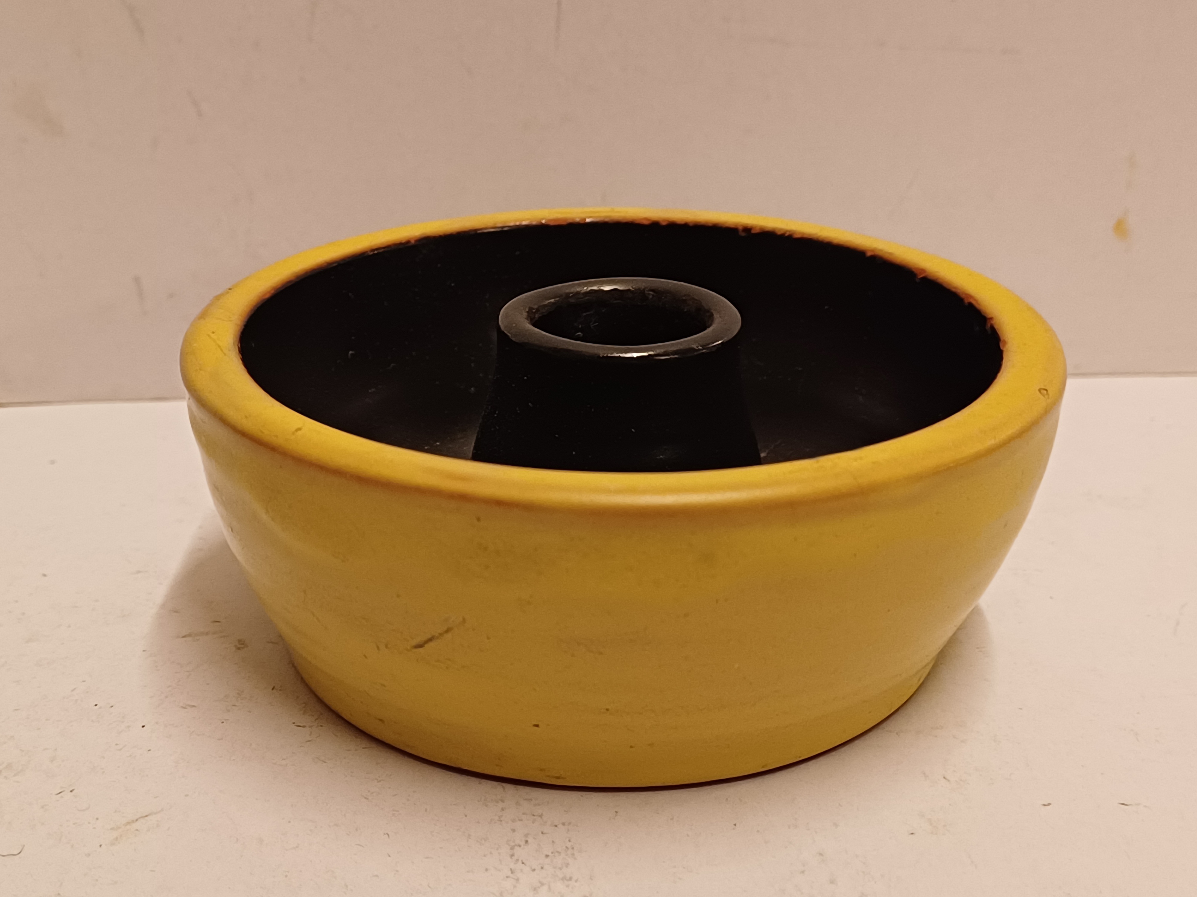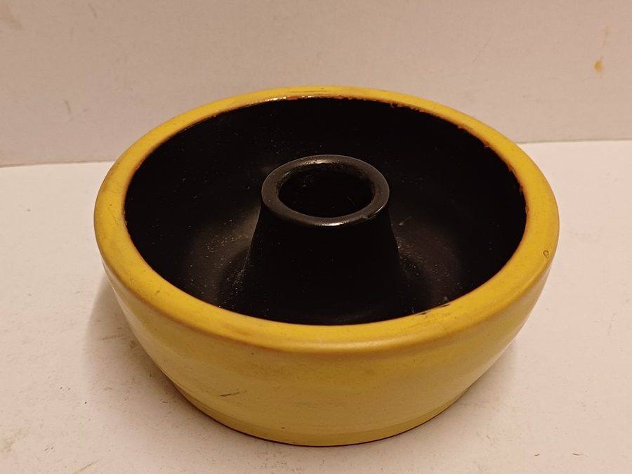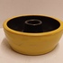 Earthenware candle holder with a black glazed interior and yellow exterior. Bottom signed.