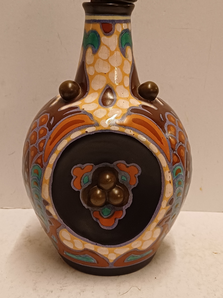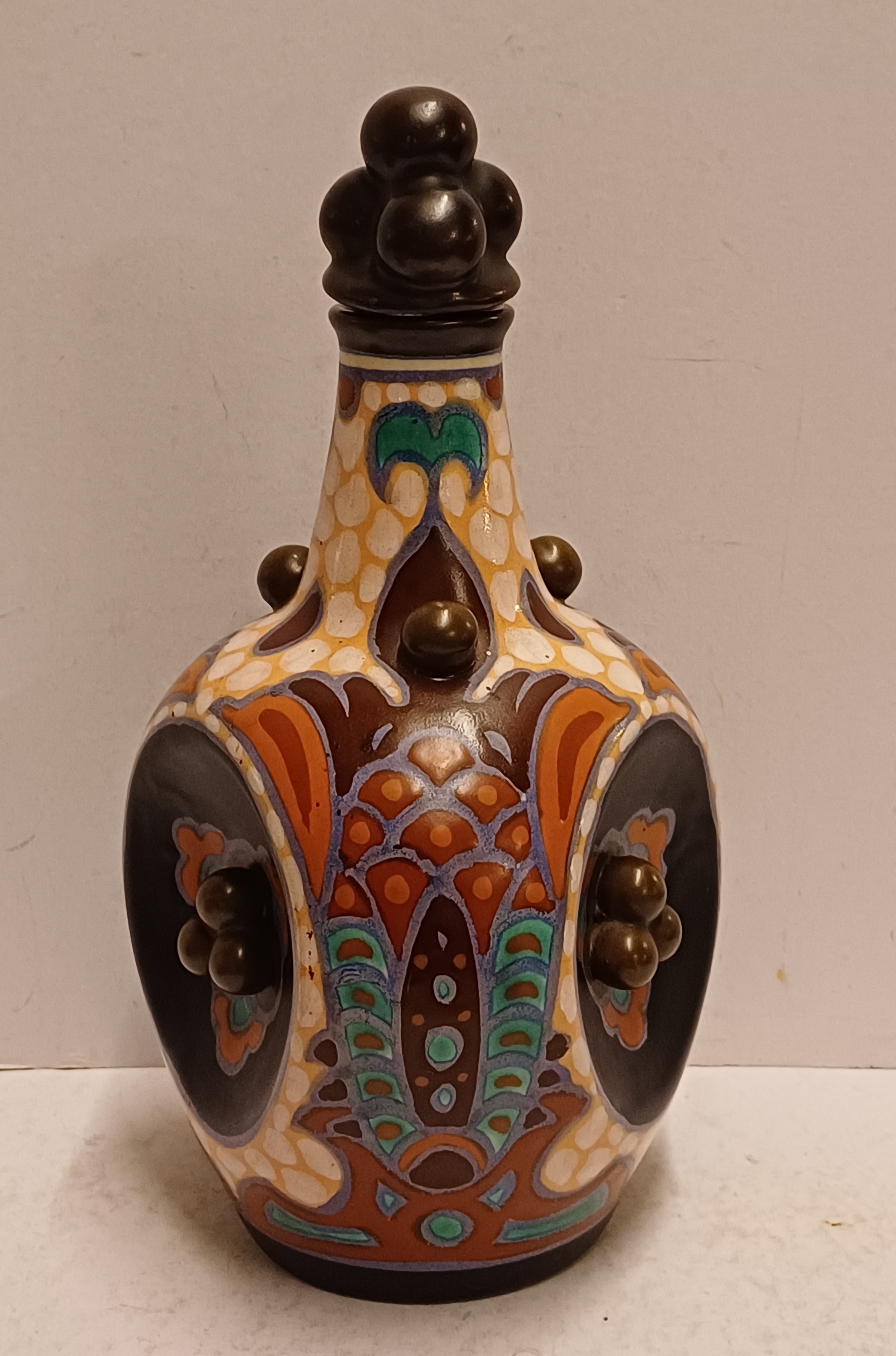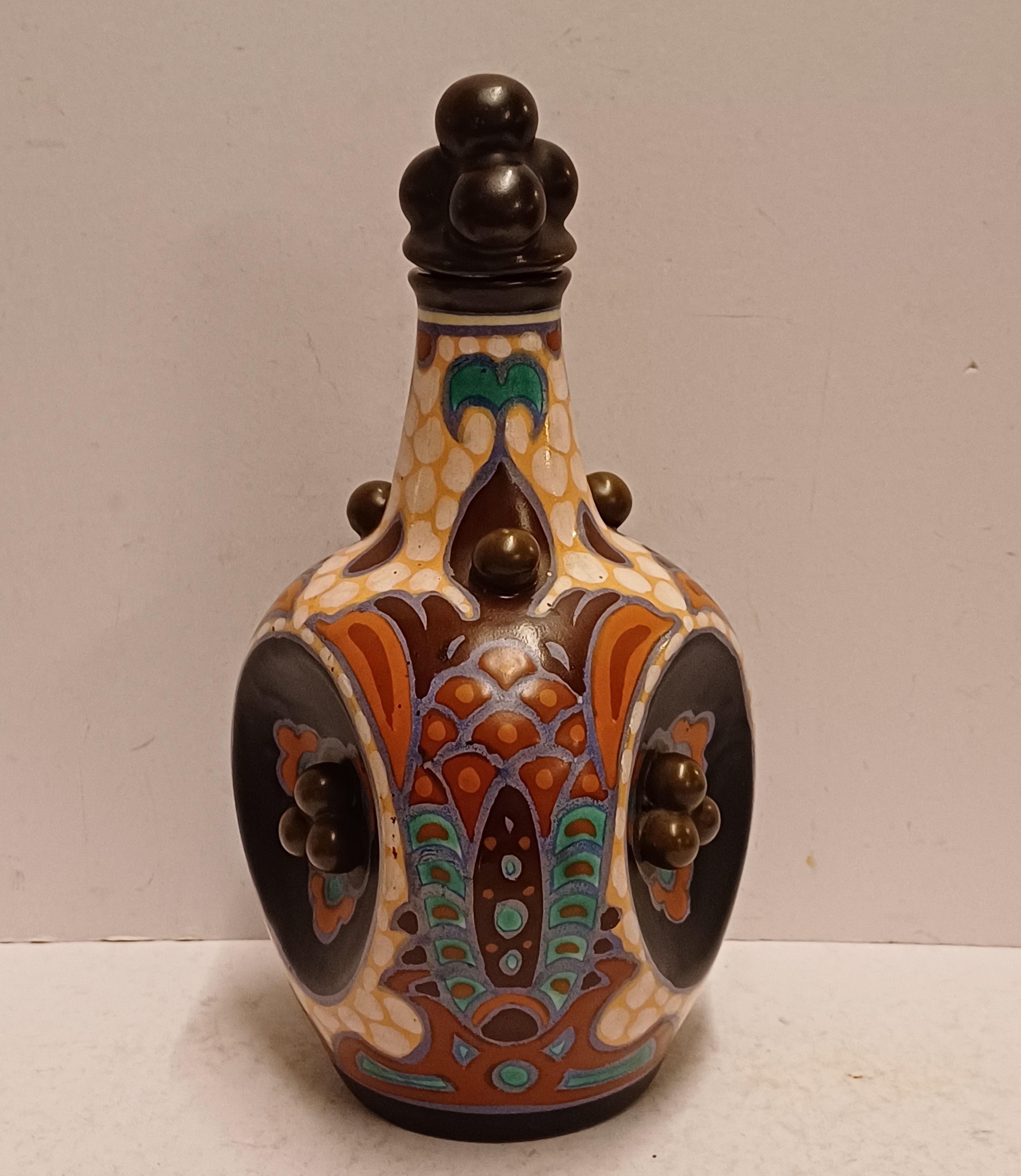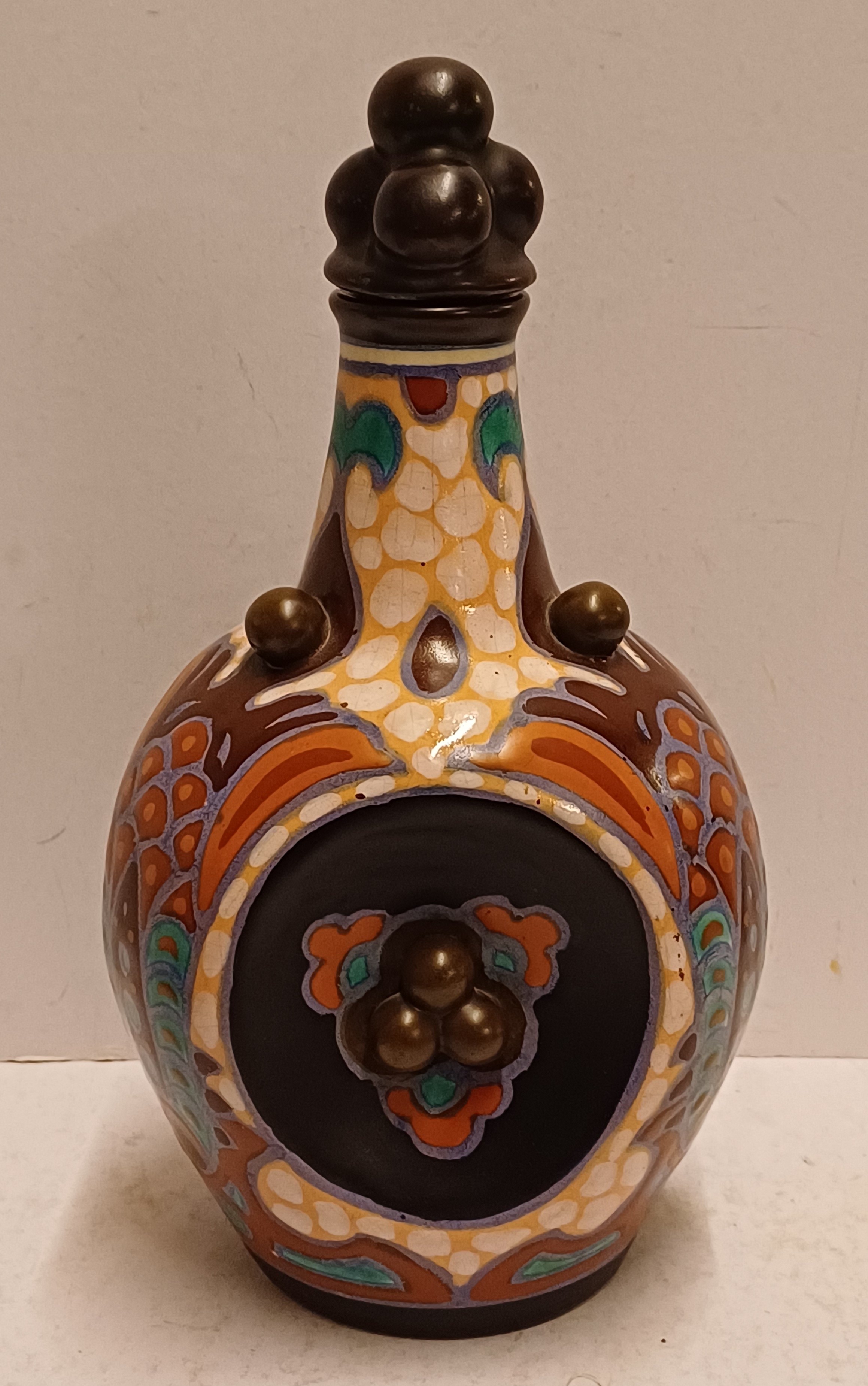 Plateln karaf met stop, met gestileerd decor Reamur op zwart fond. Onderzijde met fabrieksmerk