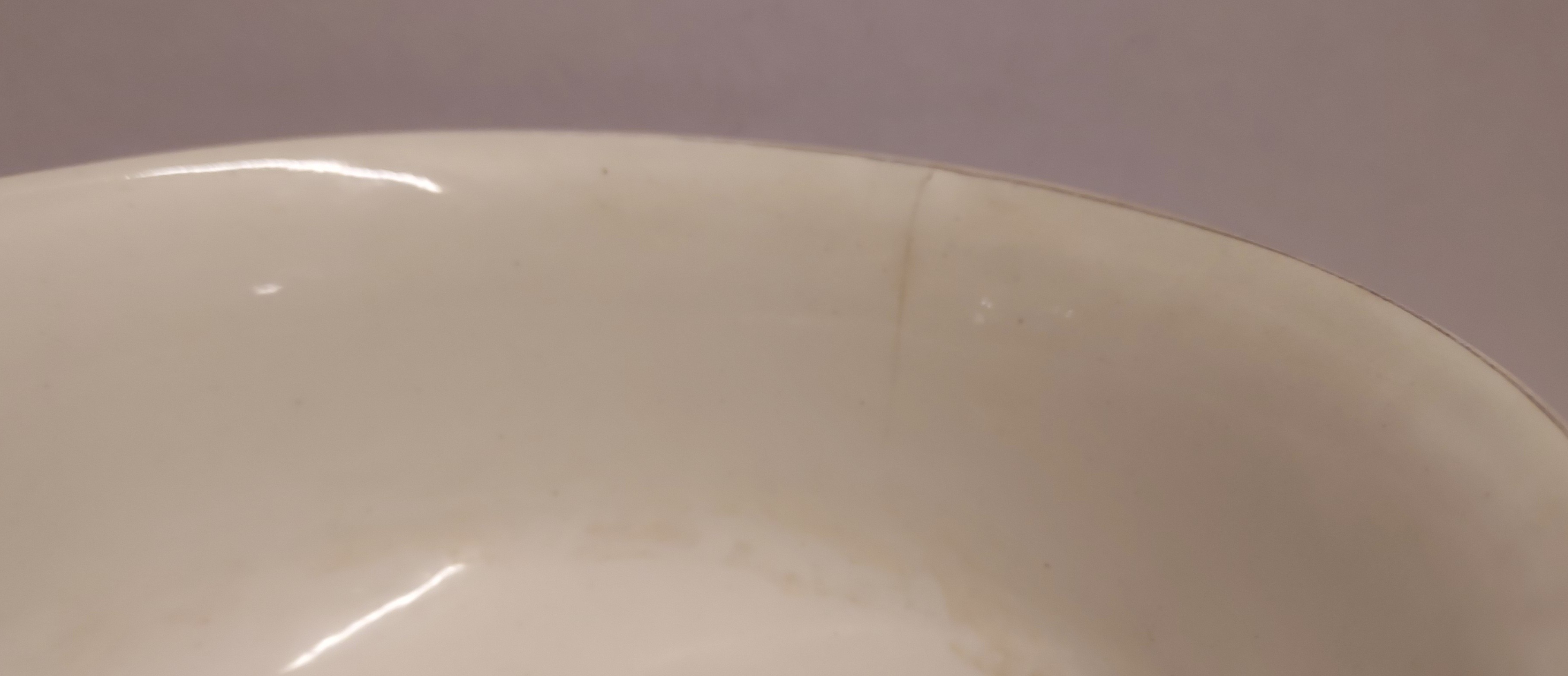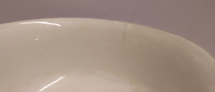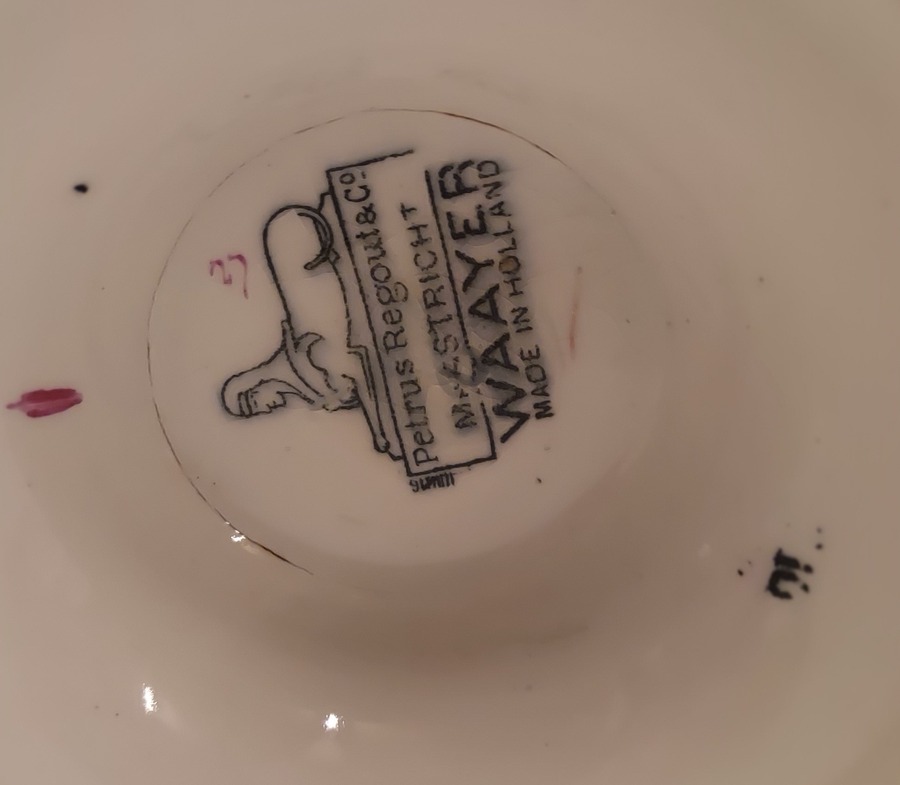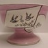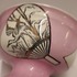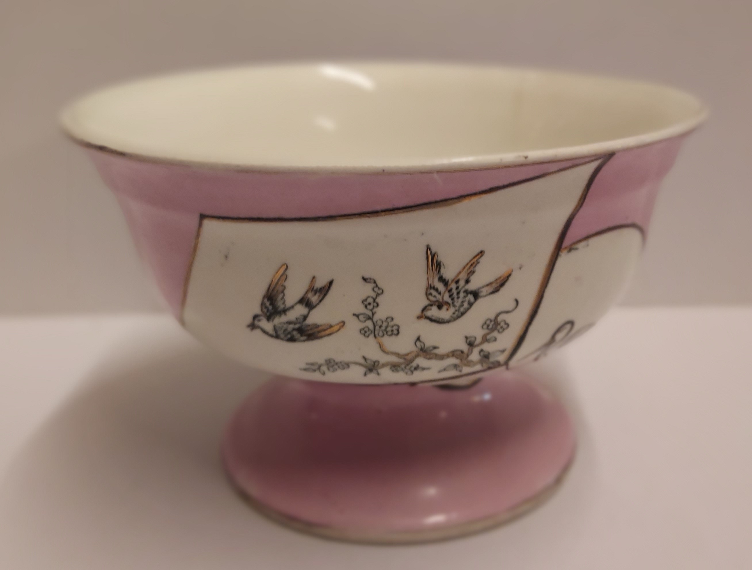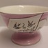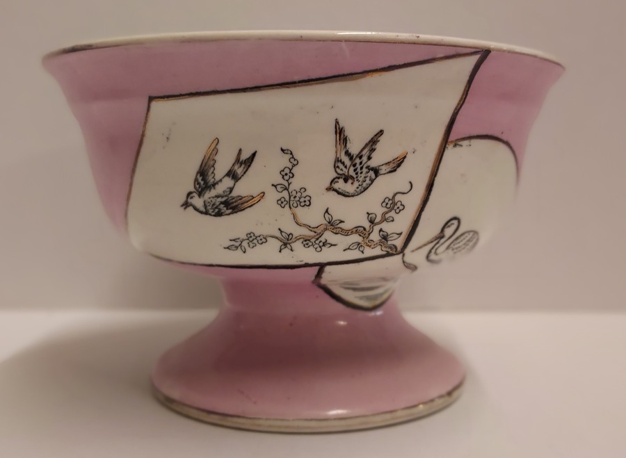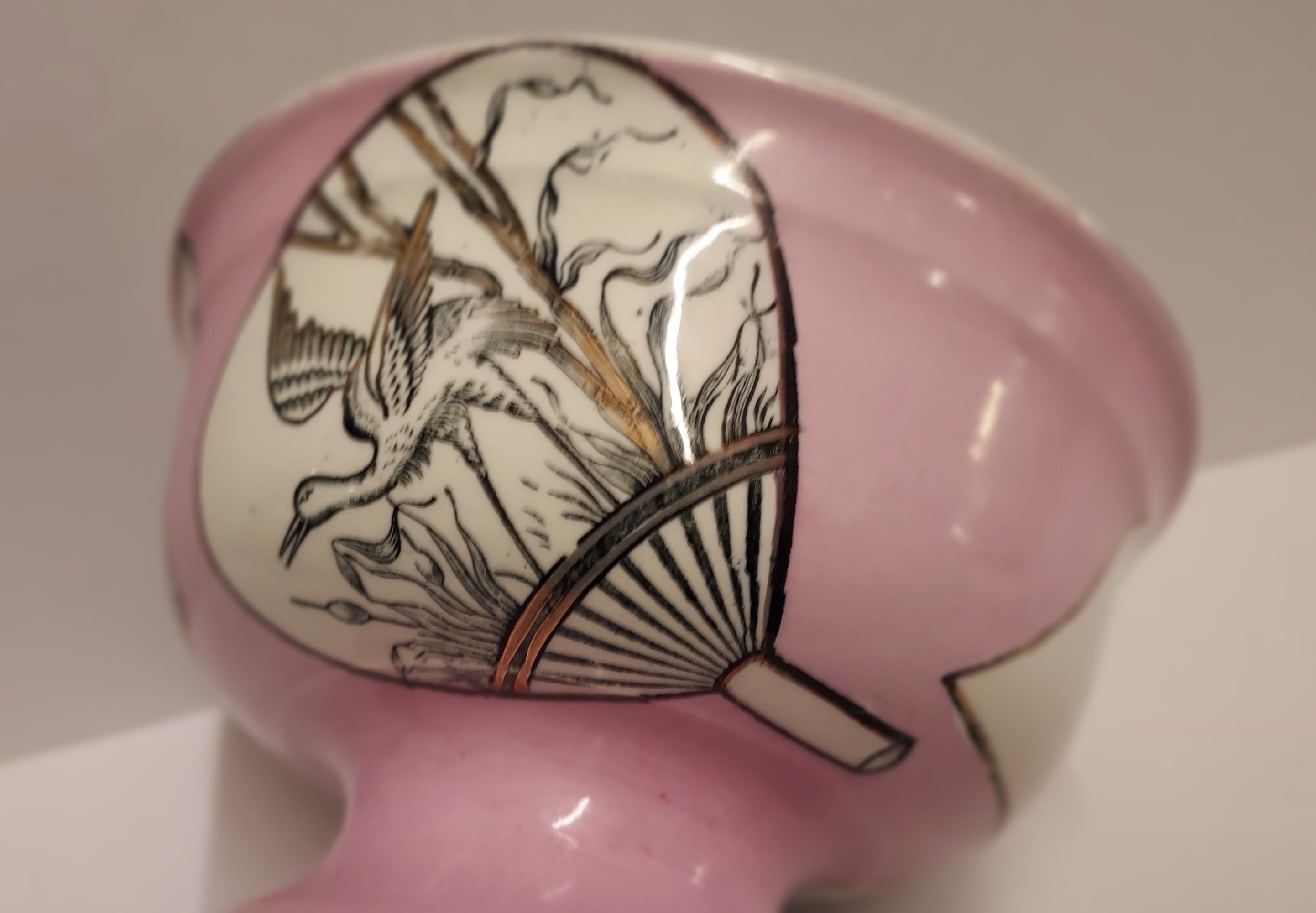 Black transfer decor with pink overglaze. Depictions of birds in fans. Bottom with factory mark.