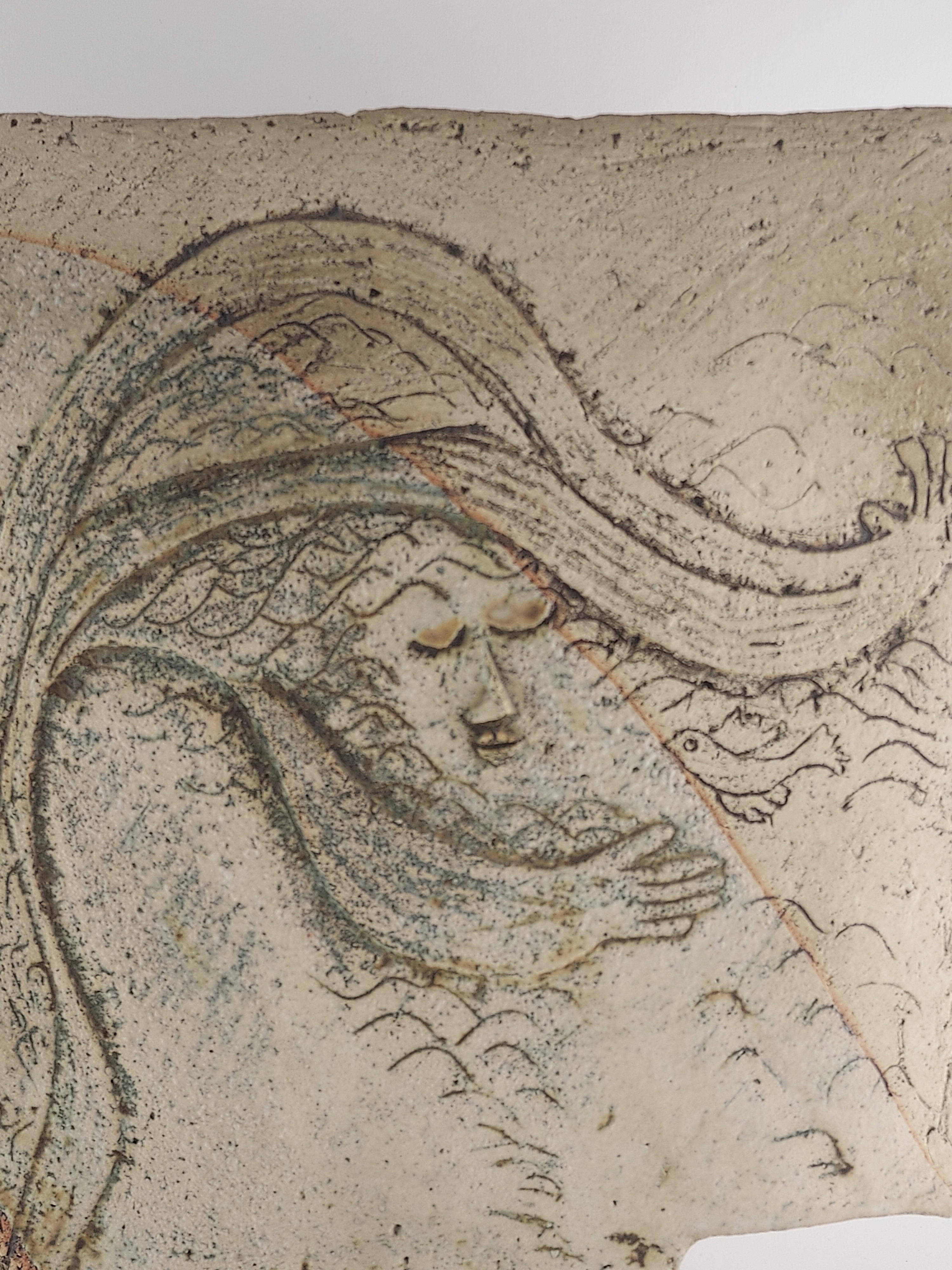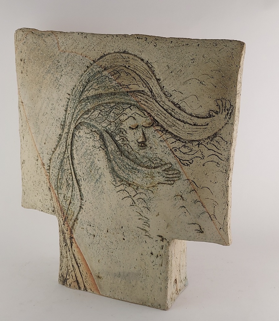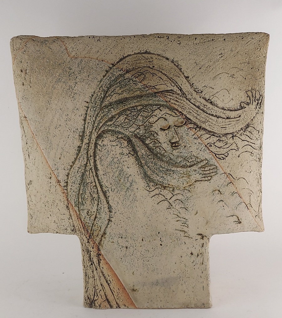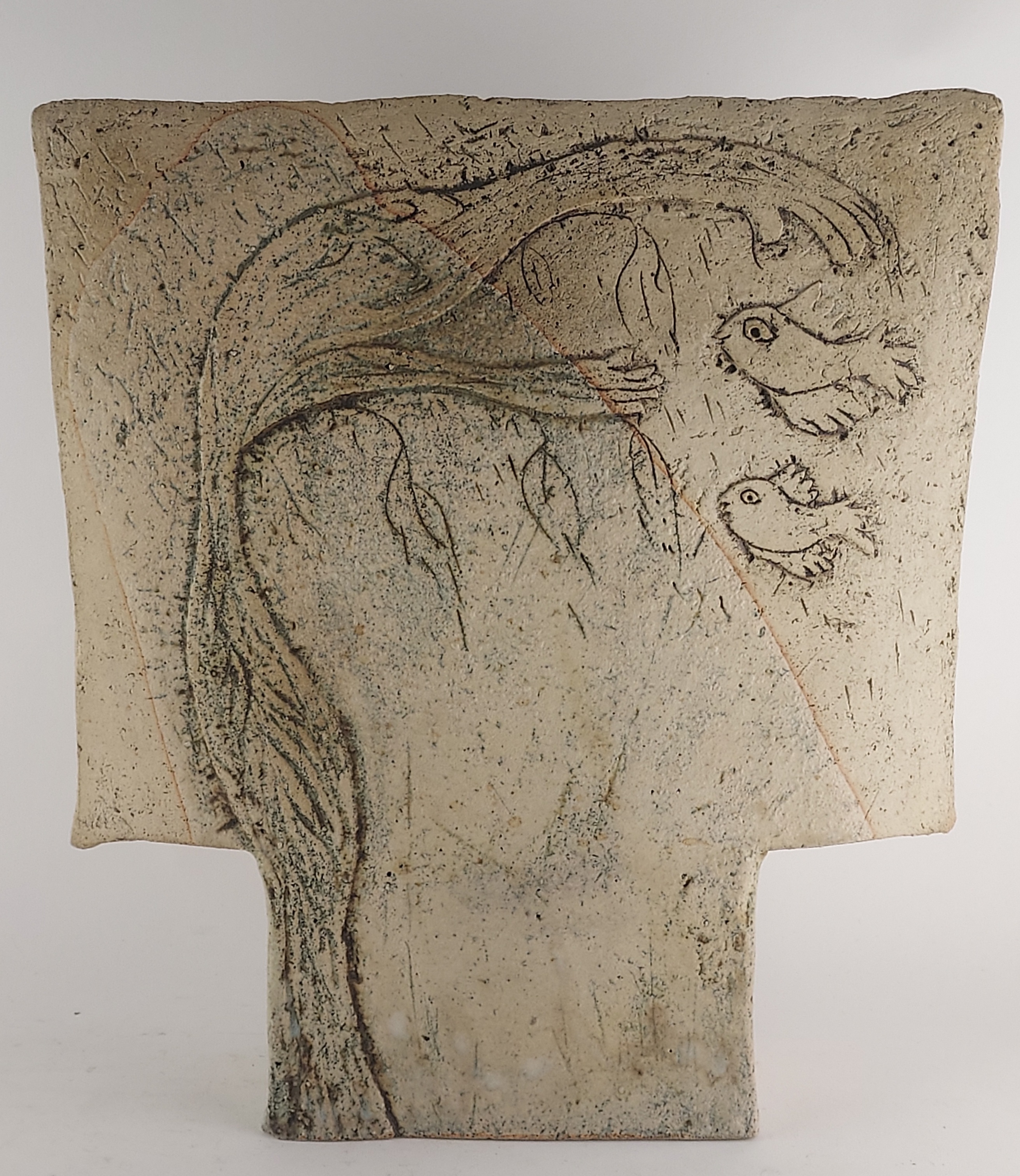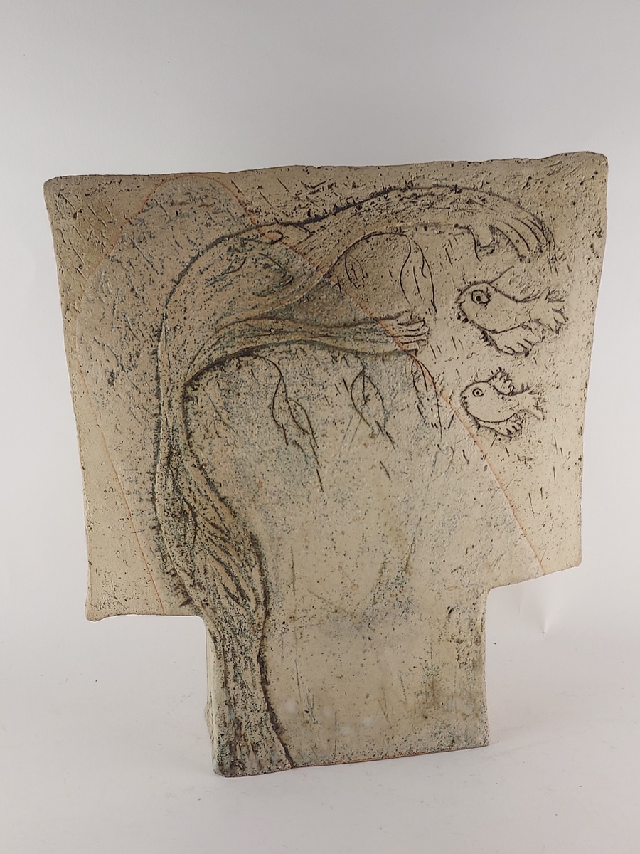 Decorated with a figure and on the reverse a figure with 2 birds. Signed on the side.
