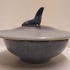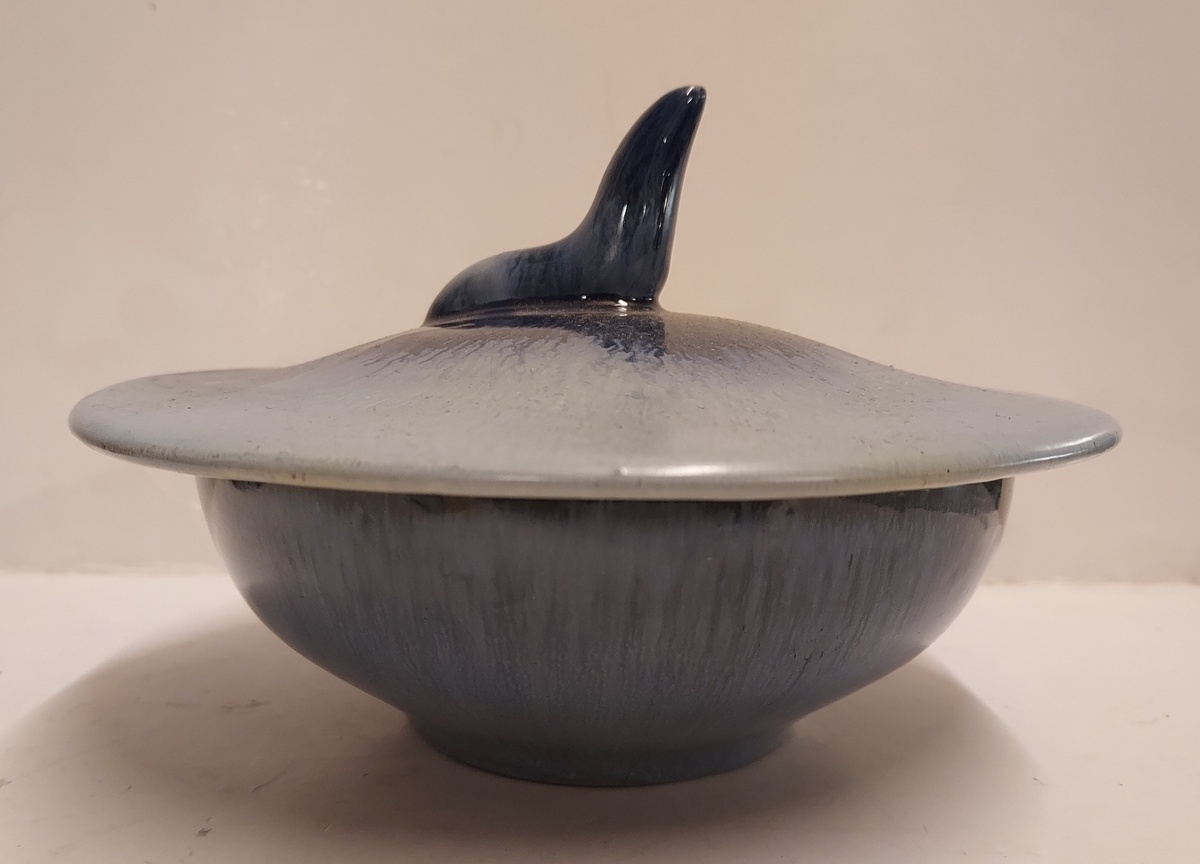 With blue flowing glaze, the lid topped with a stylized sea lion. Not signed.