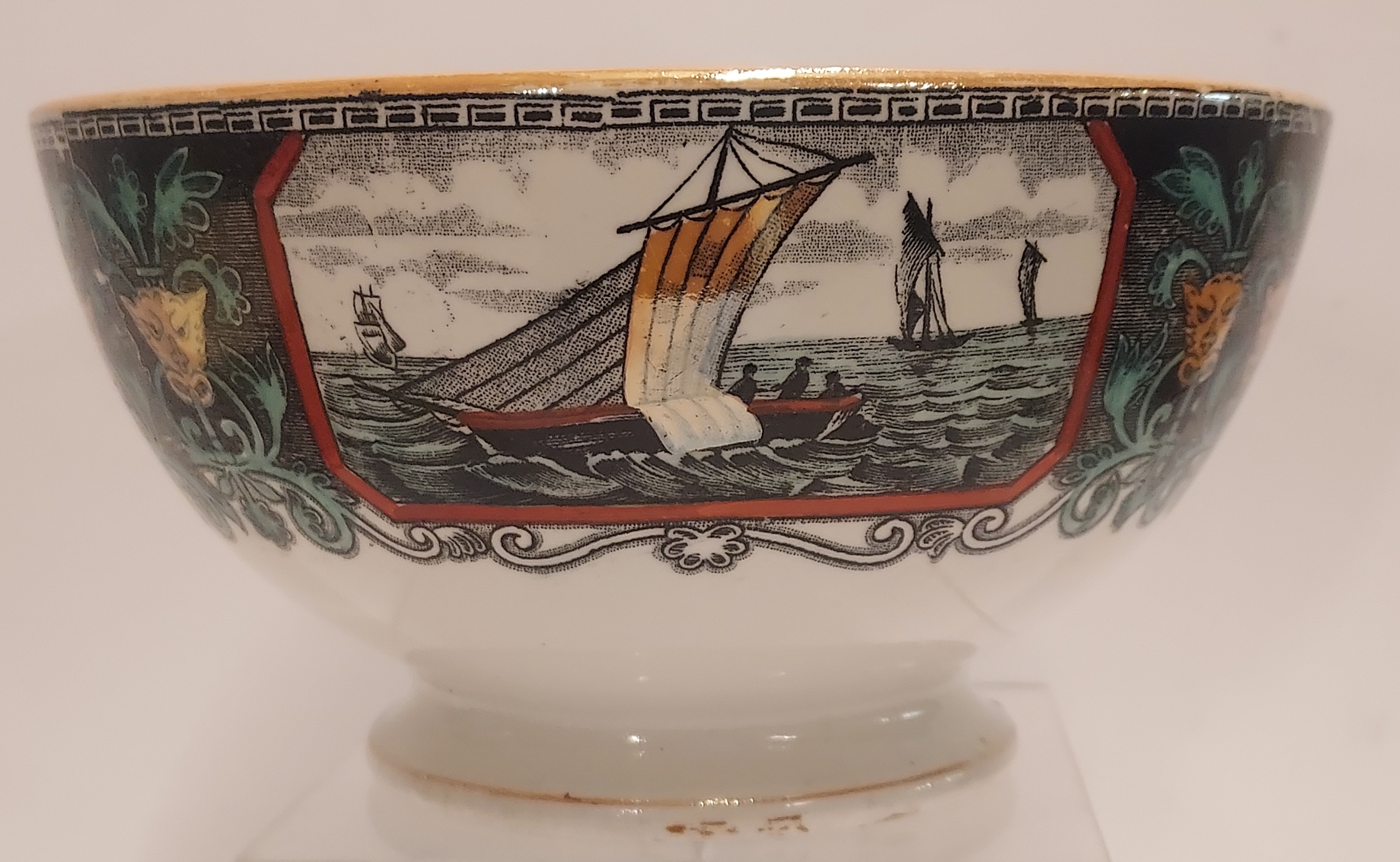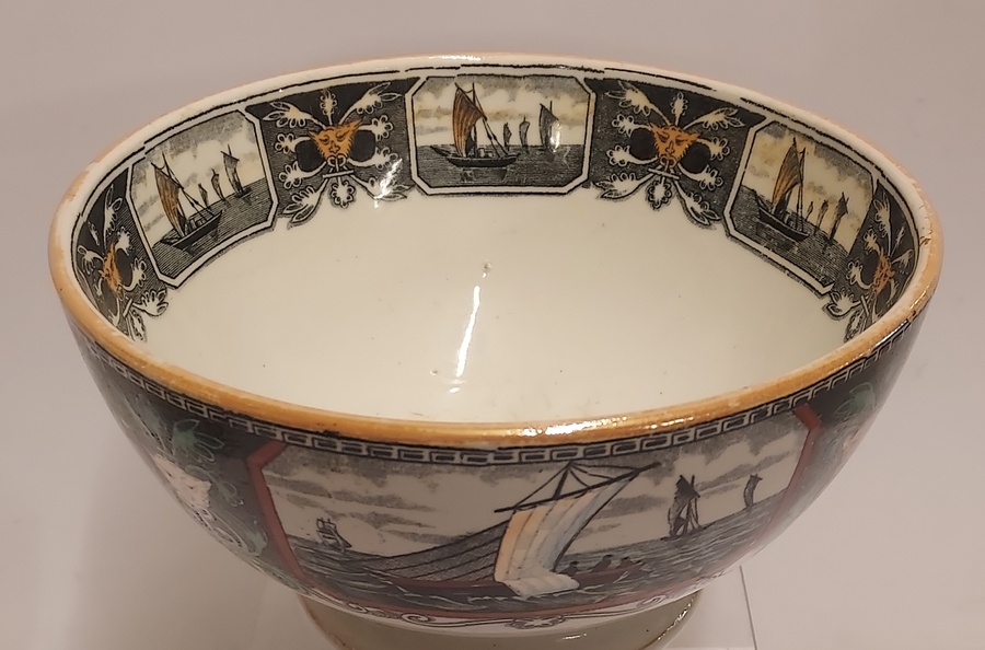 Medium-sized bowl with marine transfer decor. Bottom with factory mark.