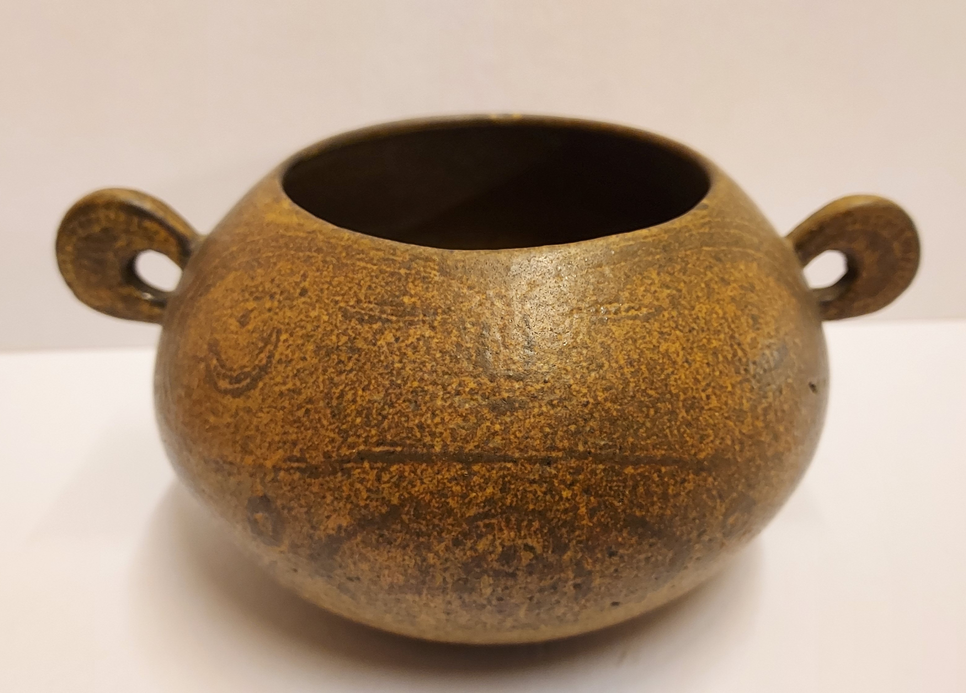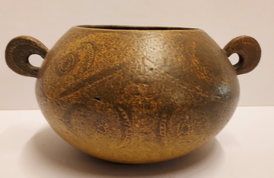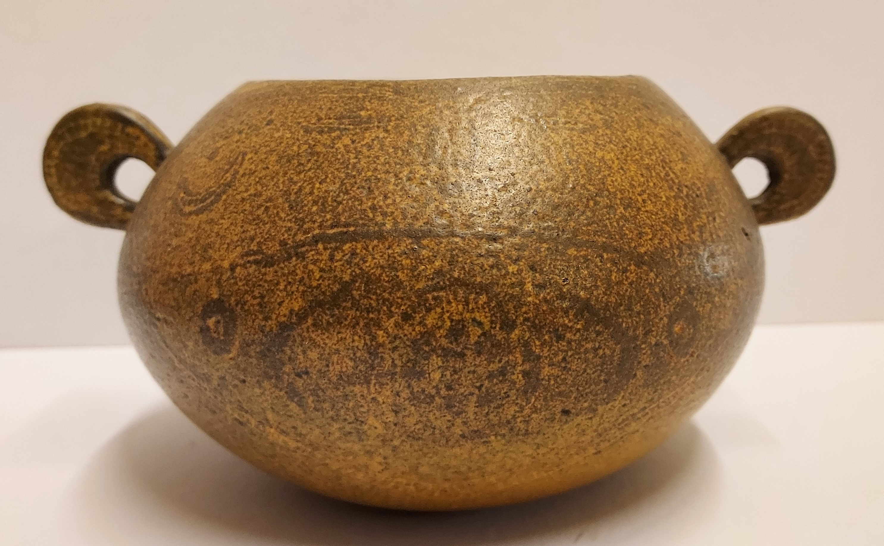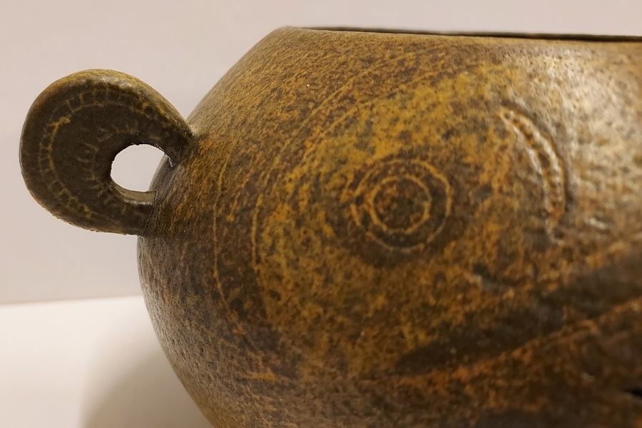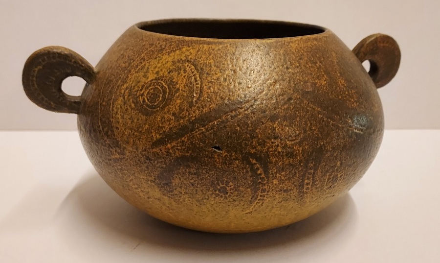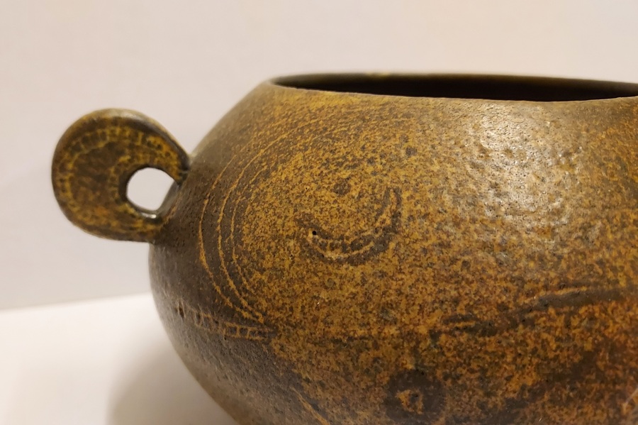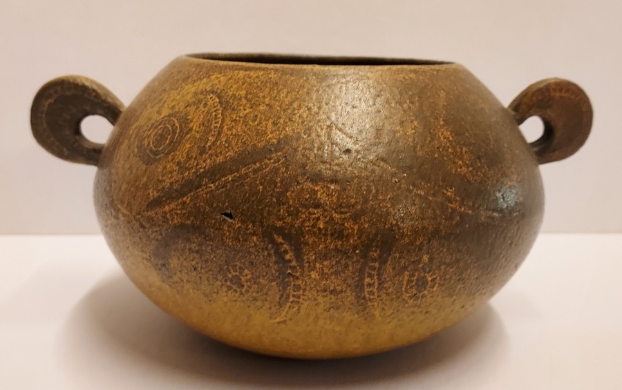 Low hand-shaped bowl with 2 round handles by Natascha Zaludova with engraved decoration by Lies Cosijn. Produced by the Experimental Department of Porceleyne Fles in 1959. Bottom marked with factory stamps NZ 67 & CL377. From the J.W.N. van Agterbergh collection.