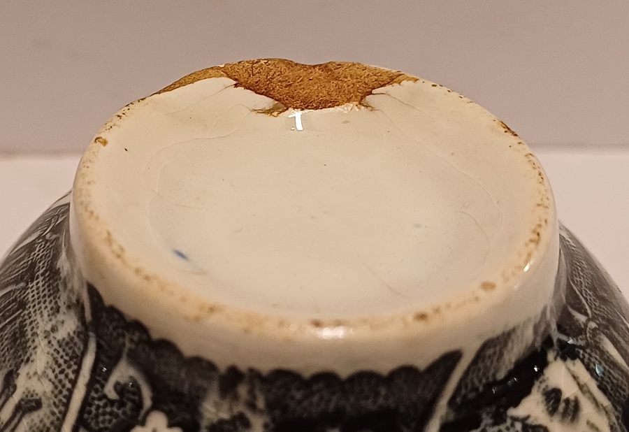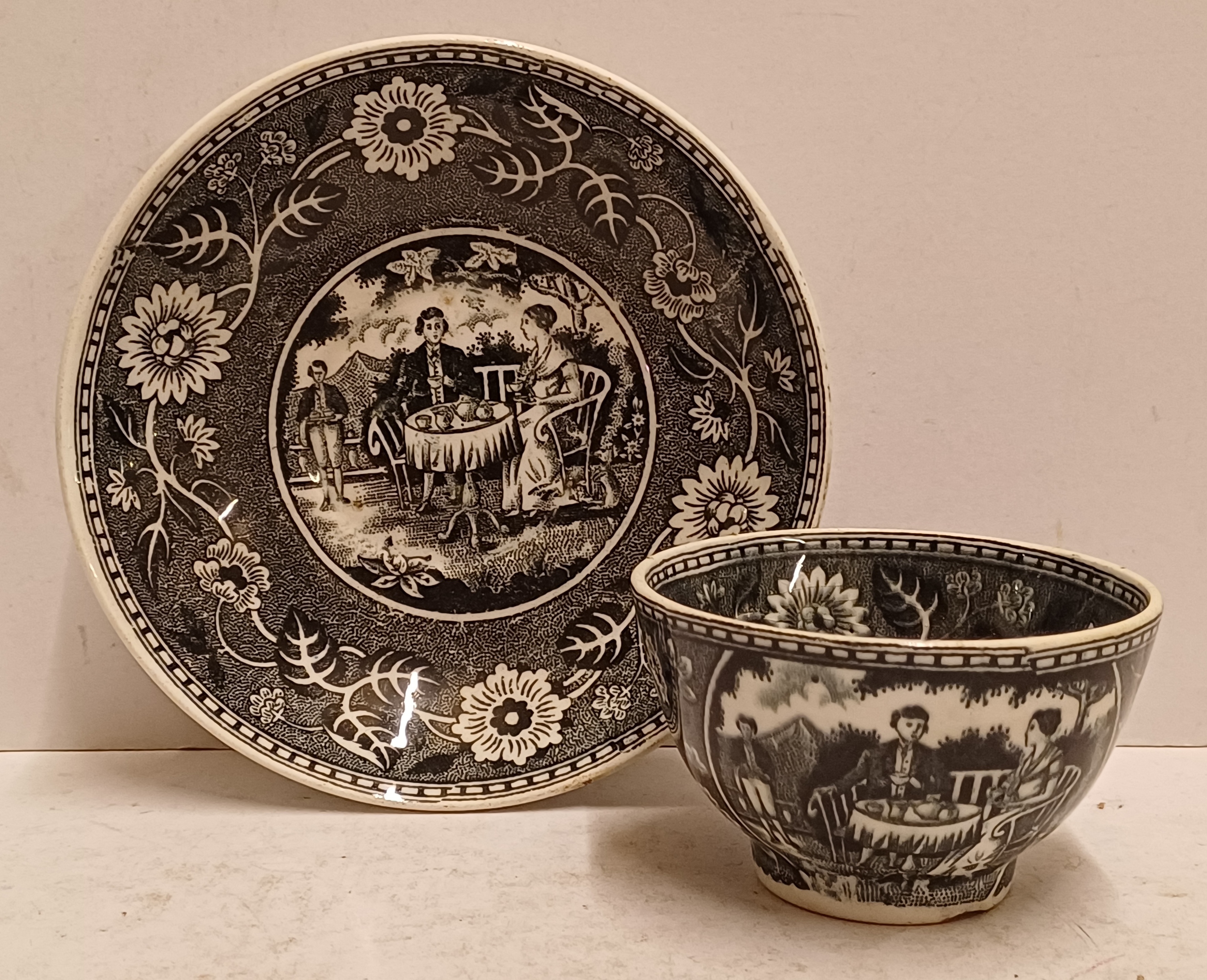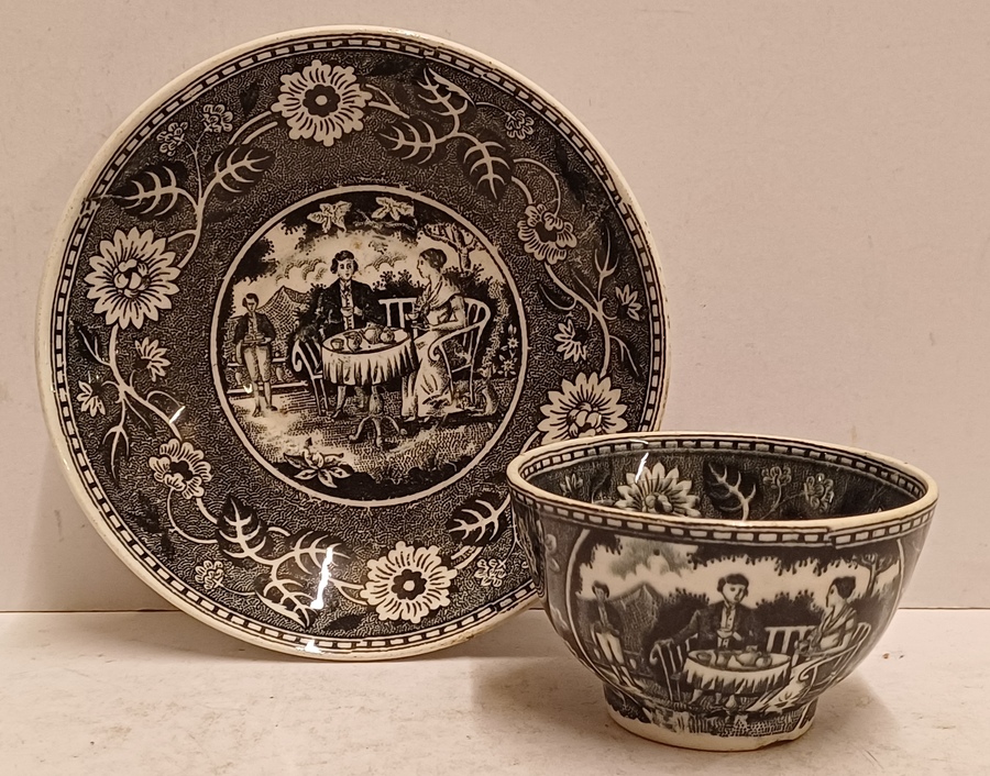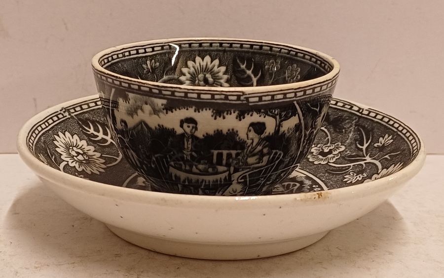 Cup and saucer with black transfer decor Tea Drinker. Bottom with factory mark.