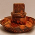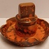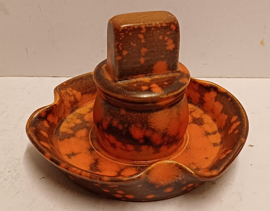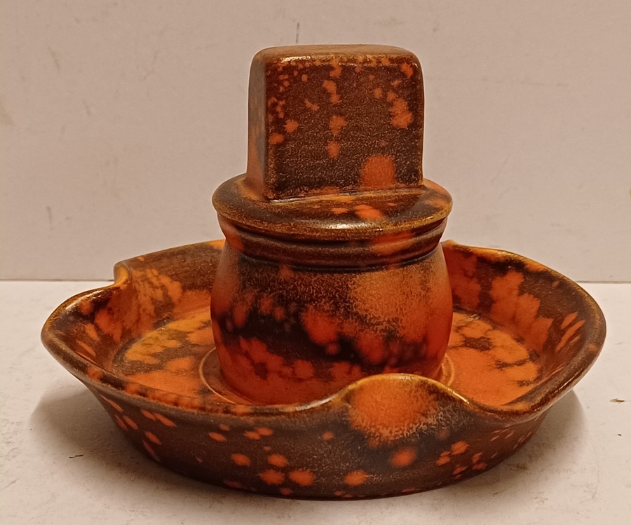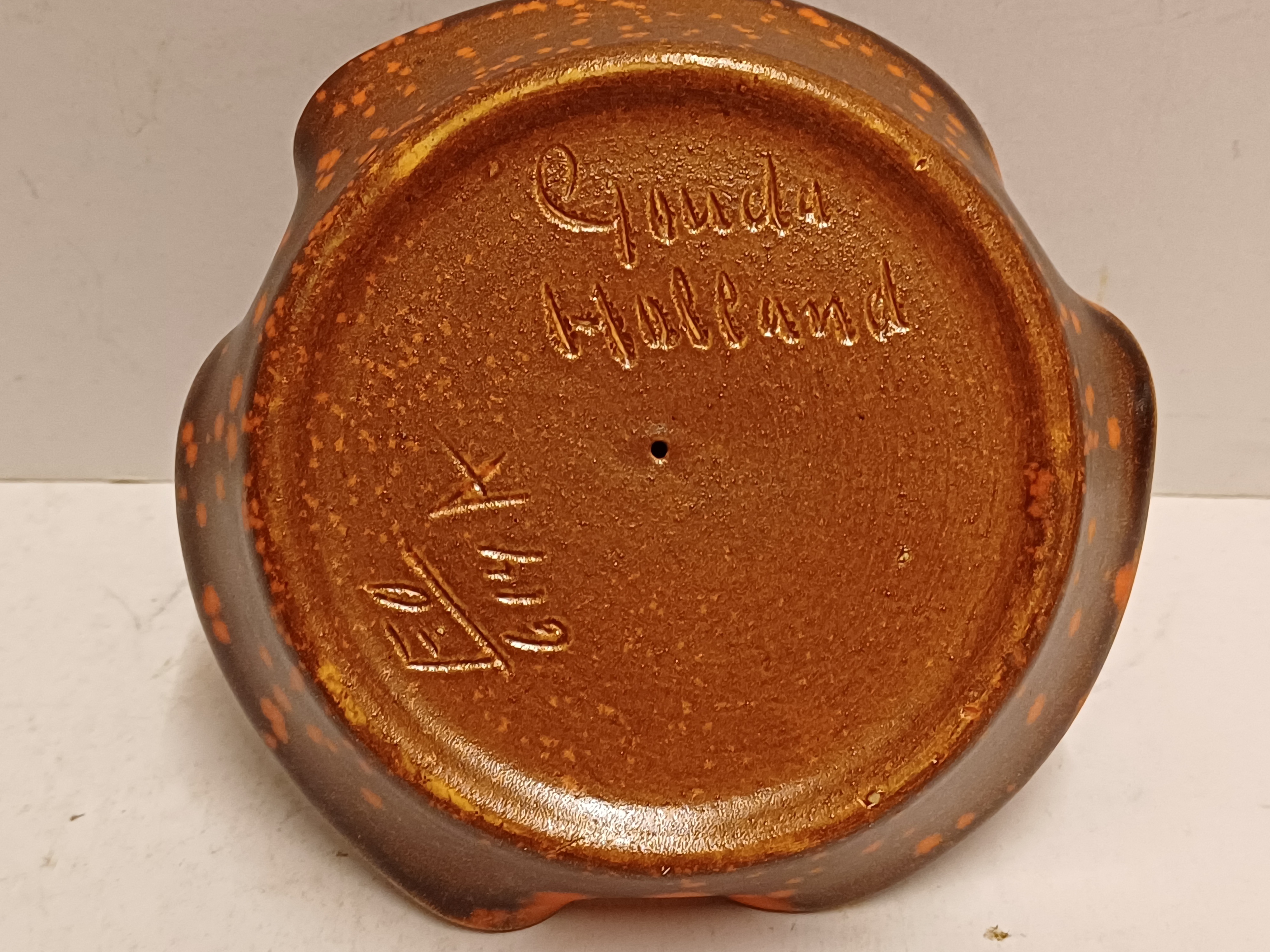 Earthenware matchstick holder with orange speckled glaze. Made by Plateelbakkerij Zuid-Holland, bottom marked and numbered.