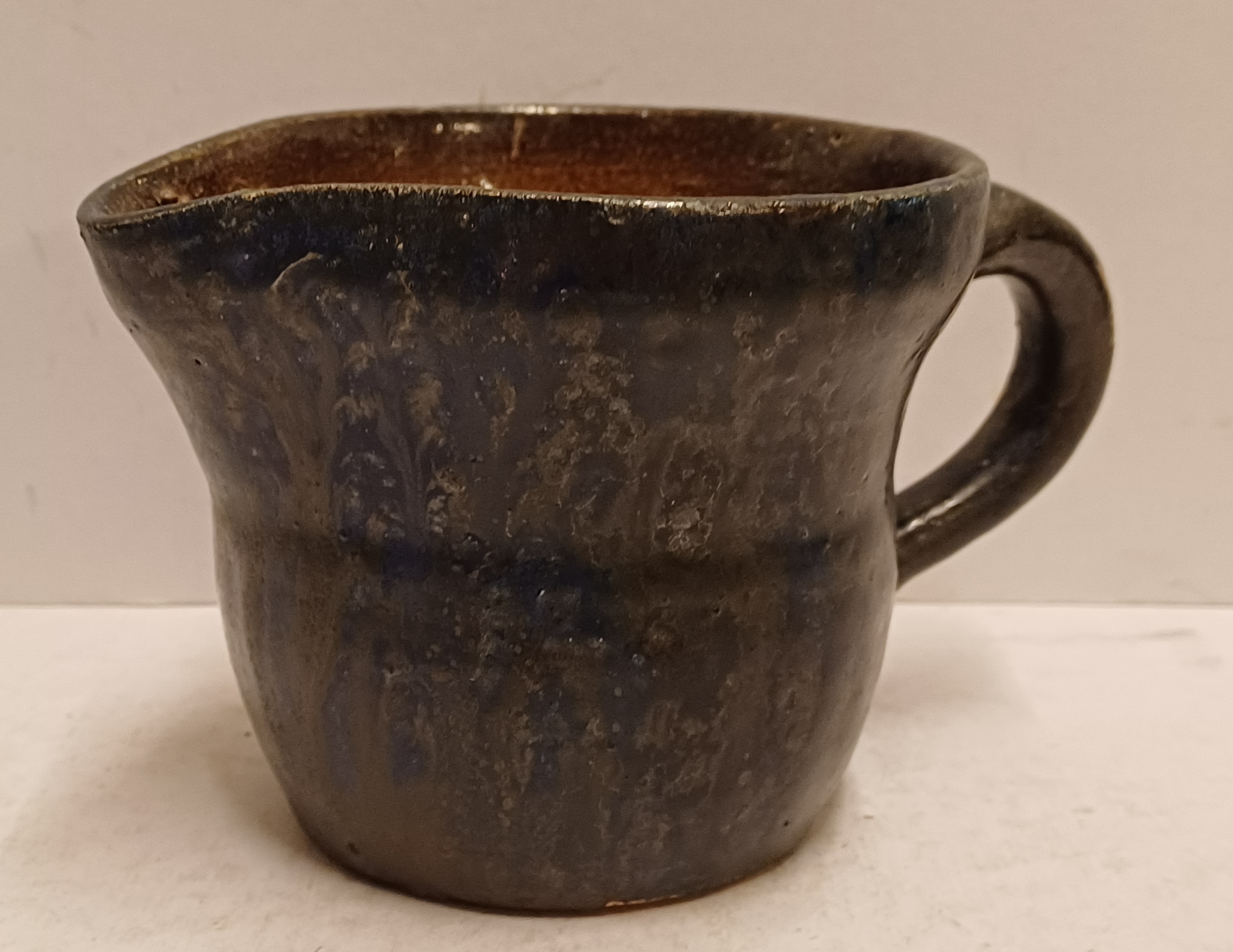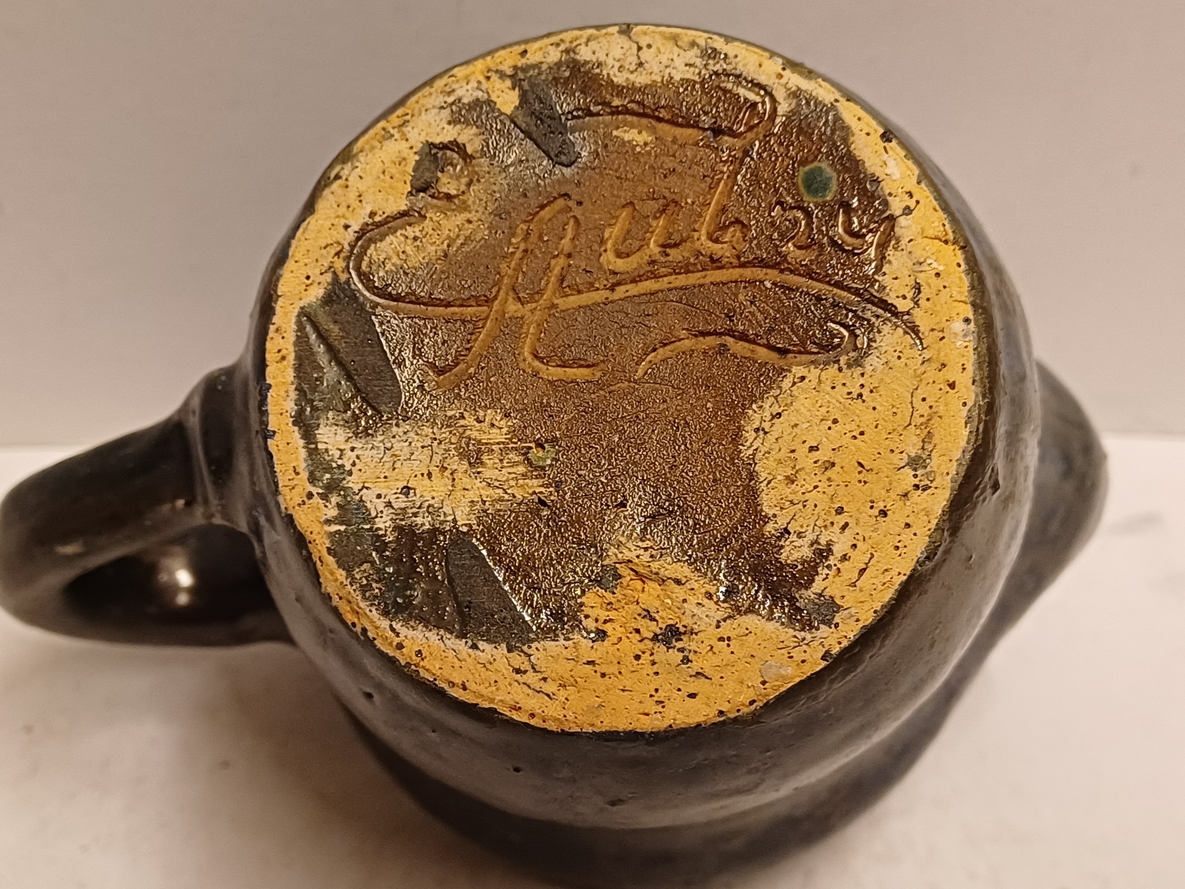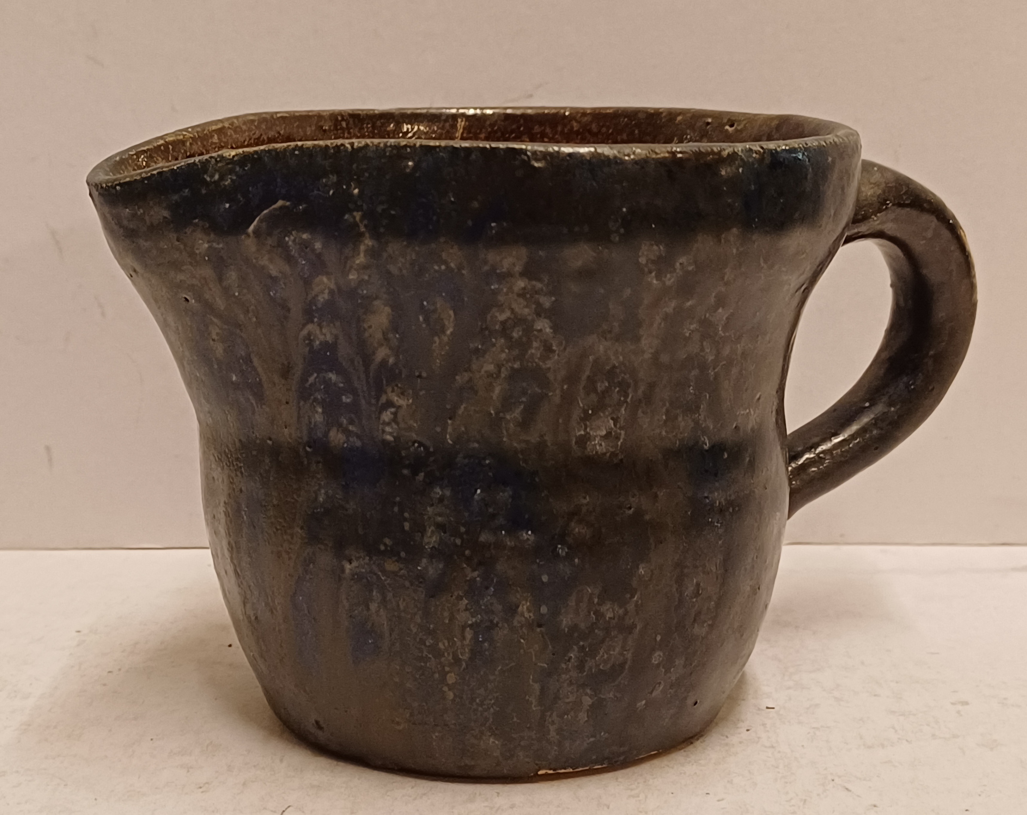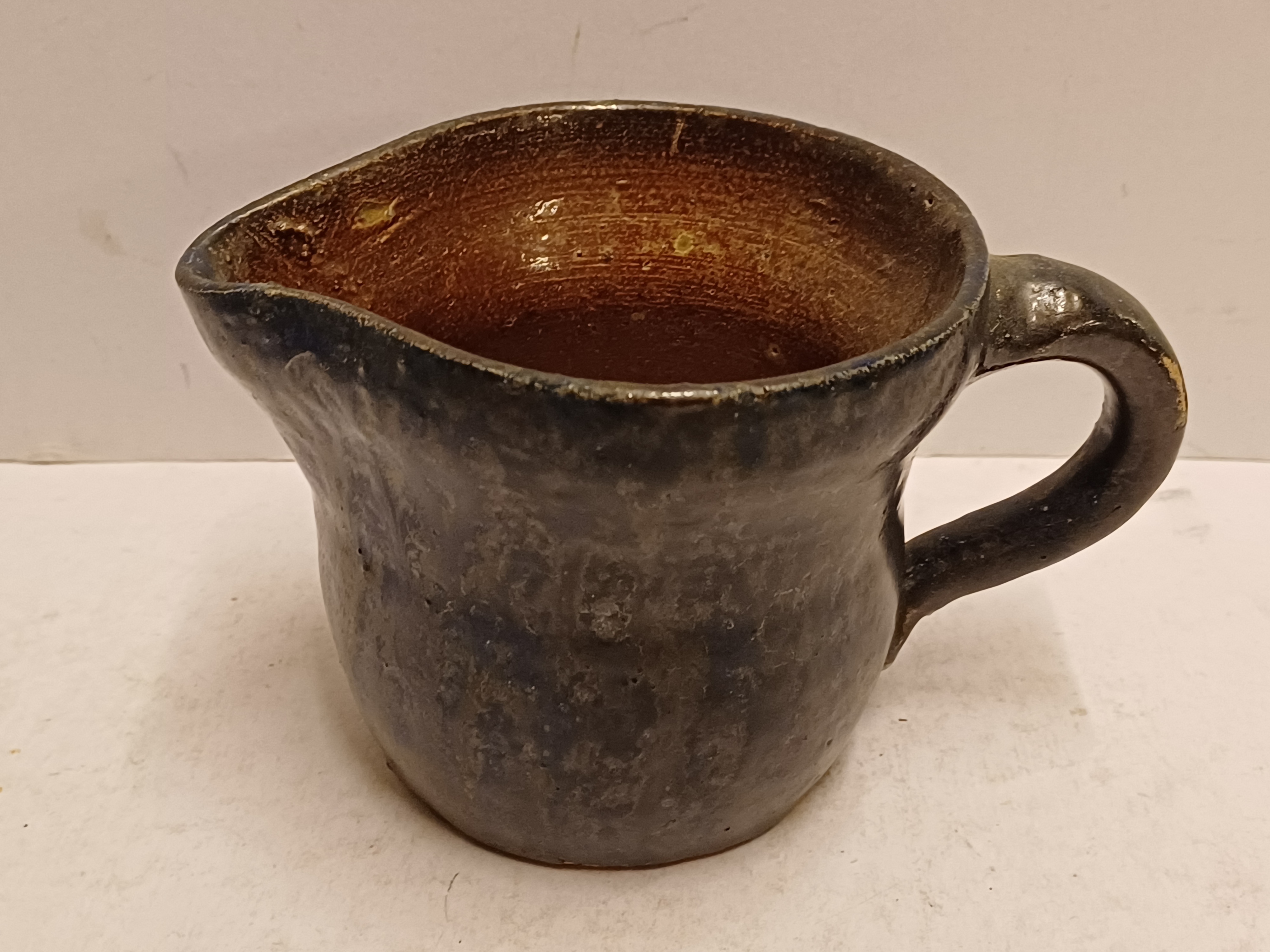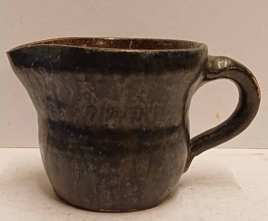 Stoneware milk jug with dark blue glaze. Signed on the bottom.