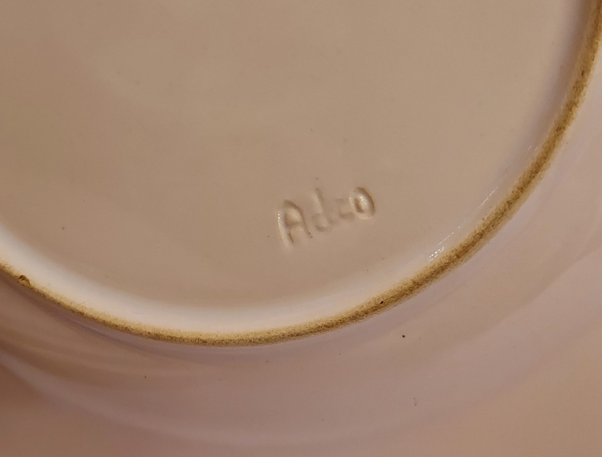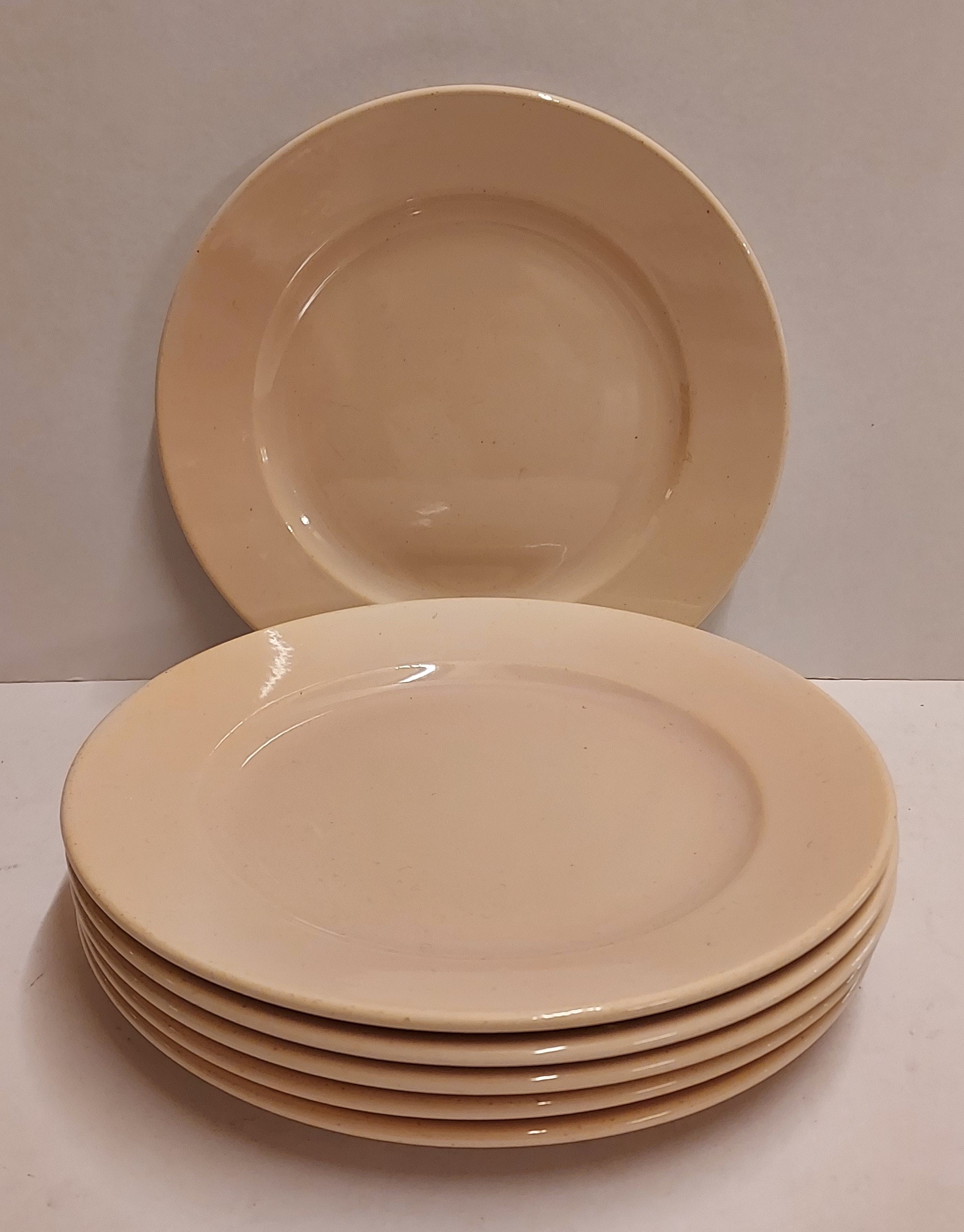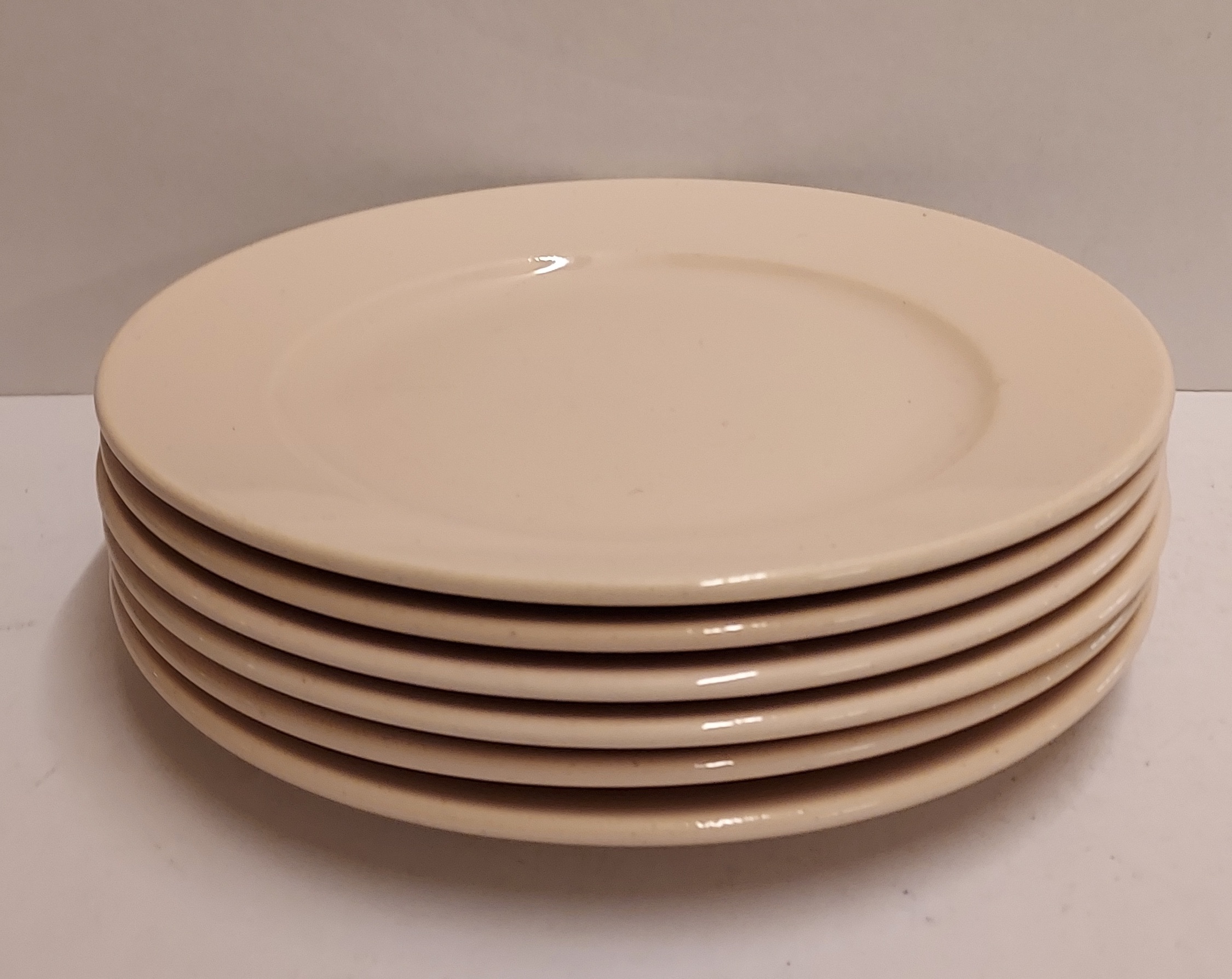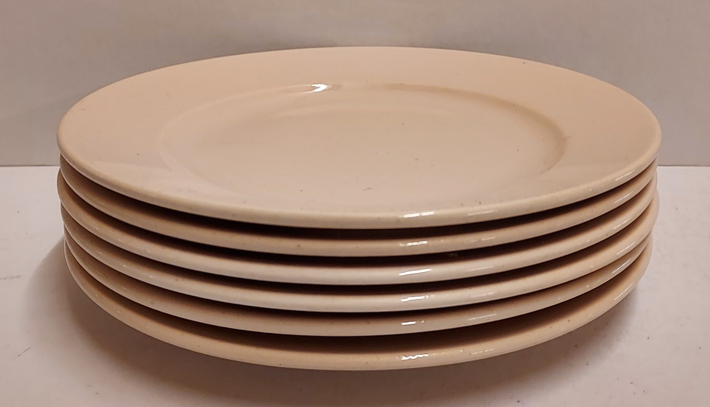 Set of 6 light pink glazed breakfast plates. Made by Adco, marked on the underside.