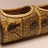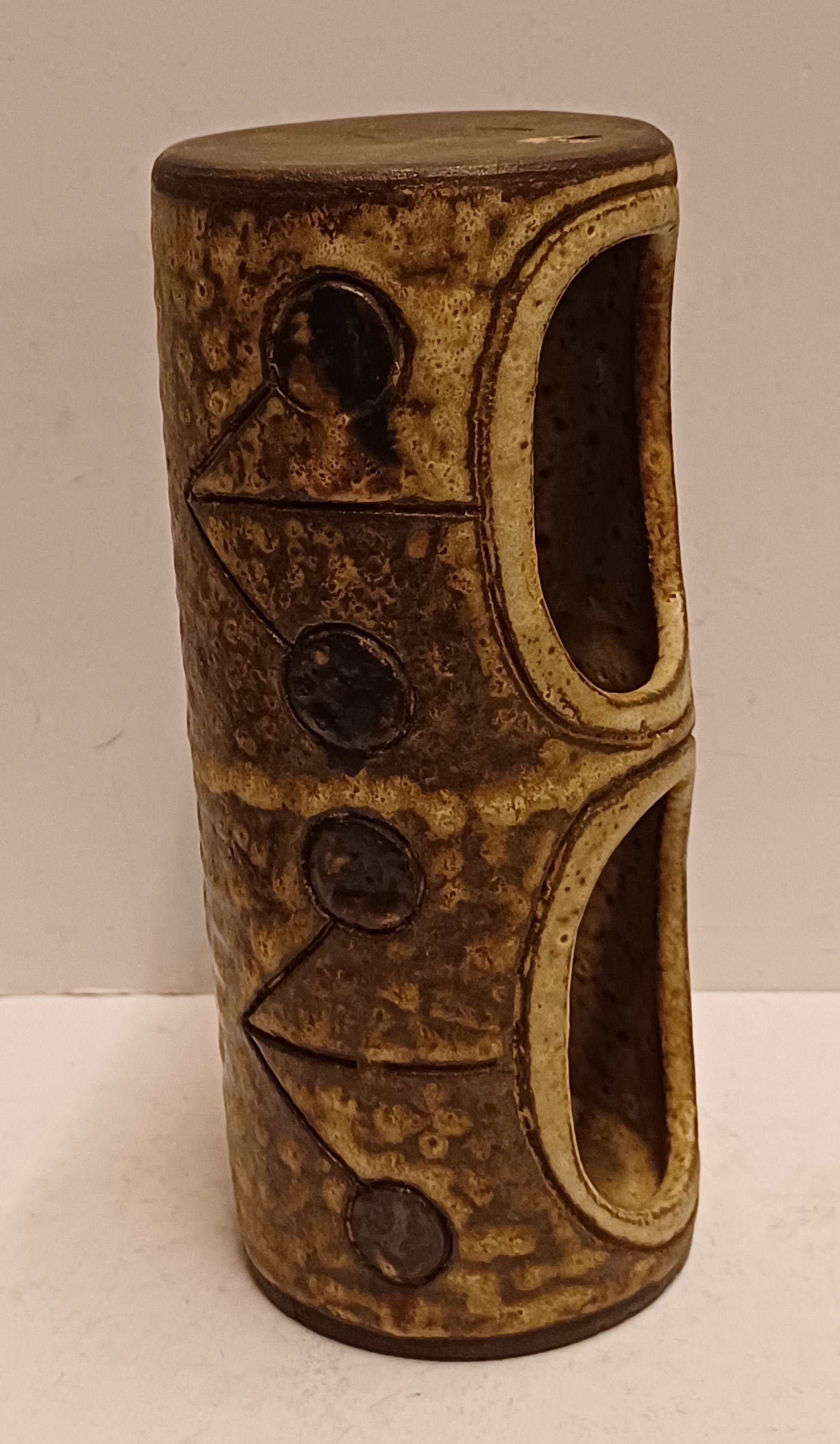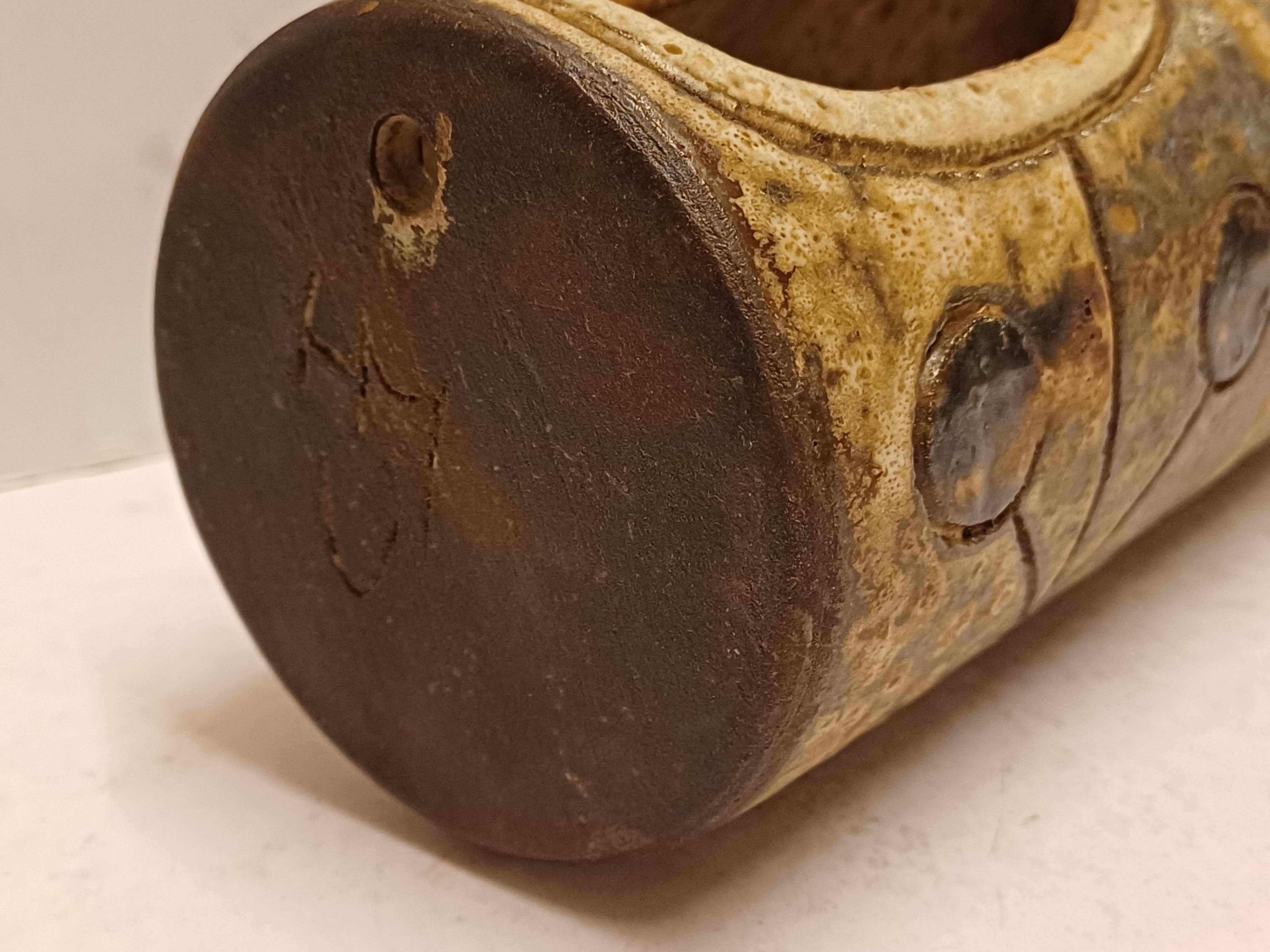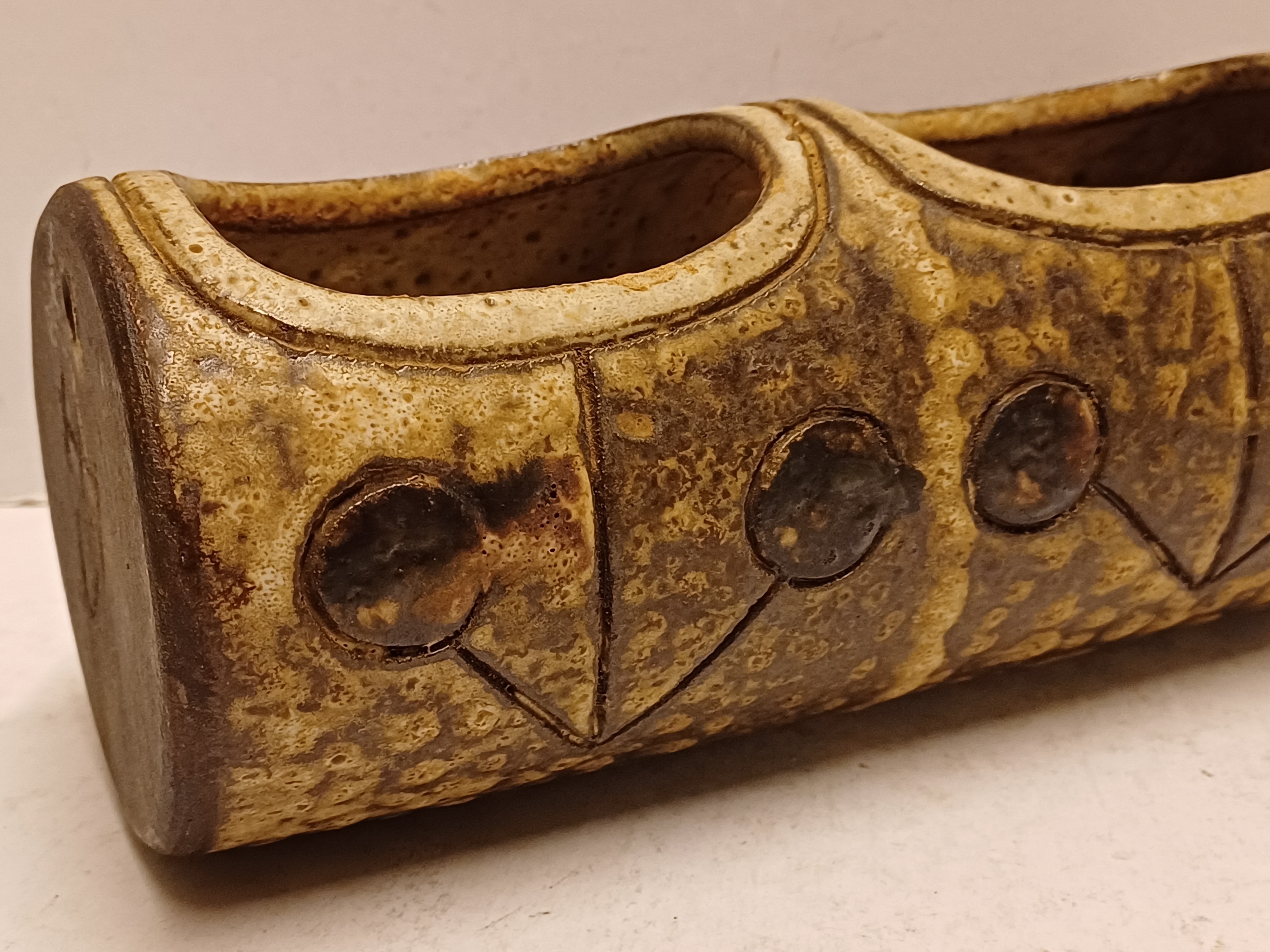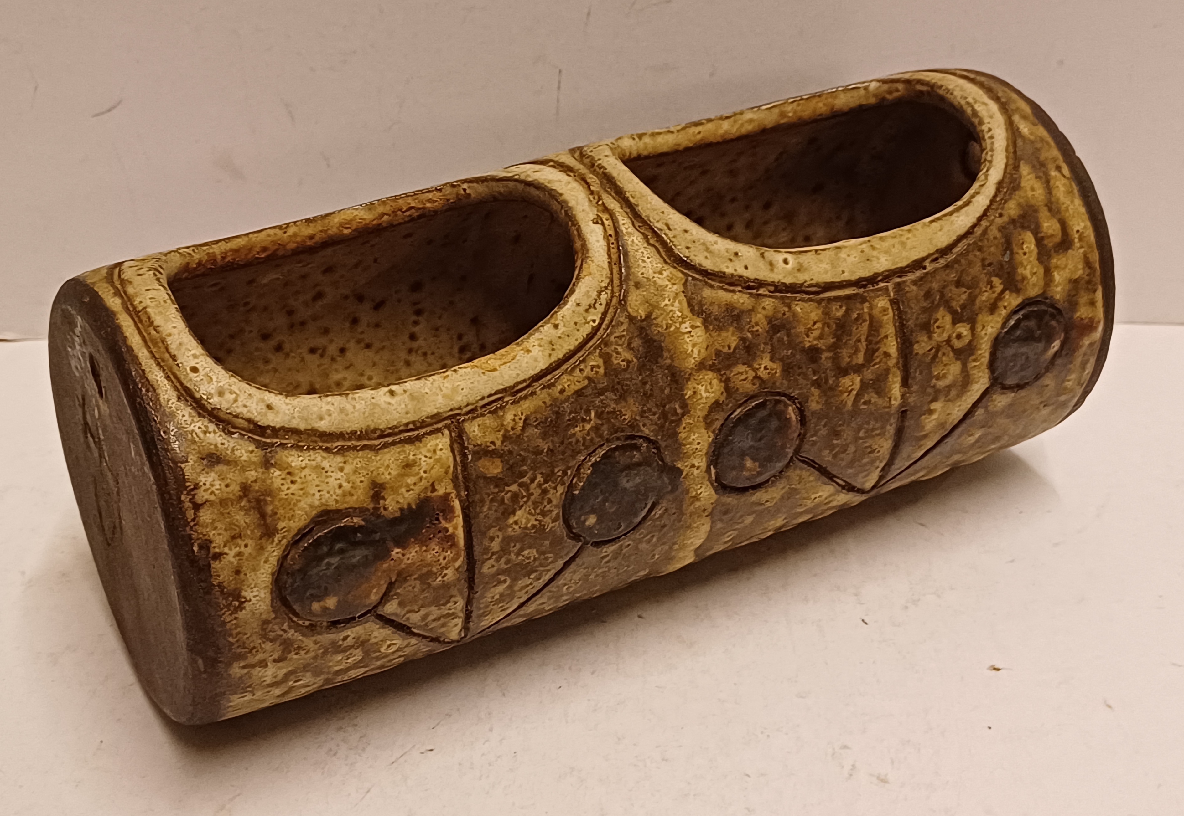 Earthenware plant hanger with 2 openings. Side with signature.