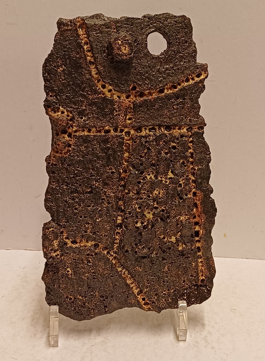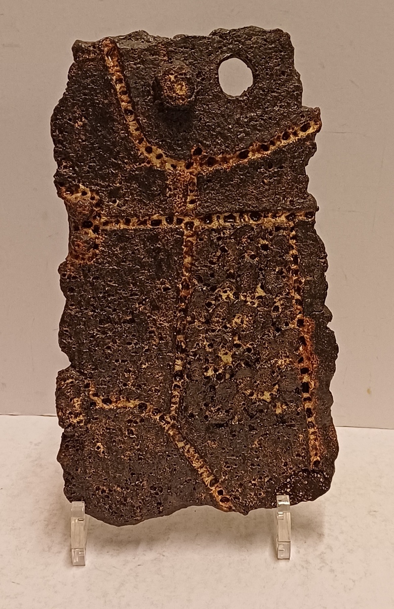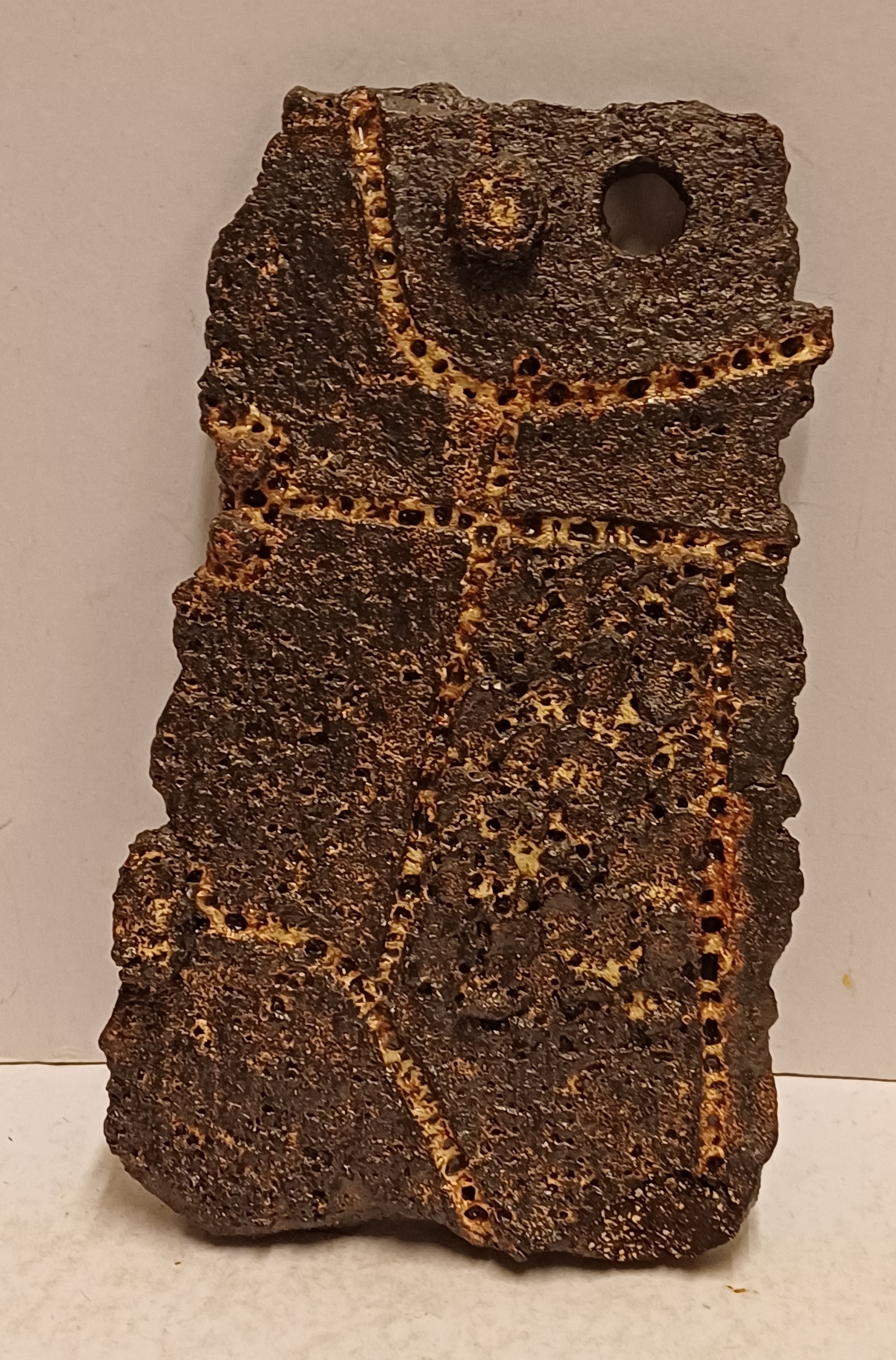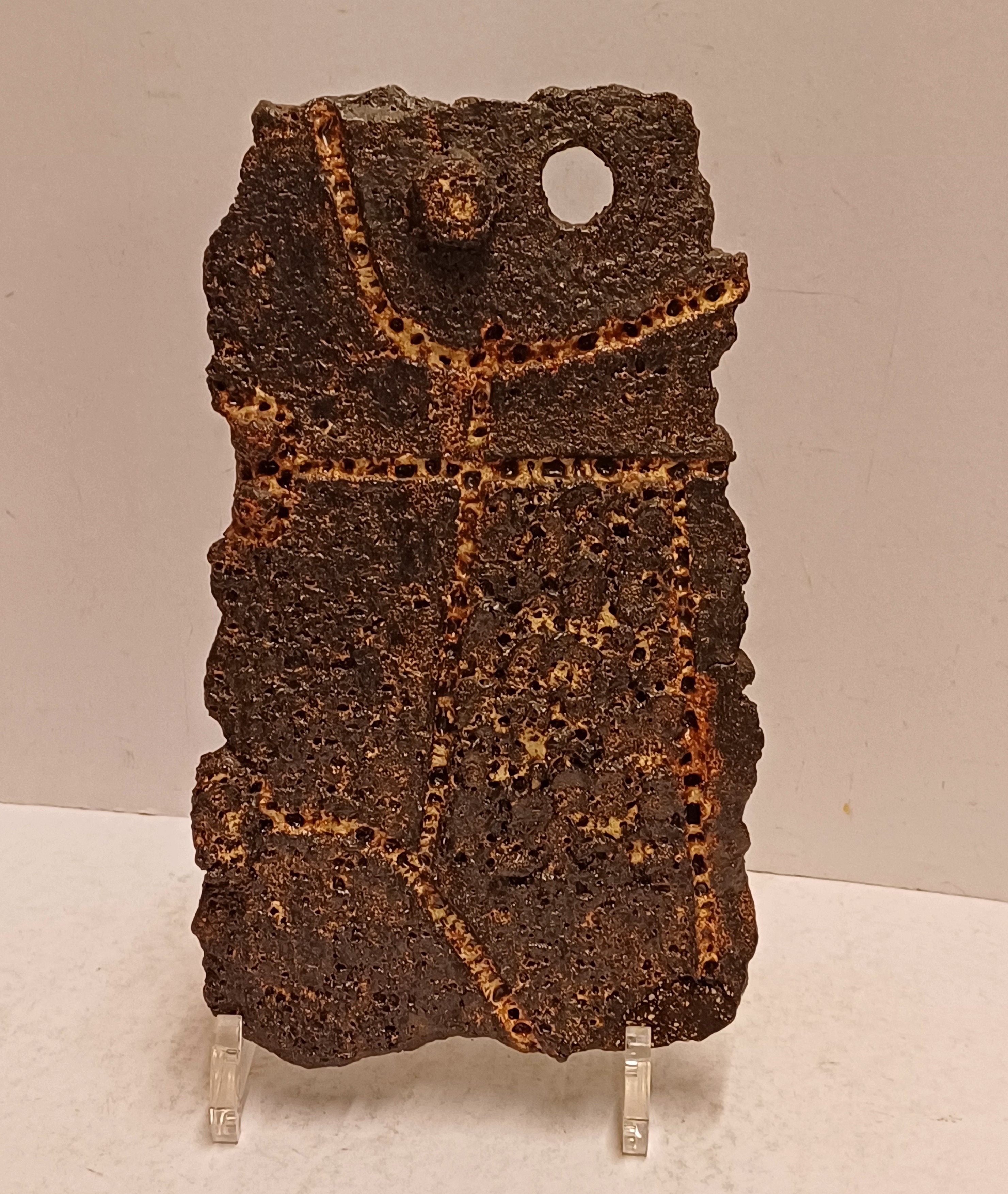 Aardewerken plaquette met ingekraste abstracte decoratie en gat. Achterzijde voluit gesigneerd en gedateerd 1962.