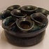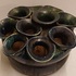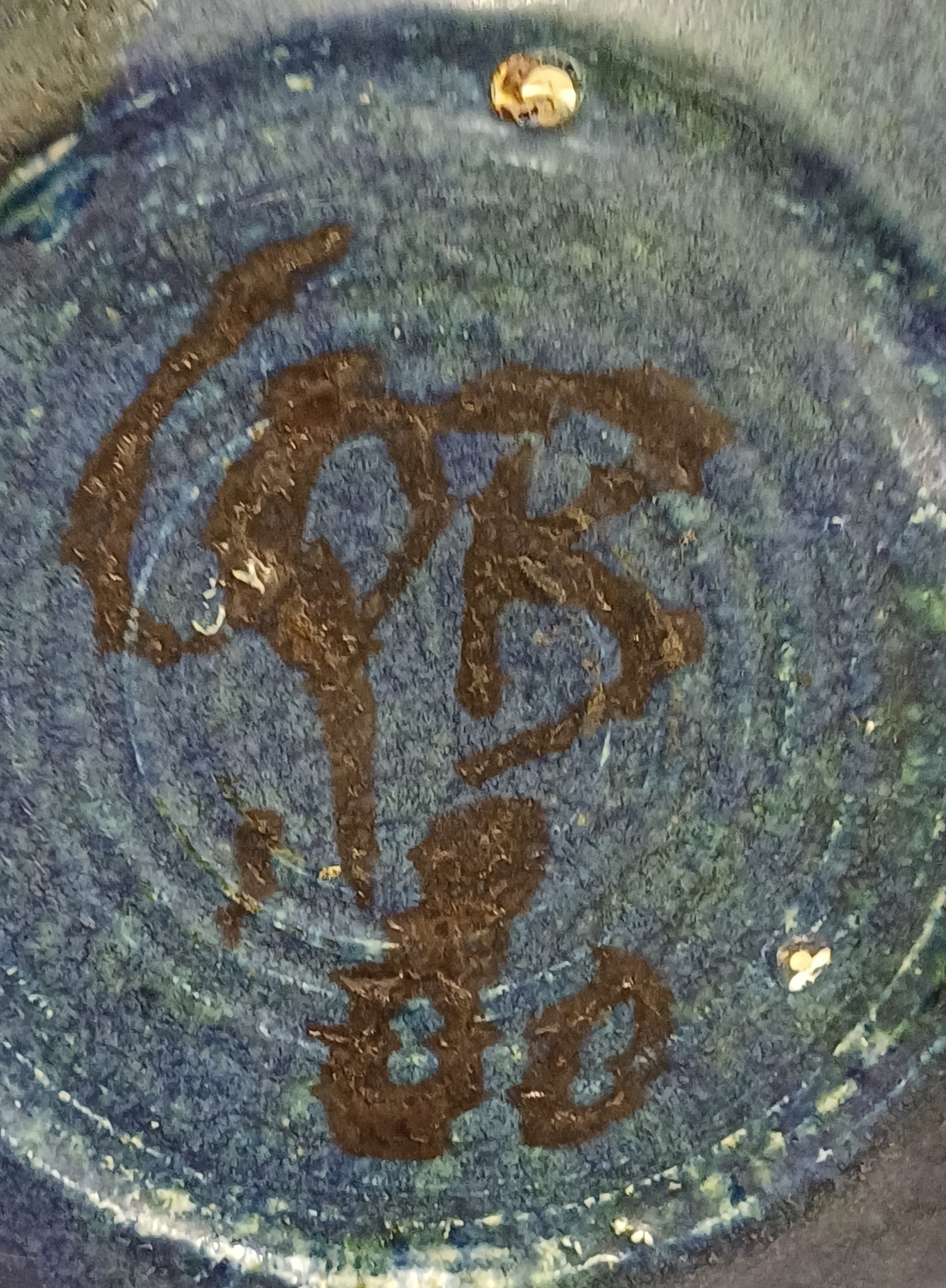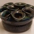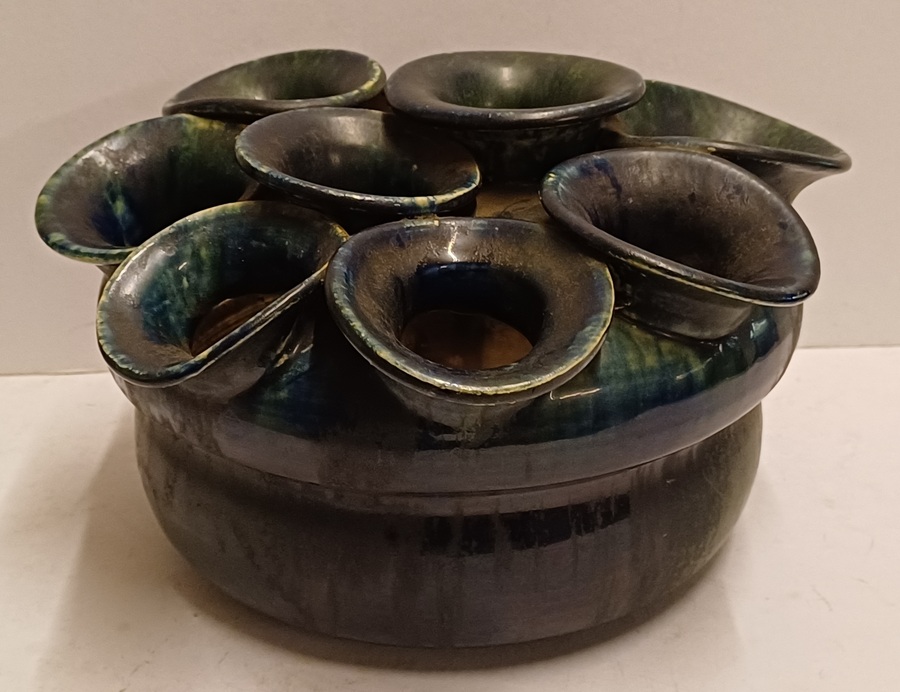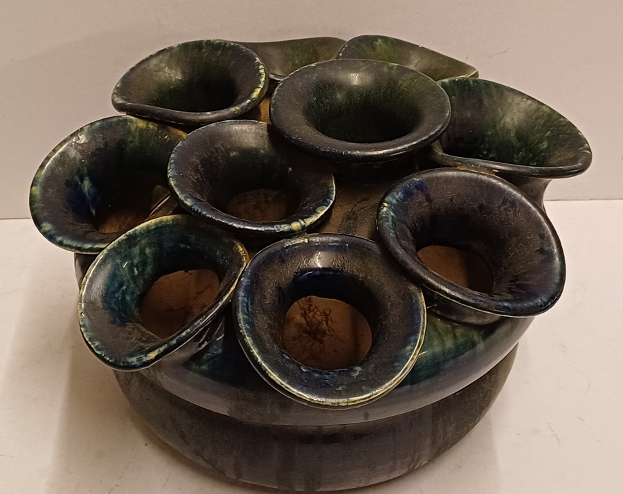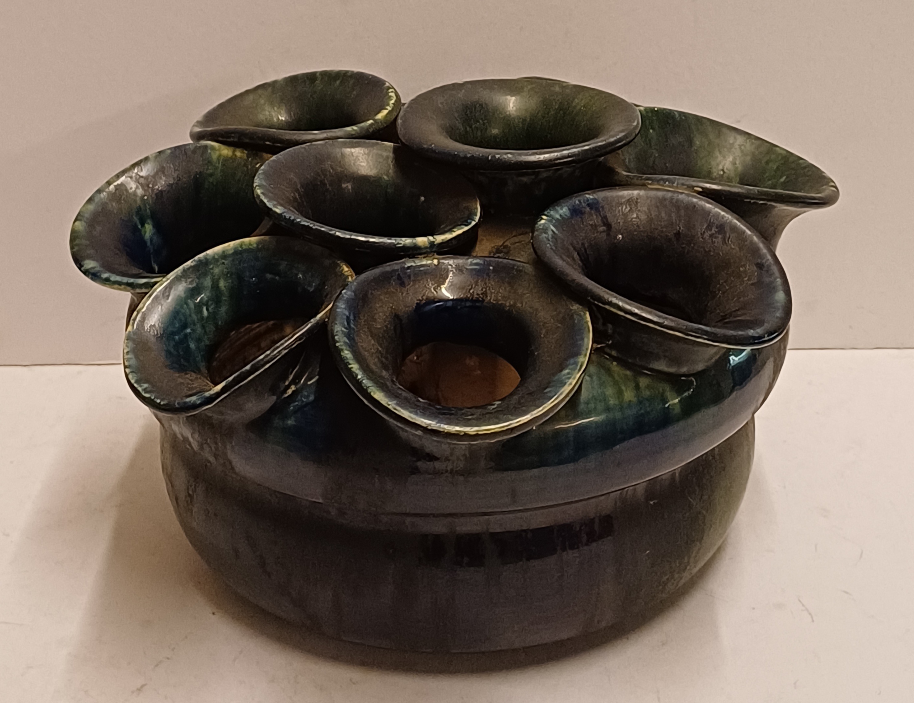 Earthenware dark blue and green glazed rose vase, with multiple openings. Bottom signed and dated '80.