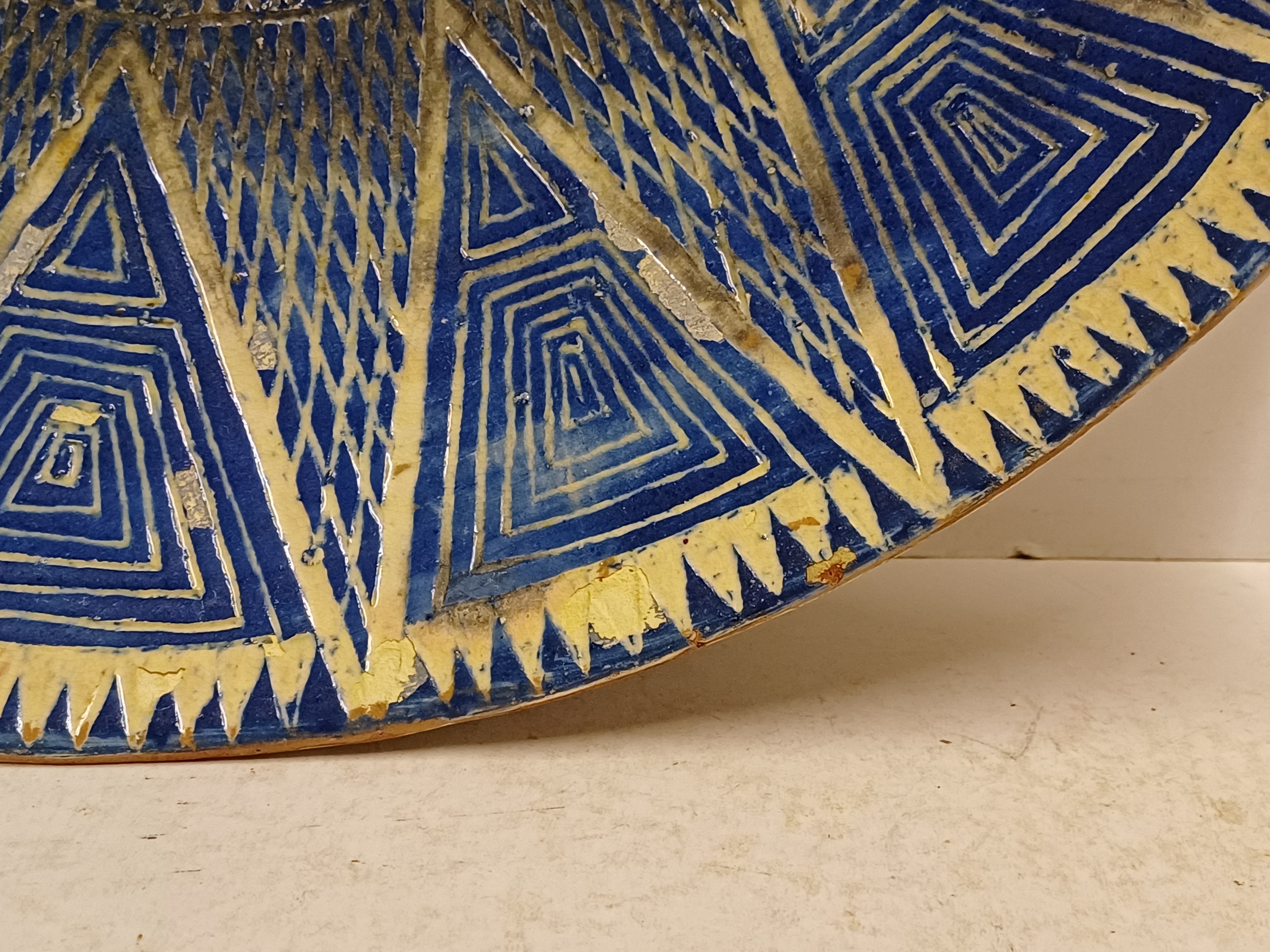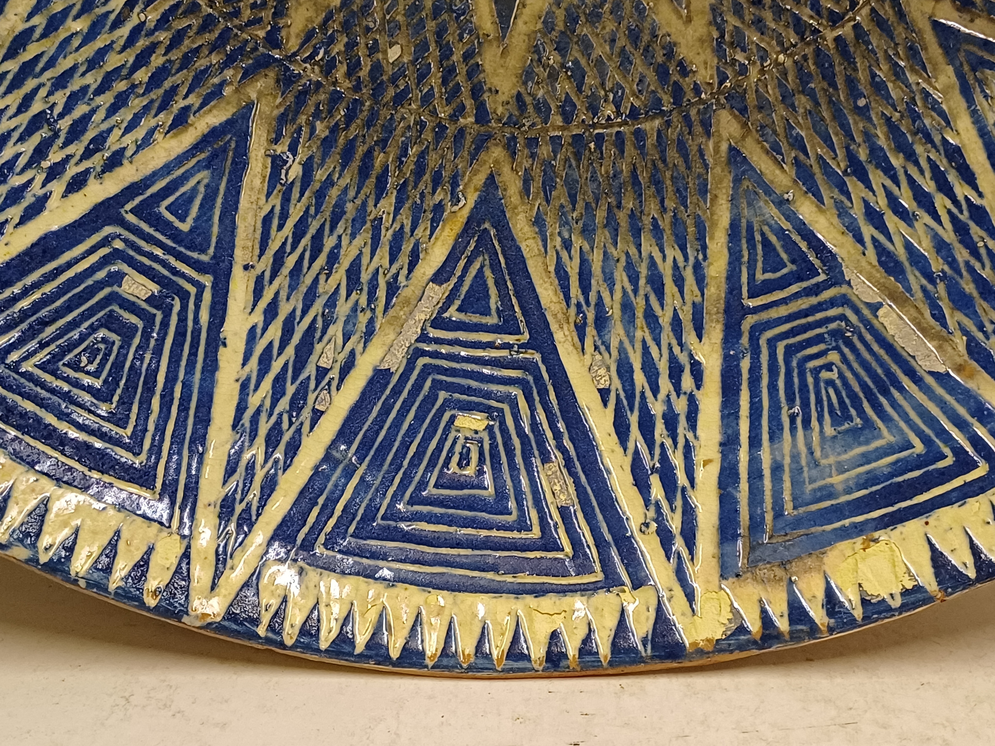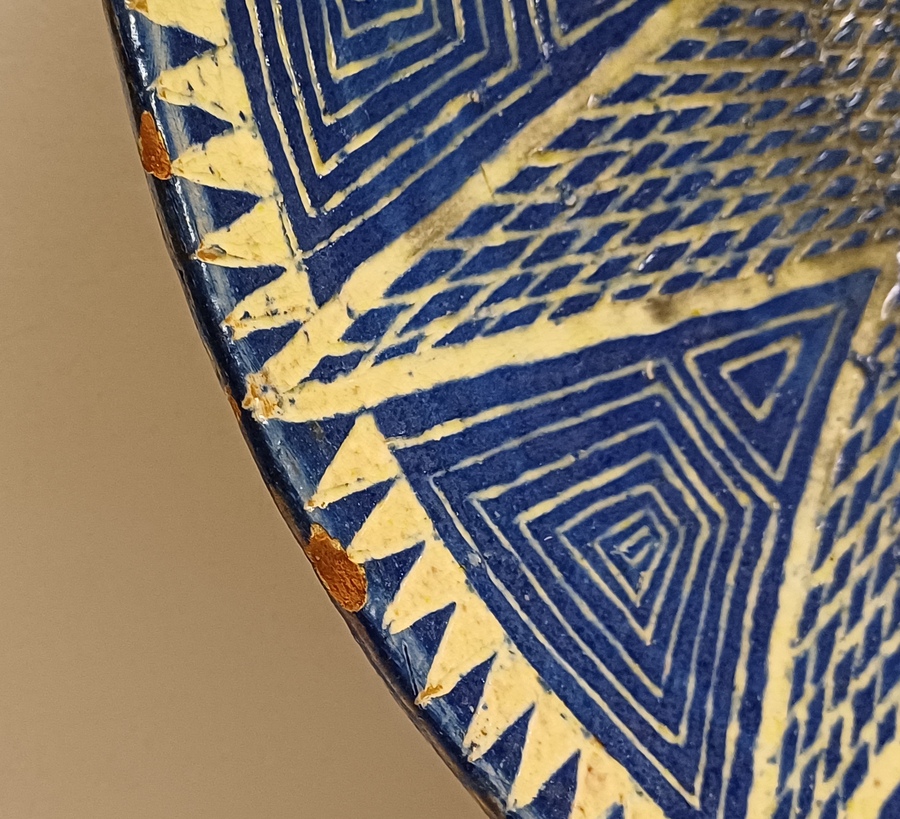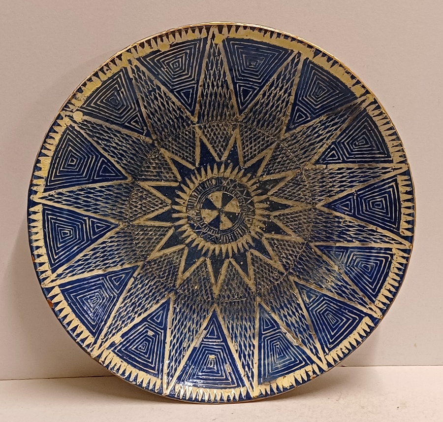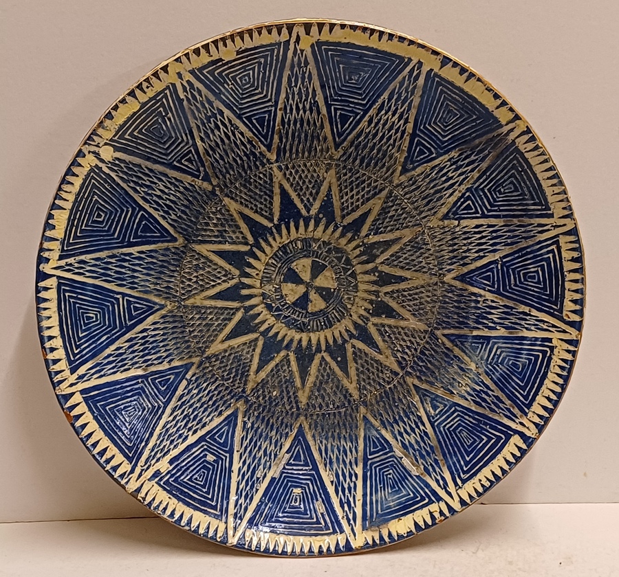 Large bowl with hand-carved decor of a star on a blue background. Reverse side with early factory mark Linders en Jansen Milsbeek Limburg.