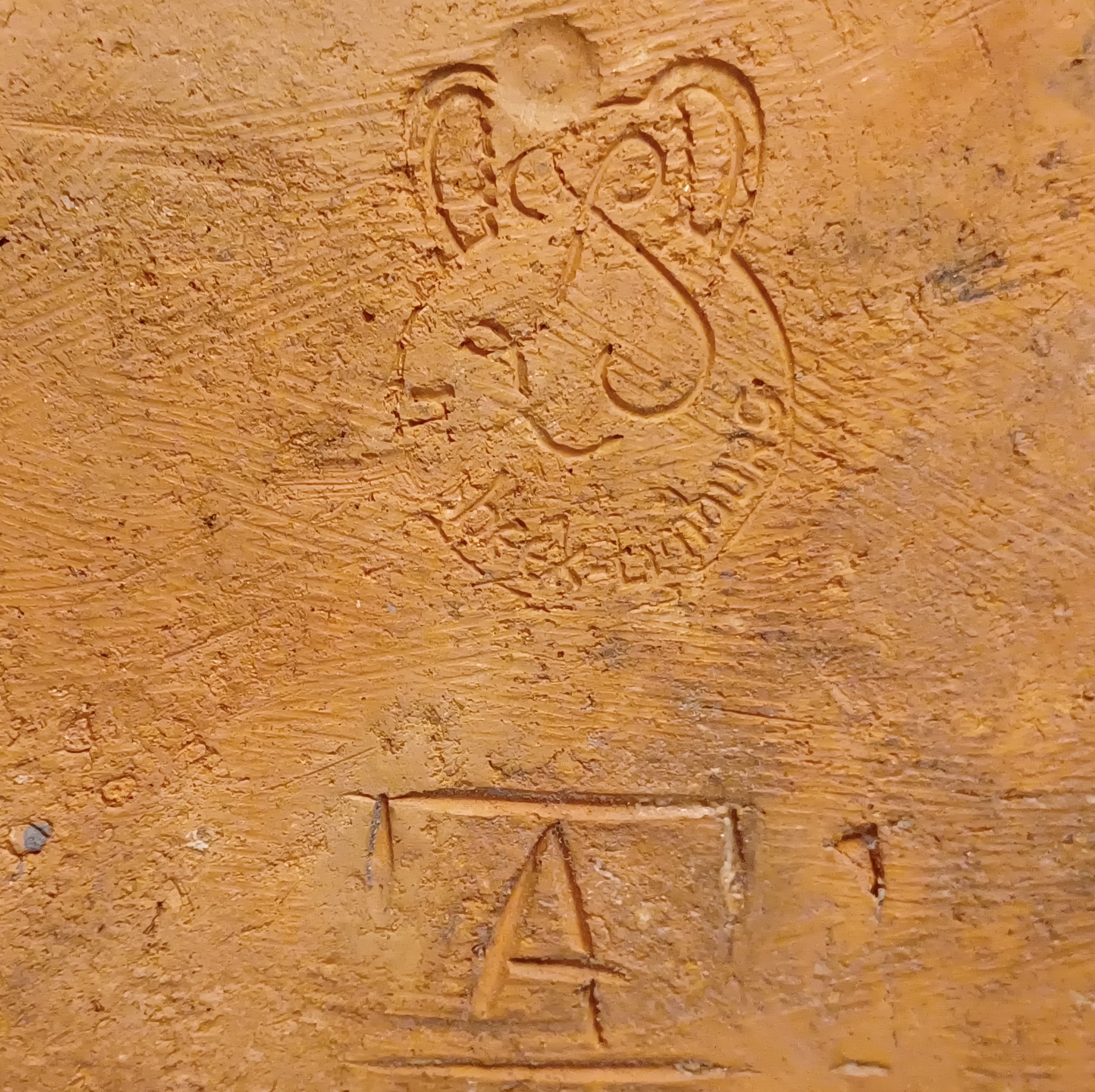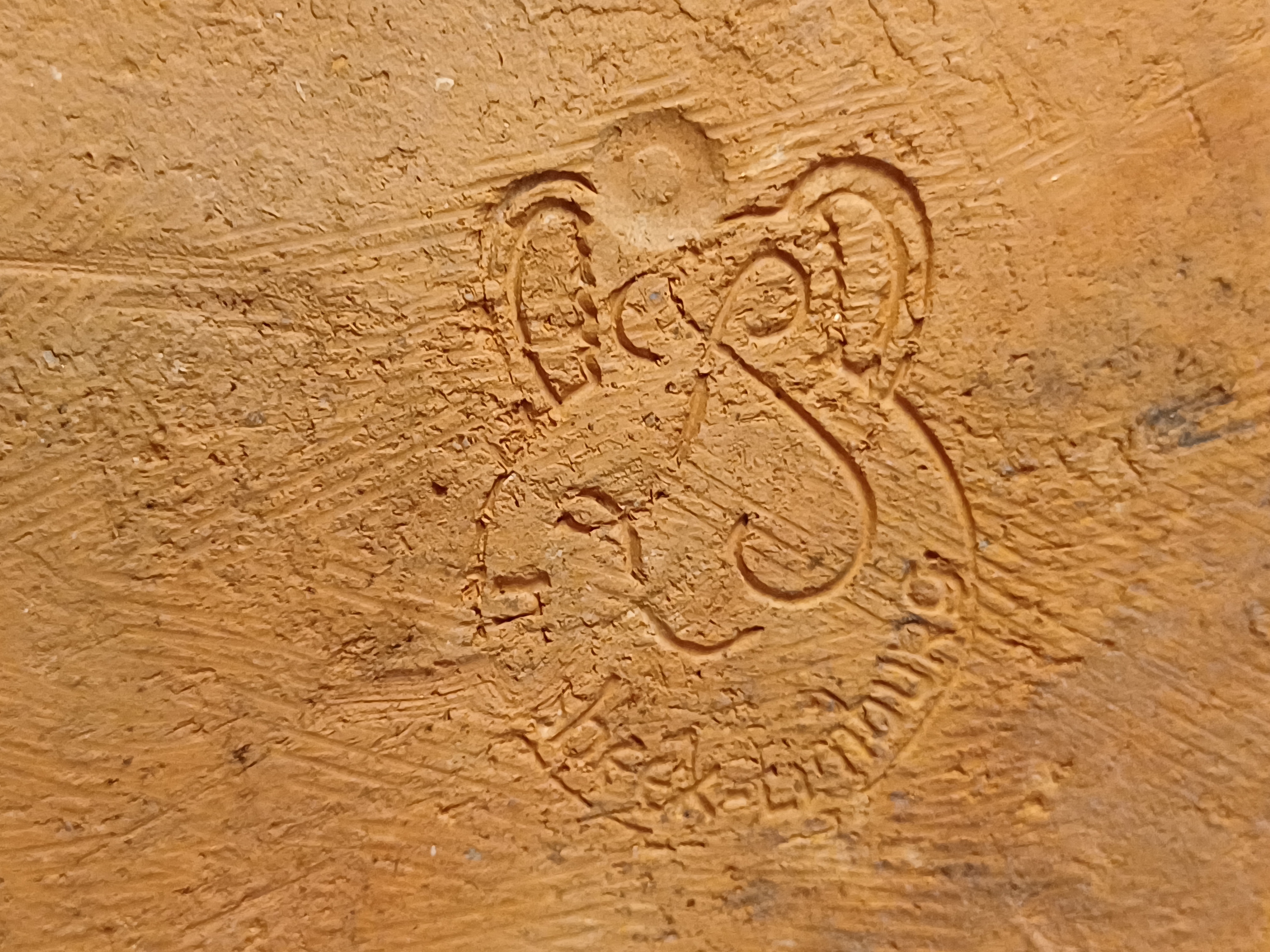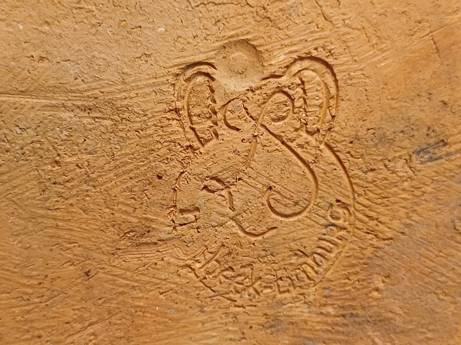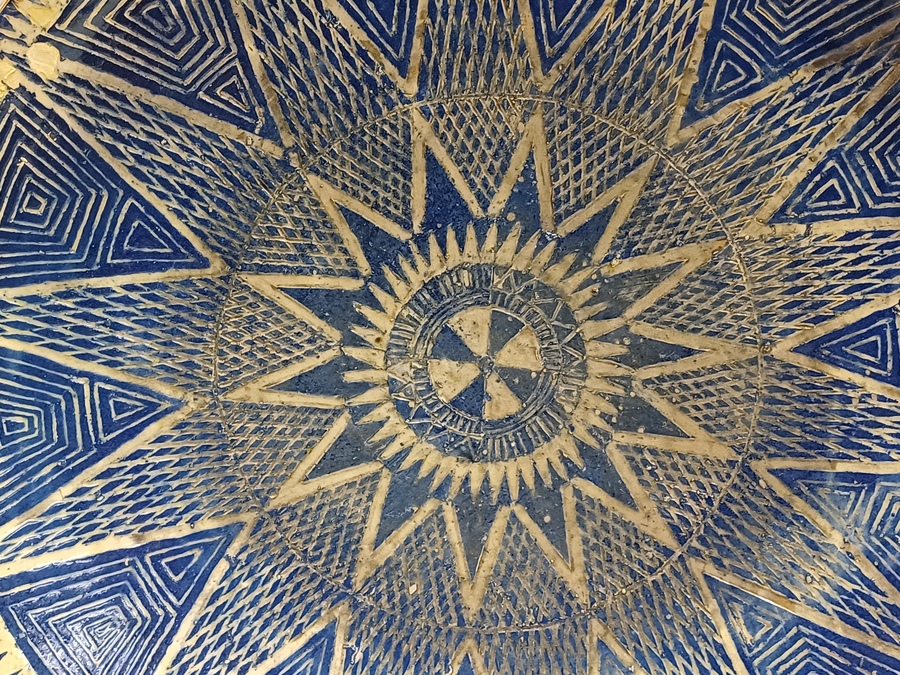 Large bowl with hand-carved decor of a star on a blue background. Reverse side with early factory mark Linders en Jansen Milsbeek Limburg.