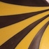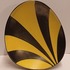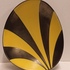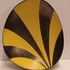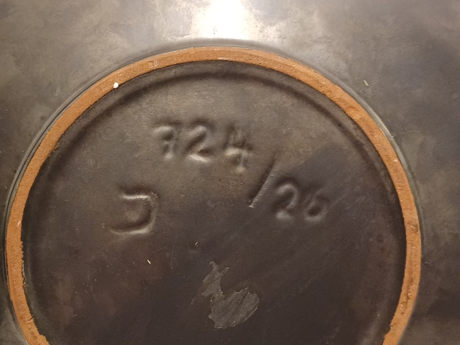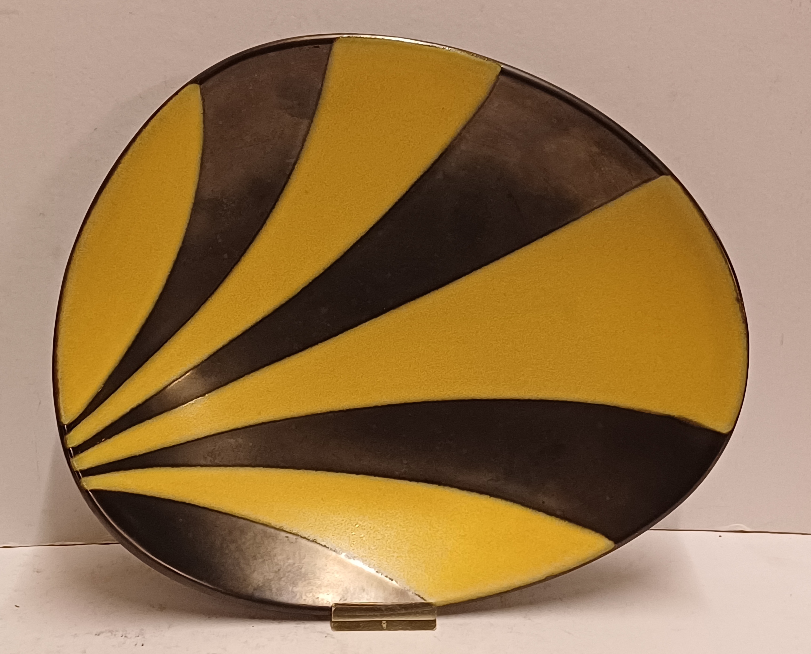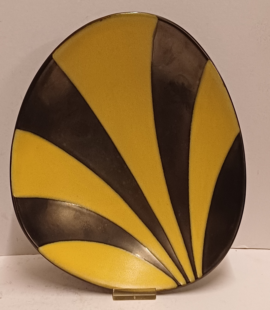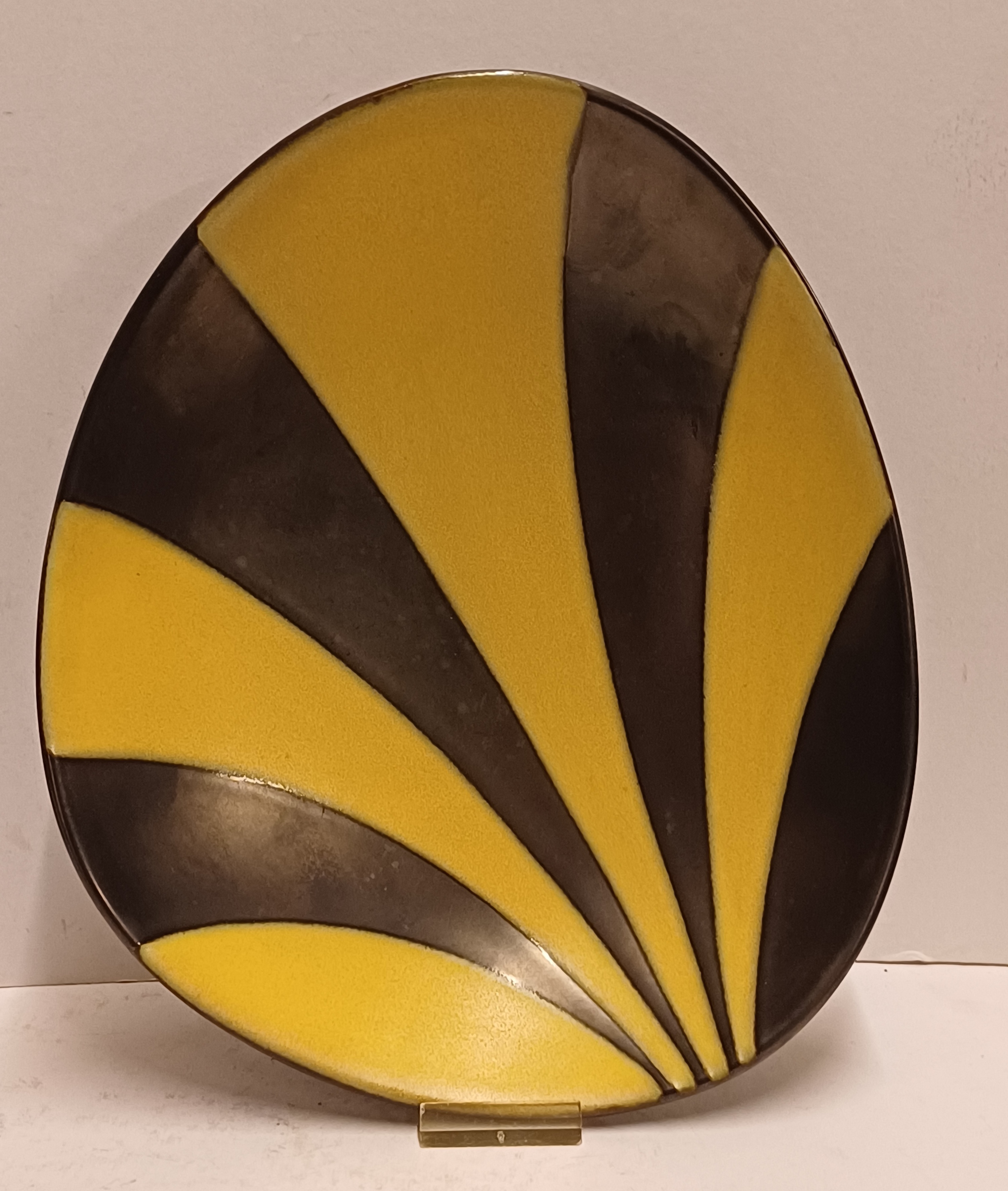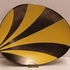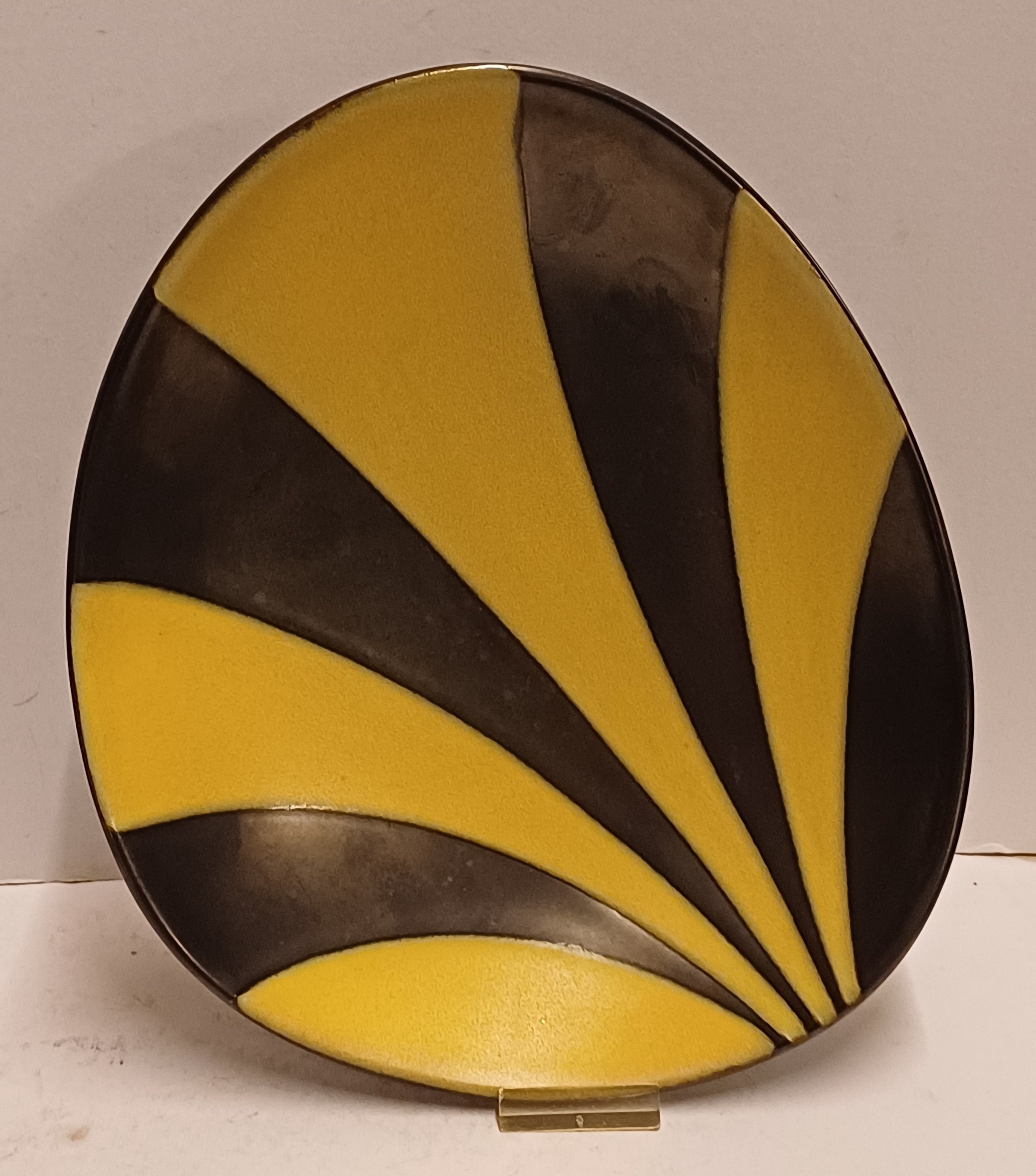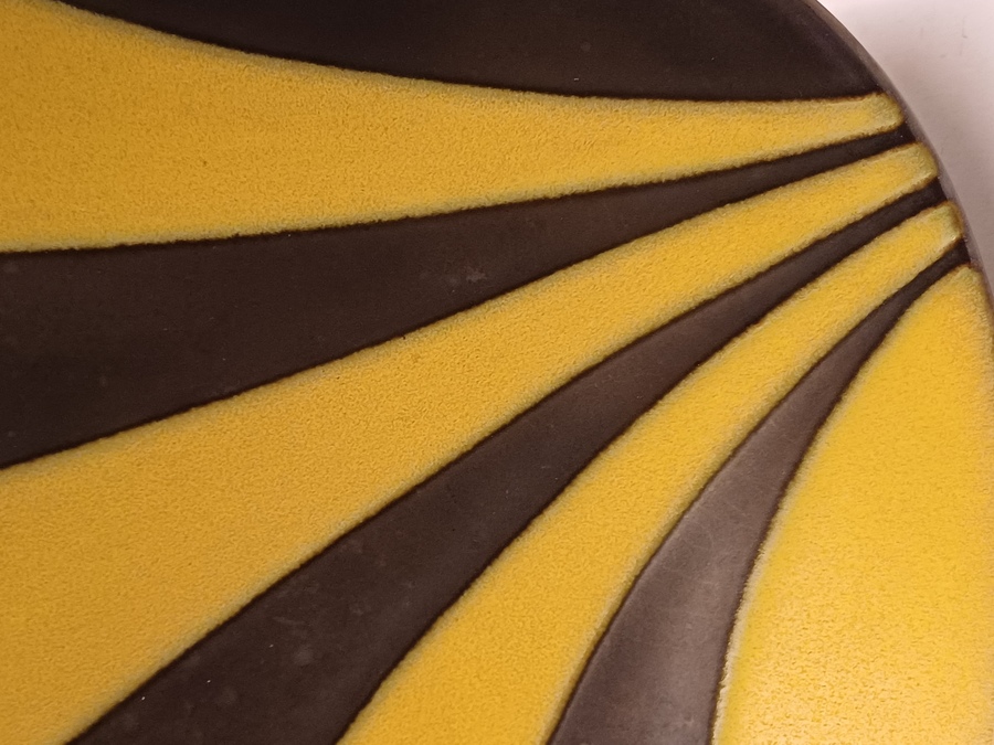 Gegoten aardewerken schaal met gele en zwarte banen decoratie. Onderzijde met signatuur en modelnummer.