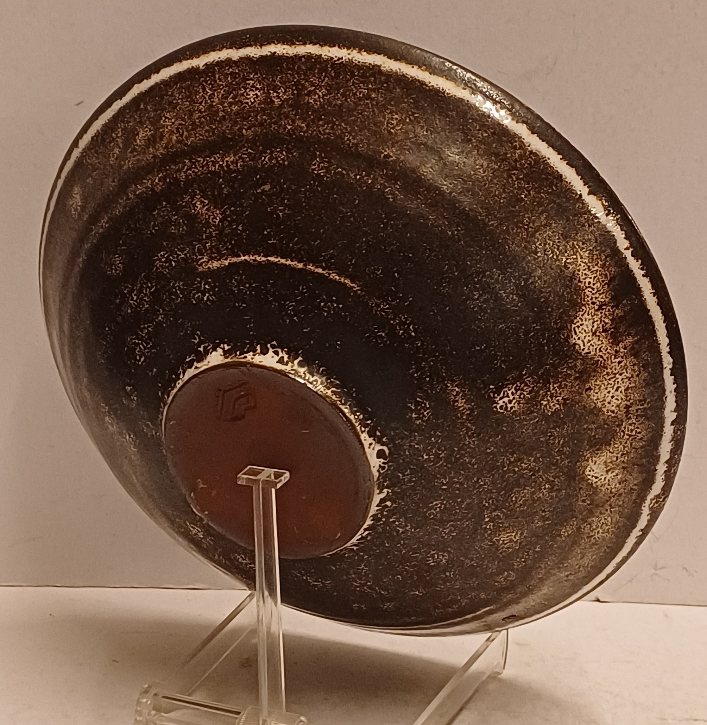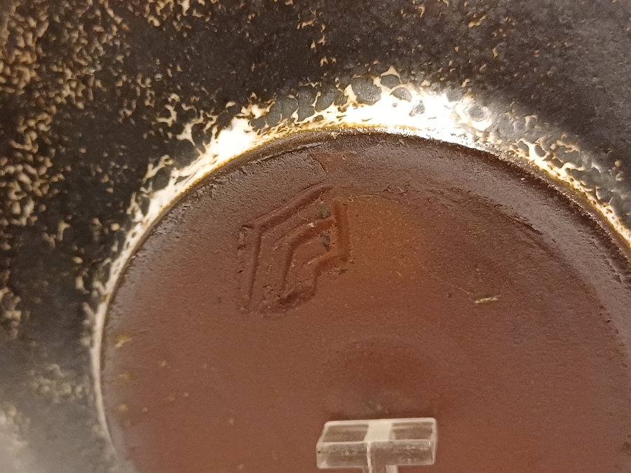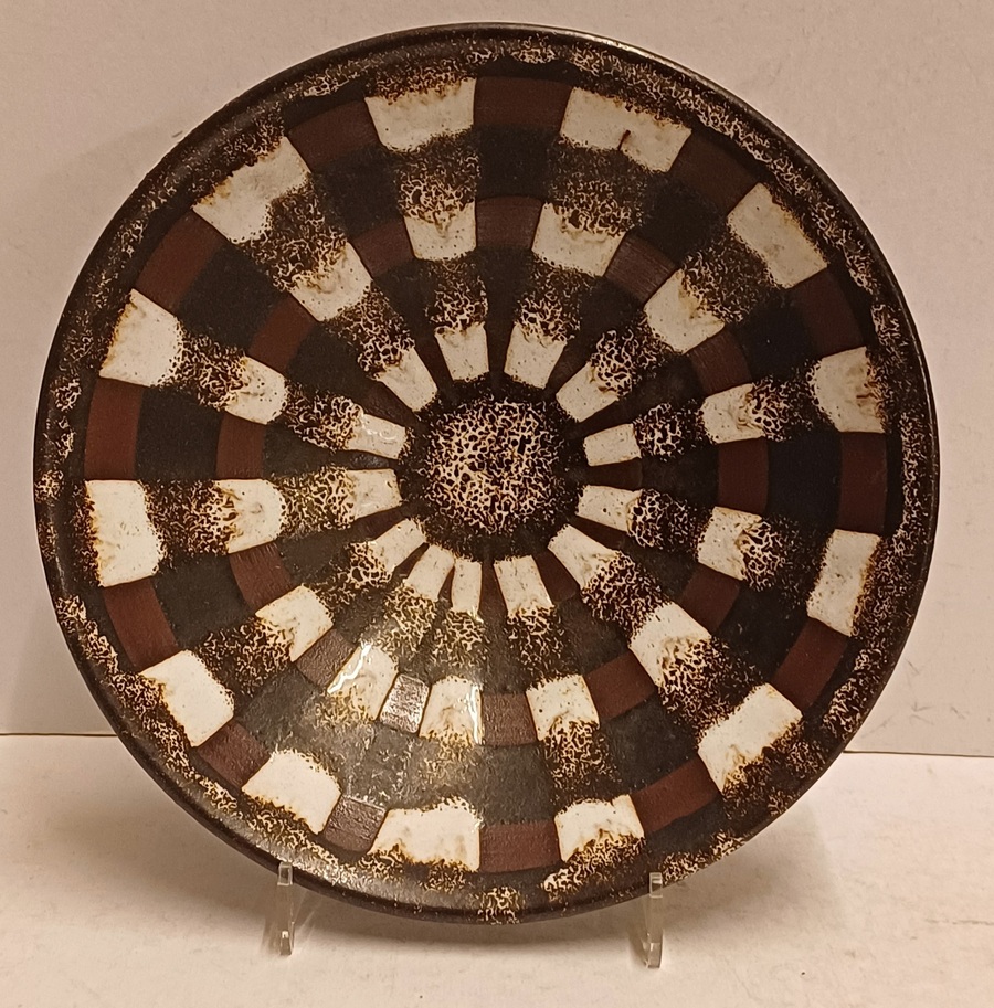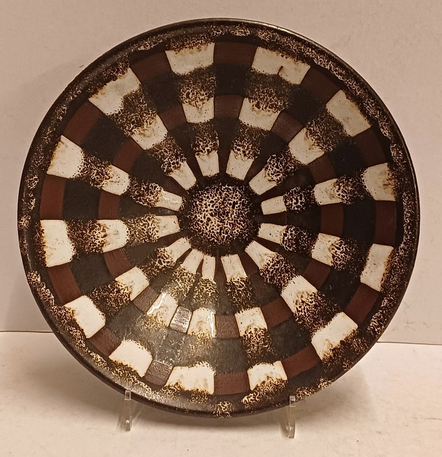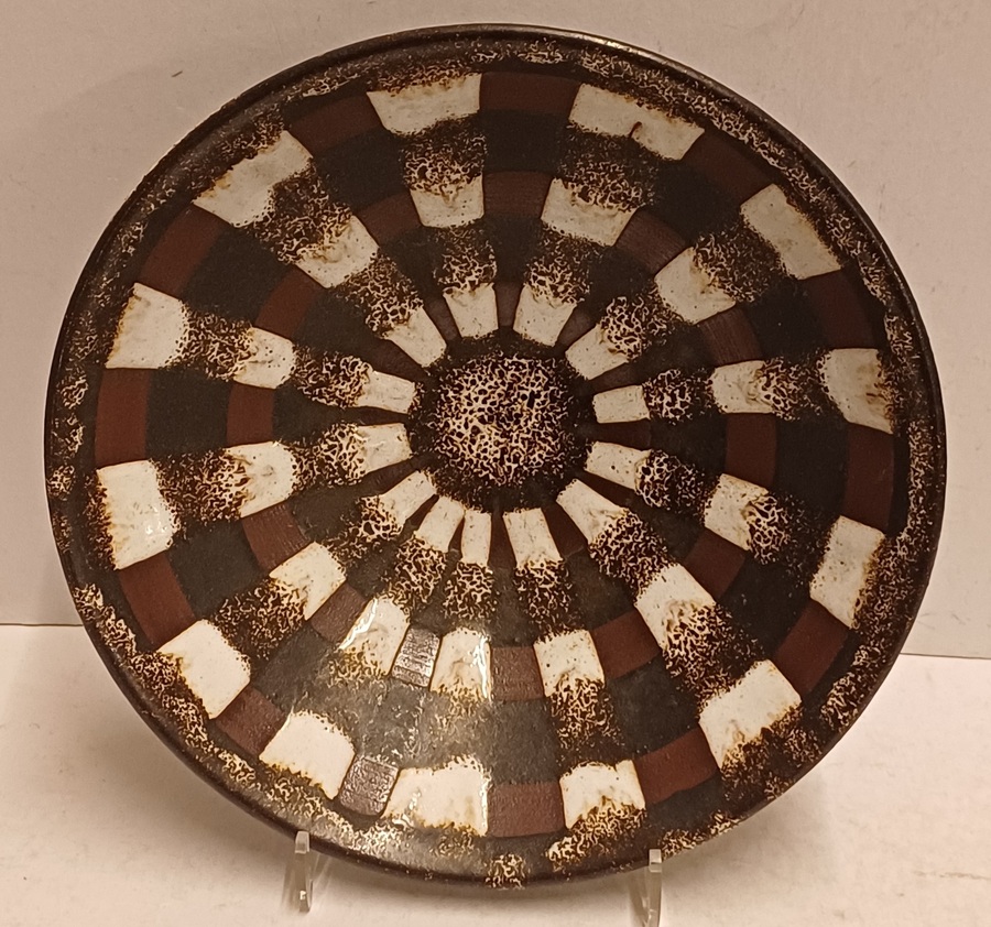 Aardwerken schaal met wit bruine decoratie. Onderzijde met kunstenaars monogram.