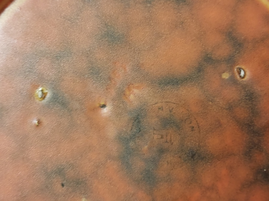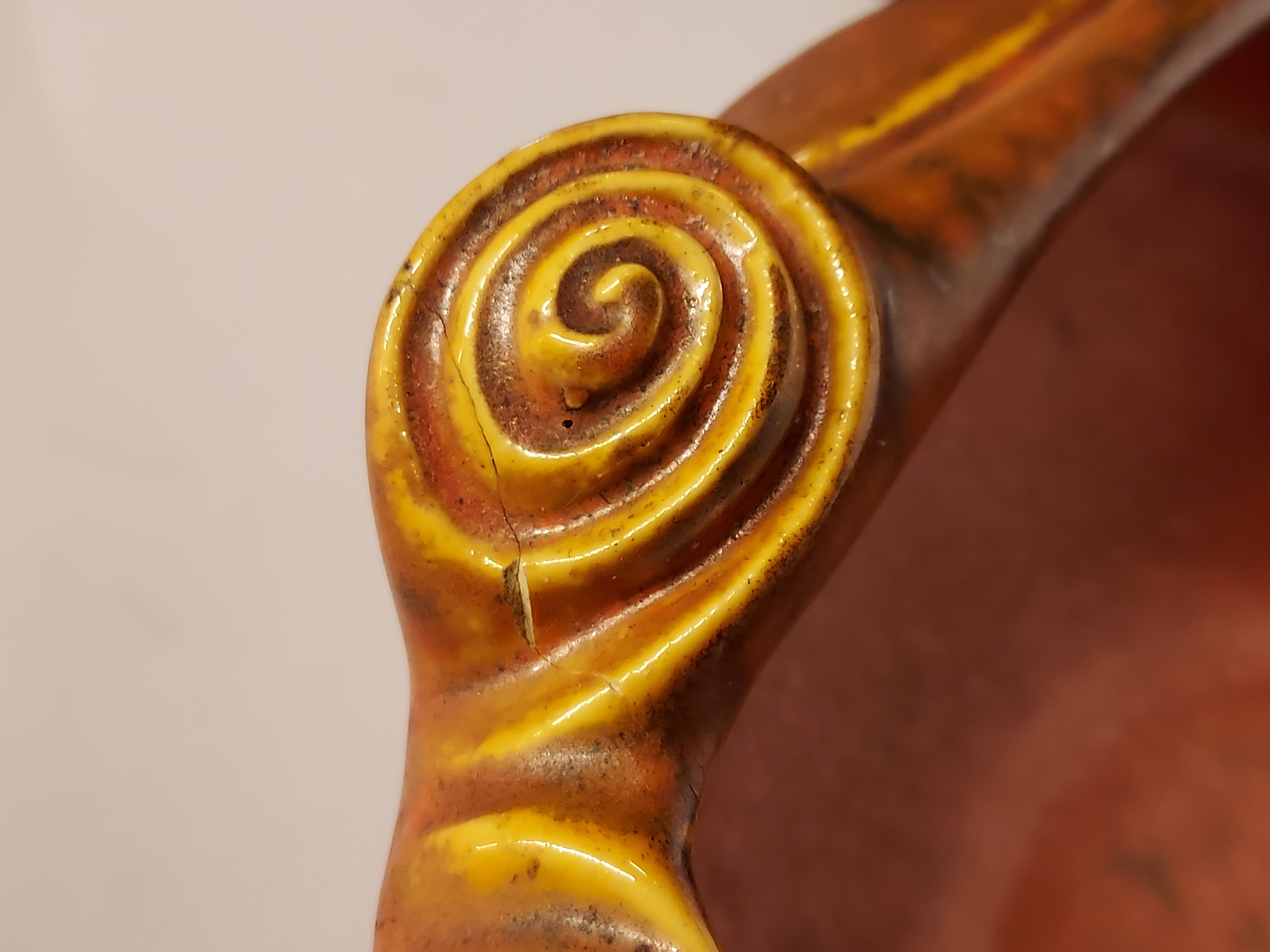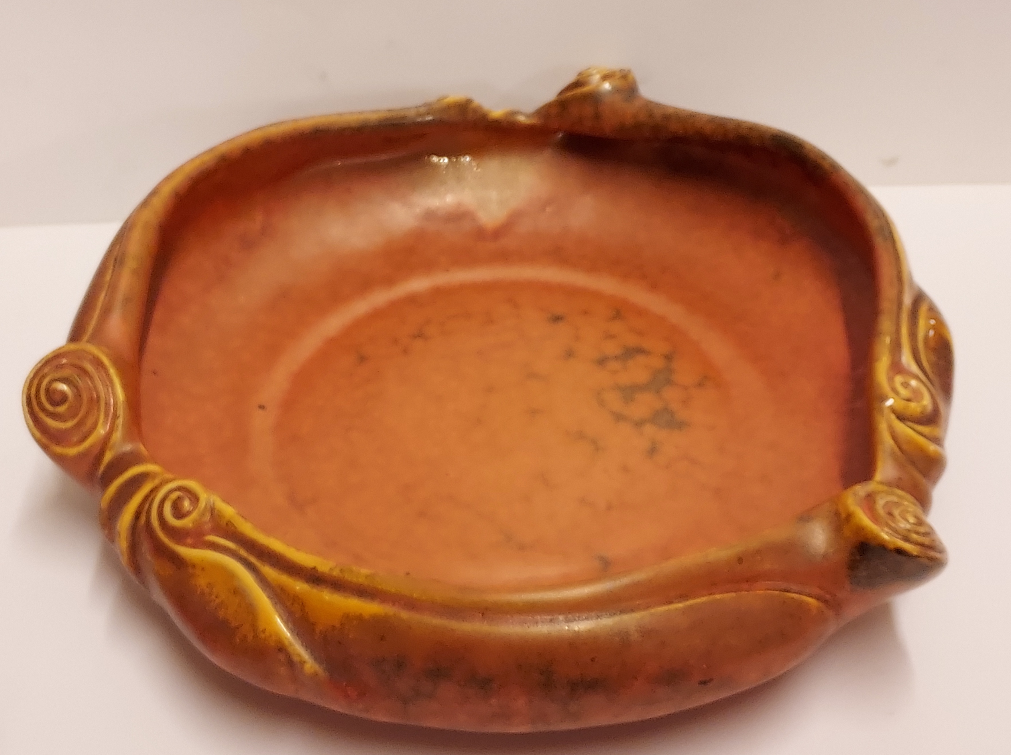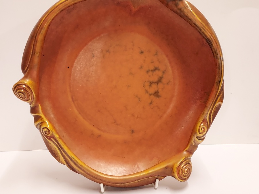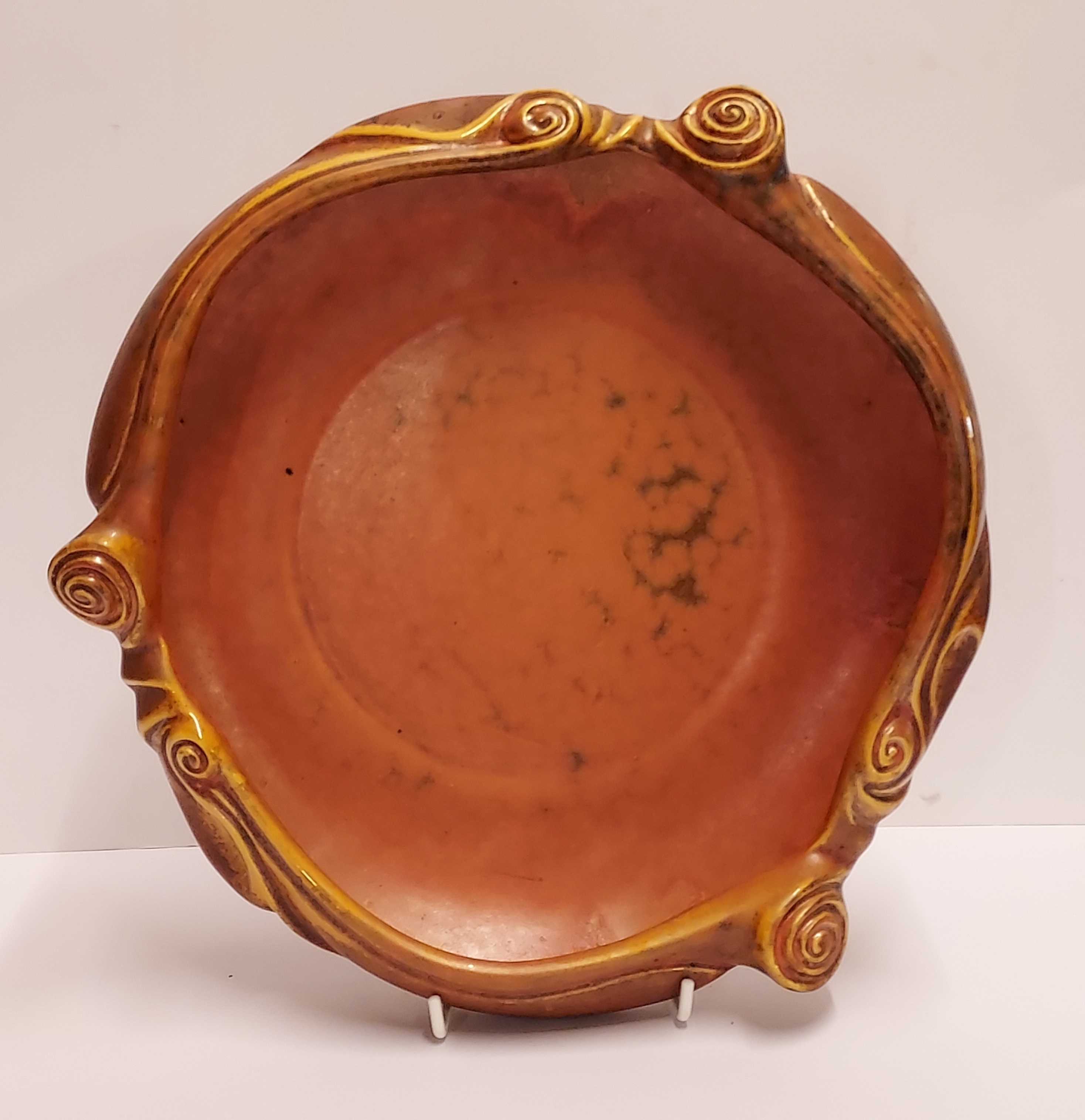 Bowl with orange flamed glaze and irregular edges. Design by Fons Decker, executed by Plateelbakkerij Zuid Holland. Bottom with factory mark.