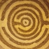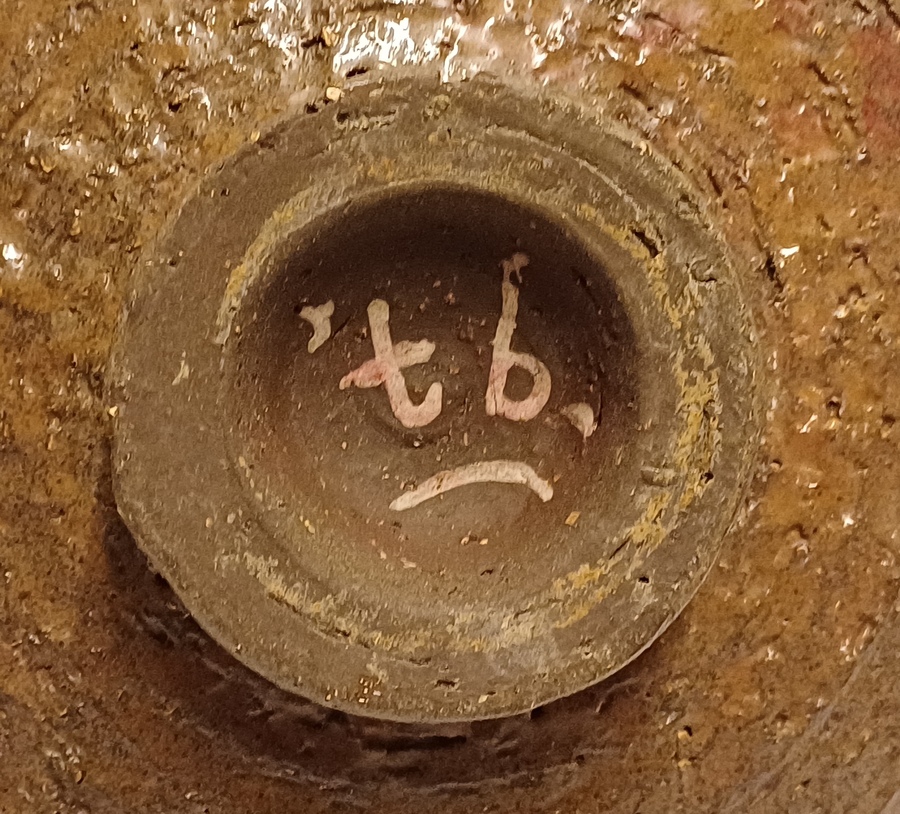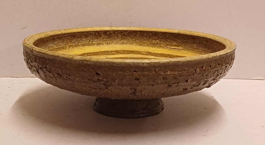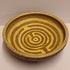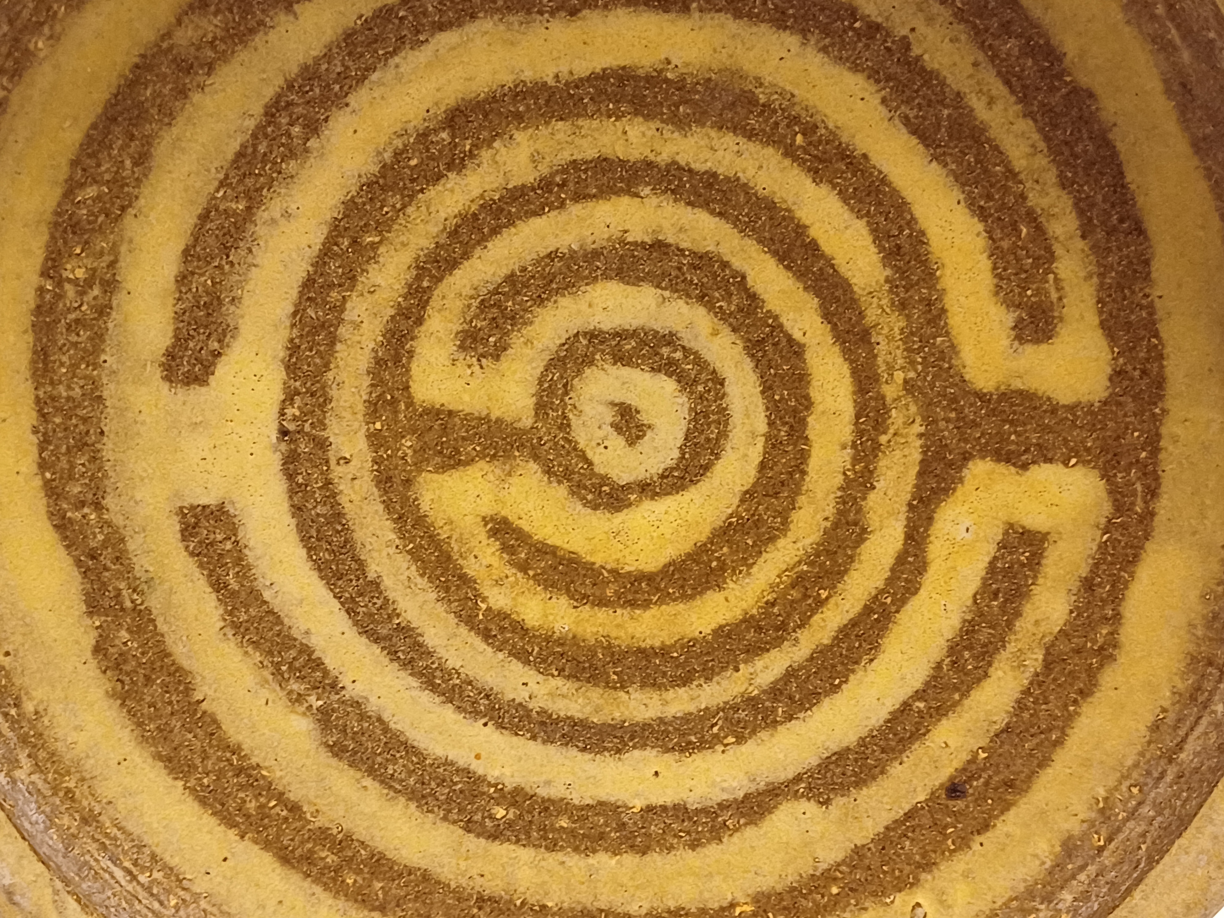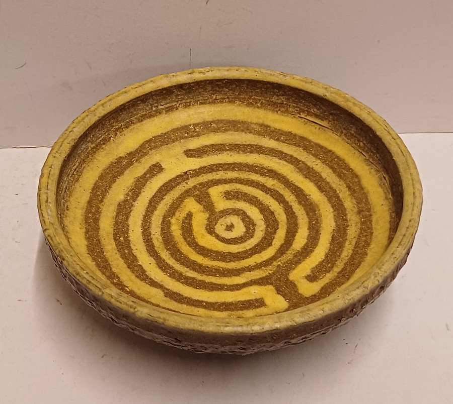 Earthenware bowl with a maze decoration in cream on a brown background. Underside with painted signature. Designed by Jan van Ham.
