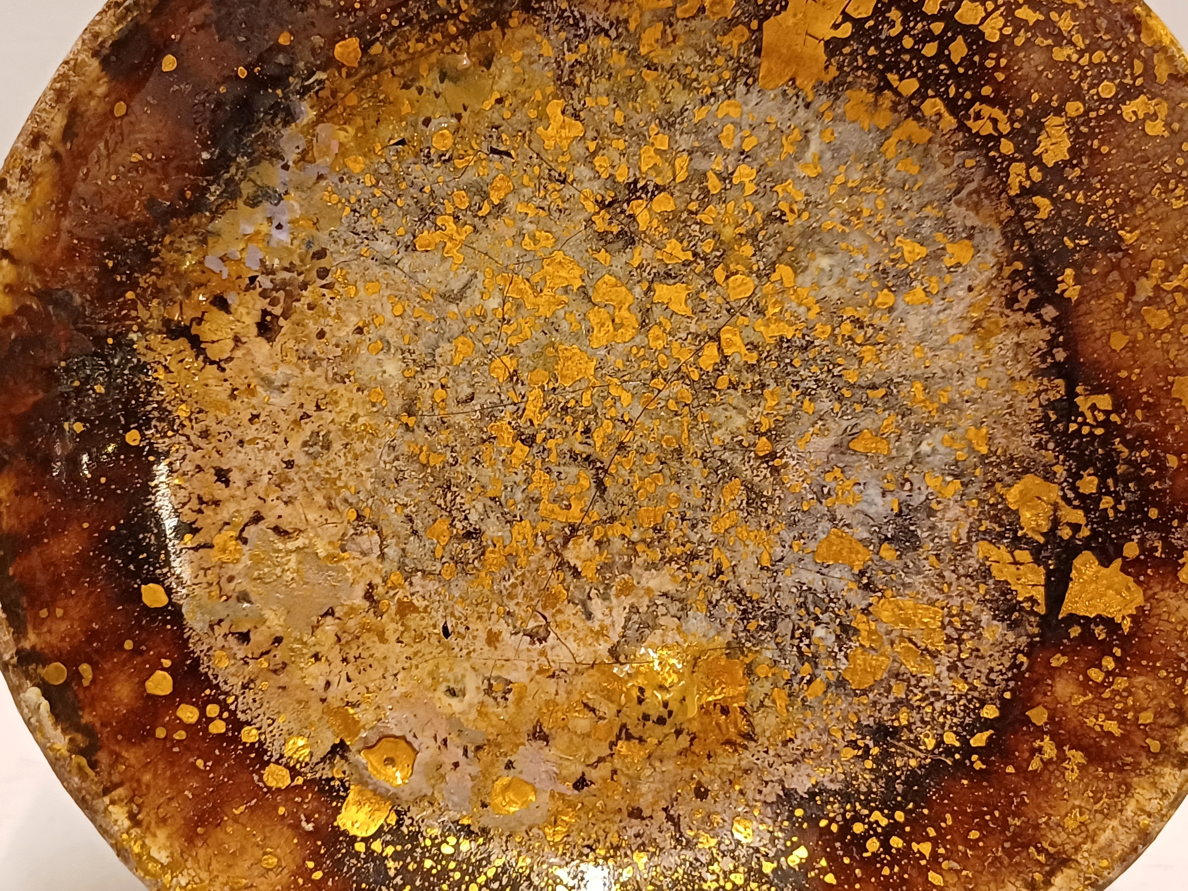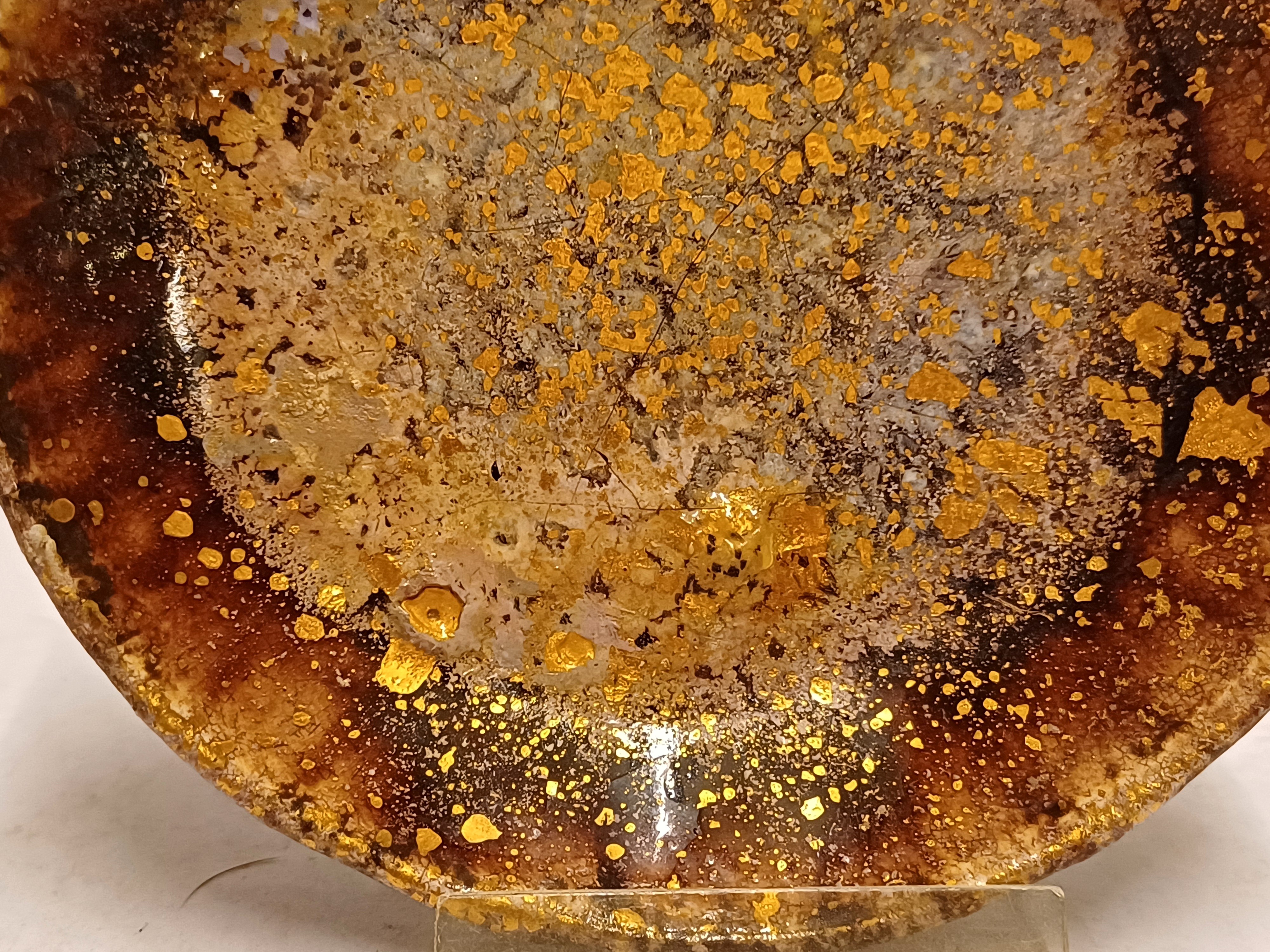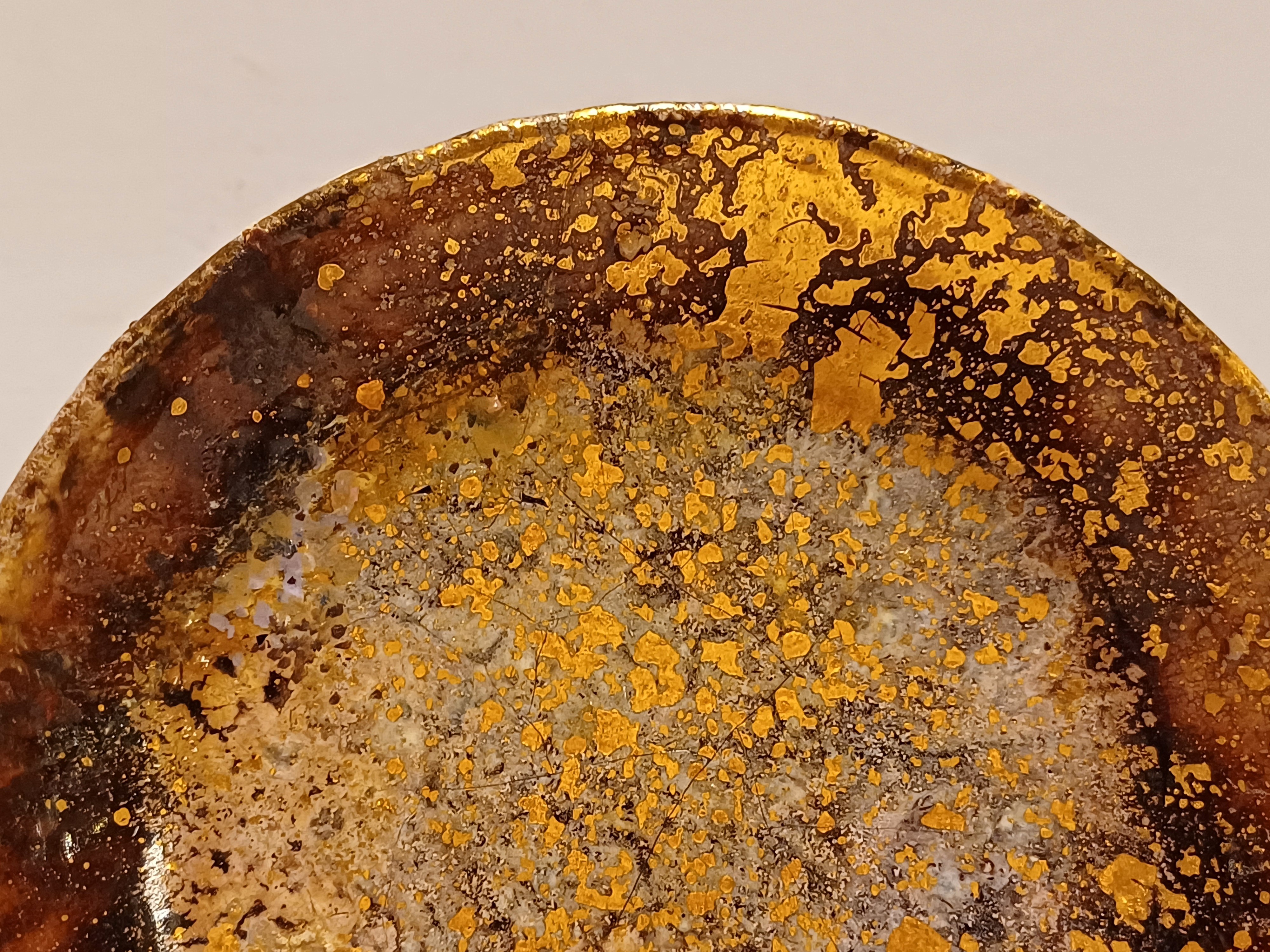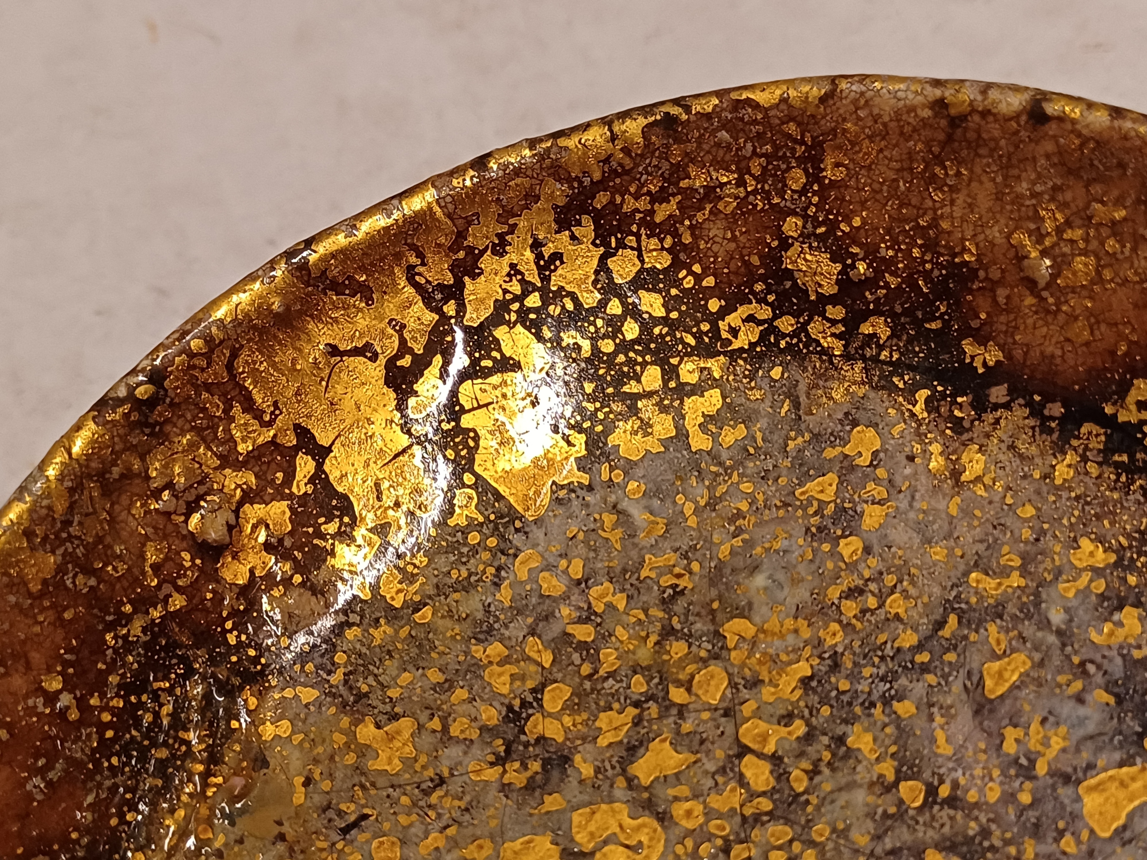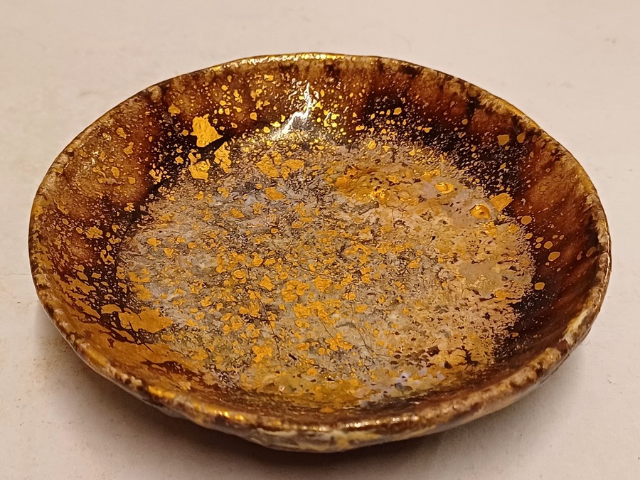 Handgevormd aardewerken schaaltje met donkerbruine glazuur en goud vlokjes. Onderzijde gesigneerd in zwart.