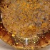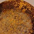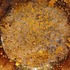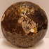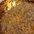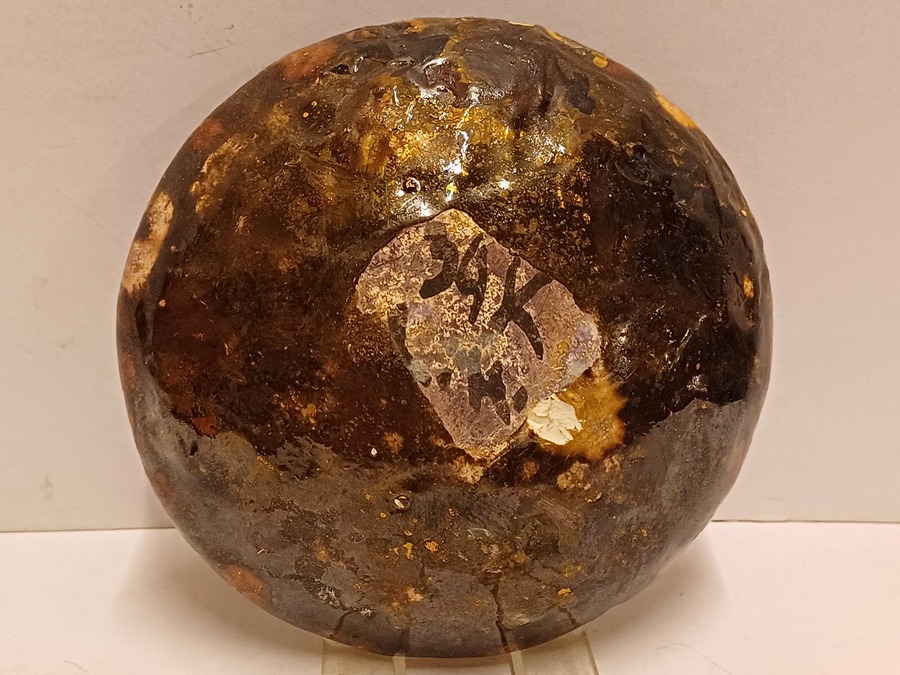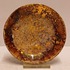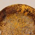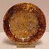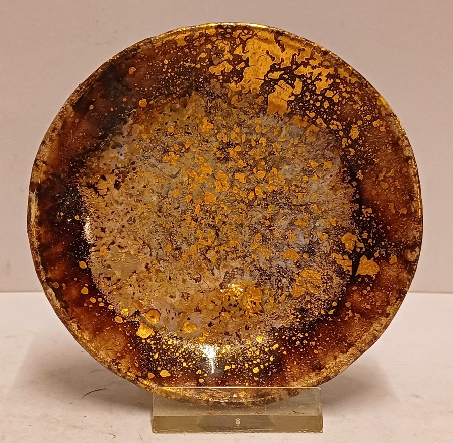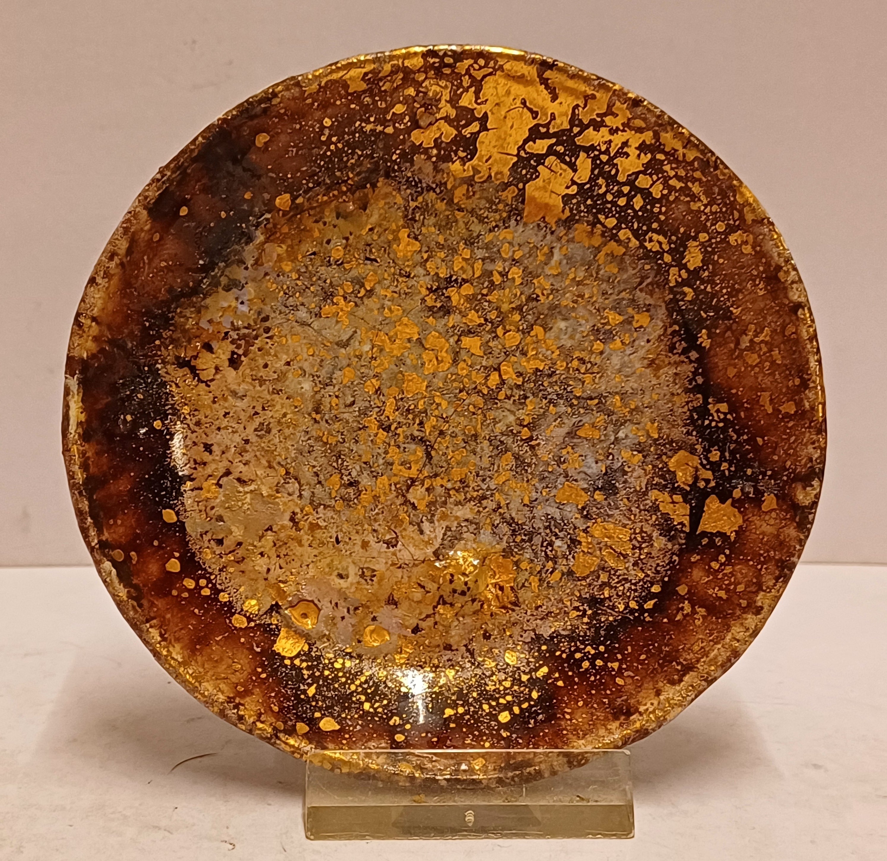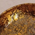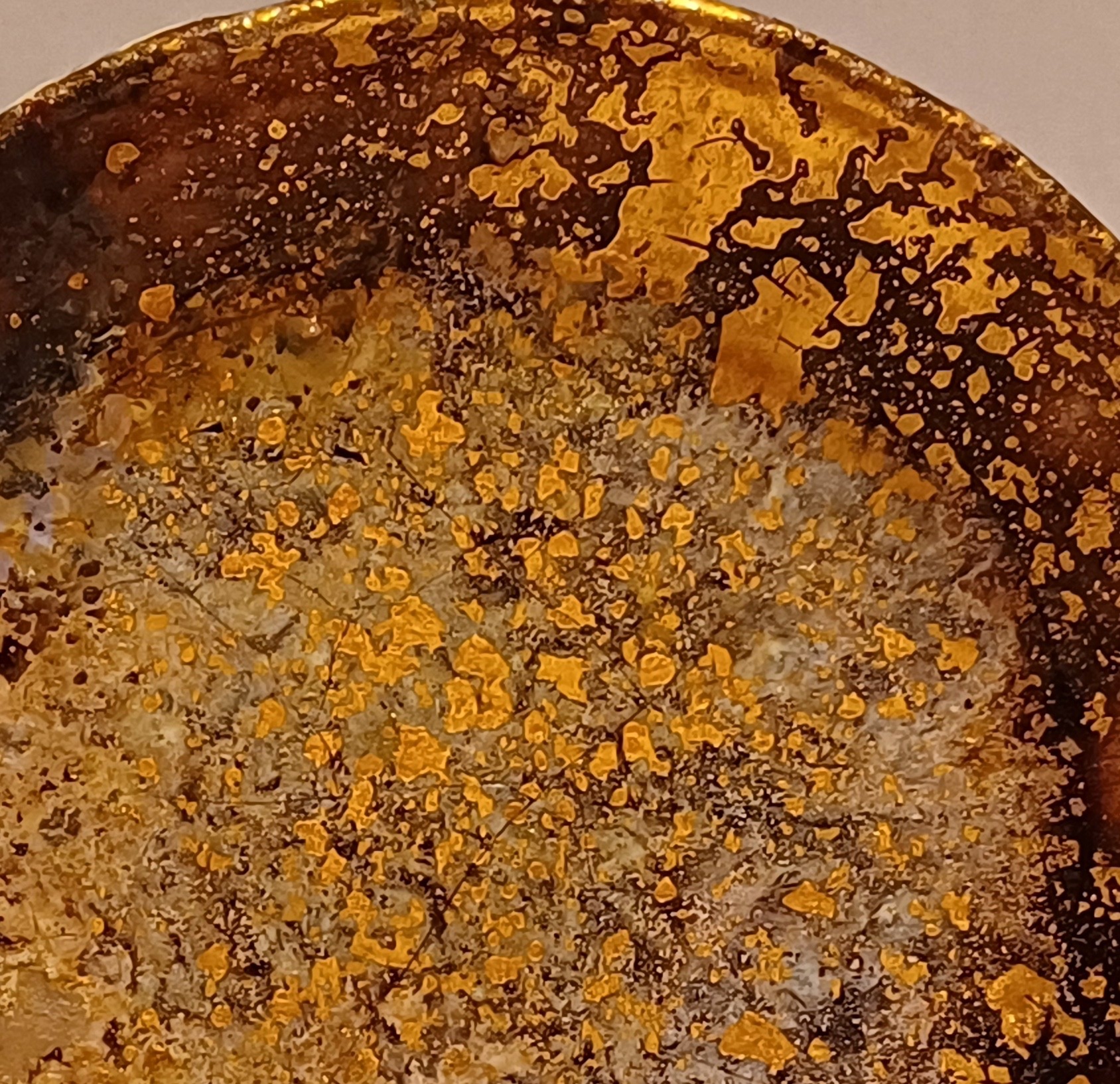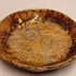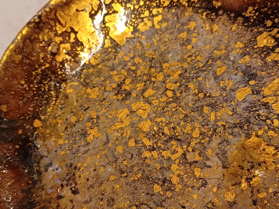 Handgevormd aardewerken schaaltje met donkerbruine glazuur en goud vlokjes. Onderzijde gesigneerd in zwart.