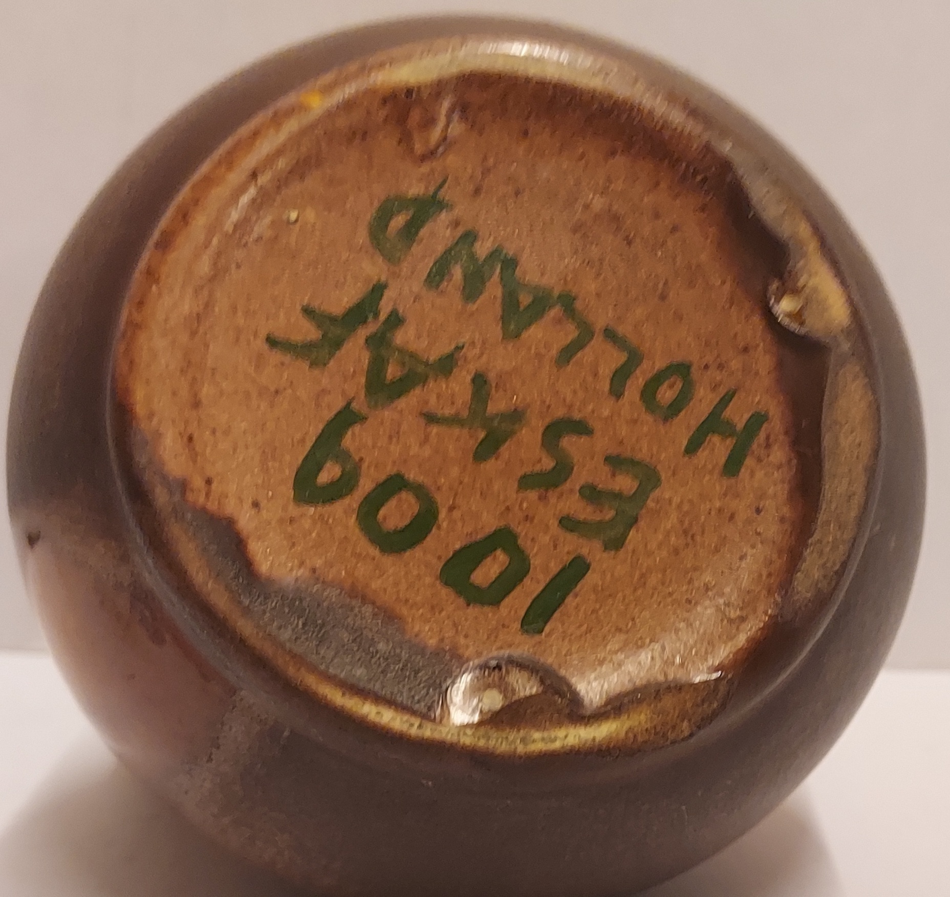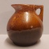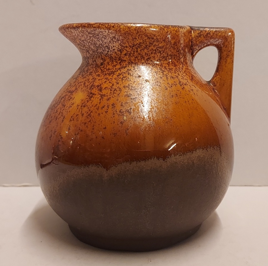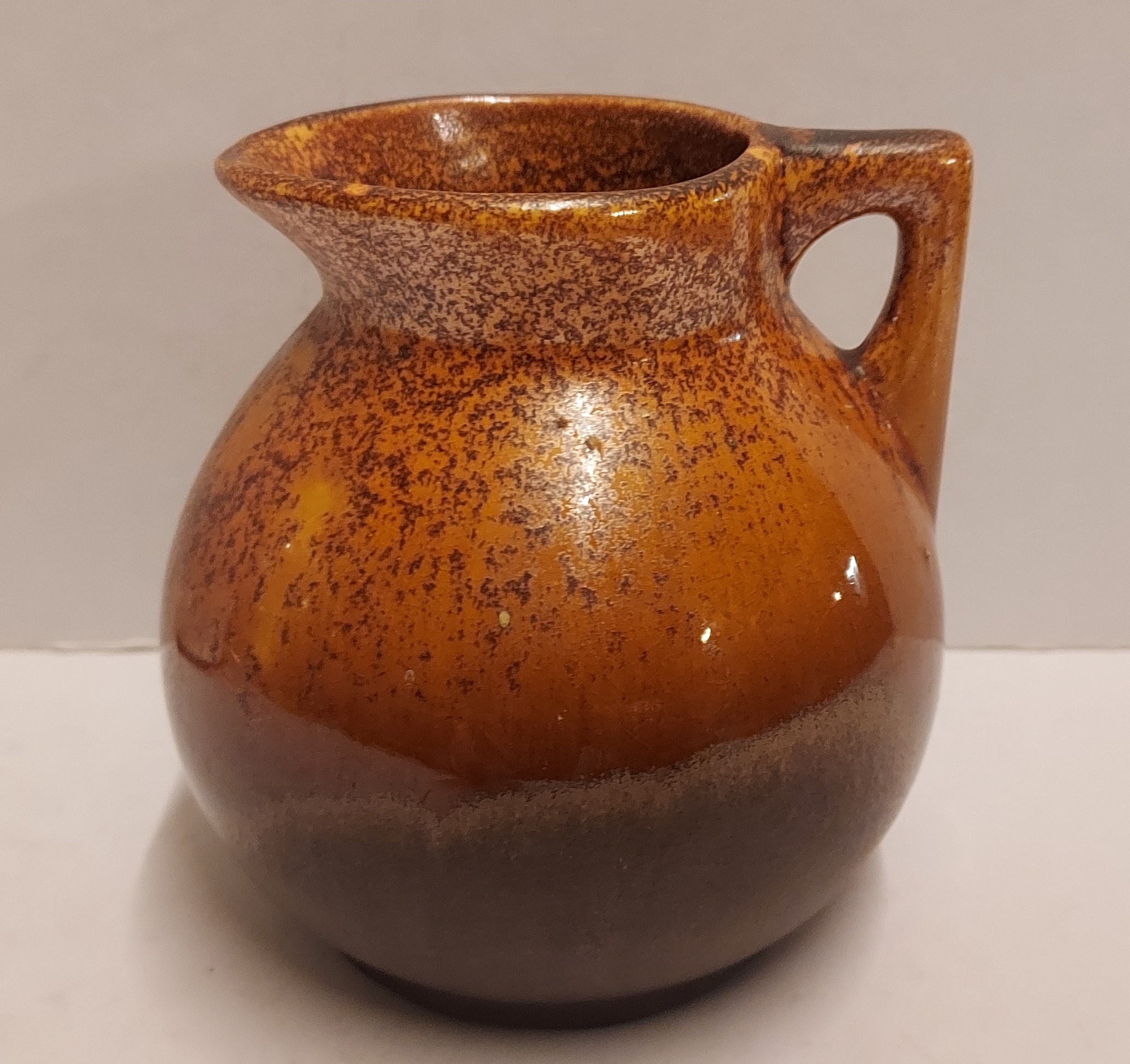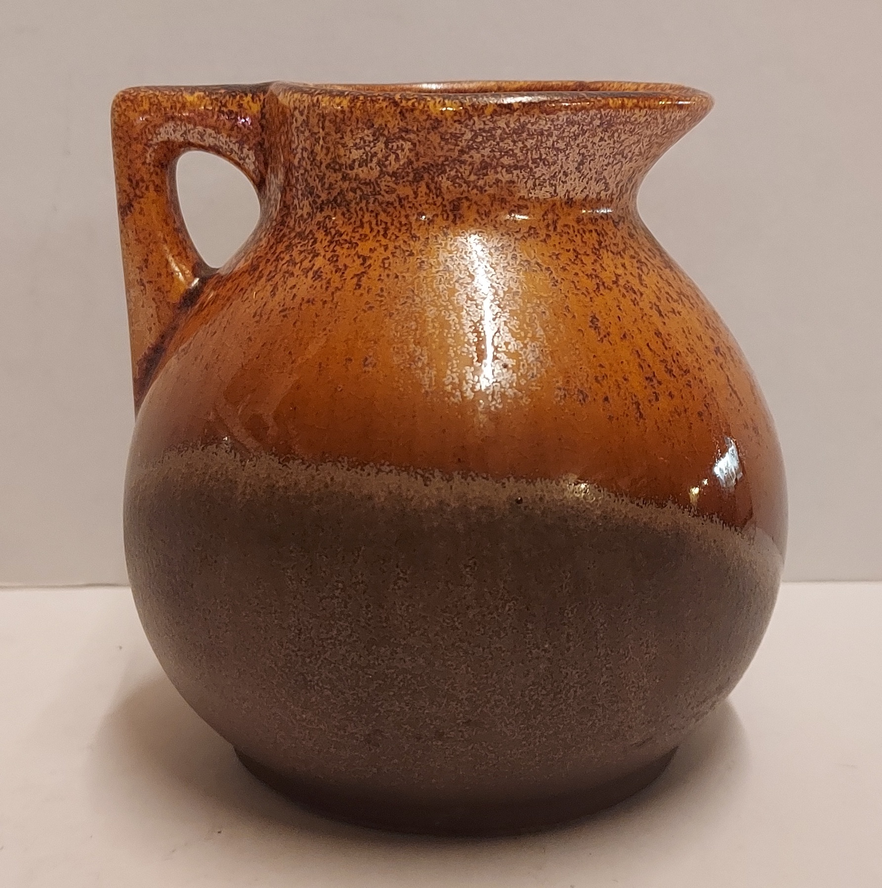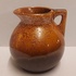 Orange-brown glazed small jug, bottom with painted brand mark.
