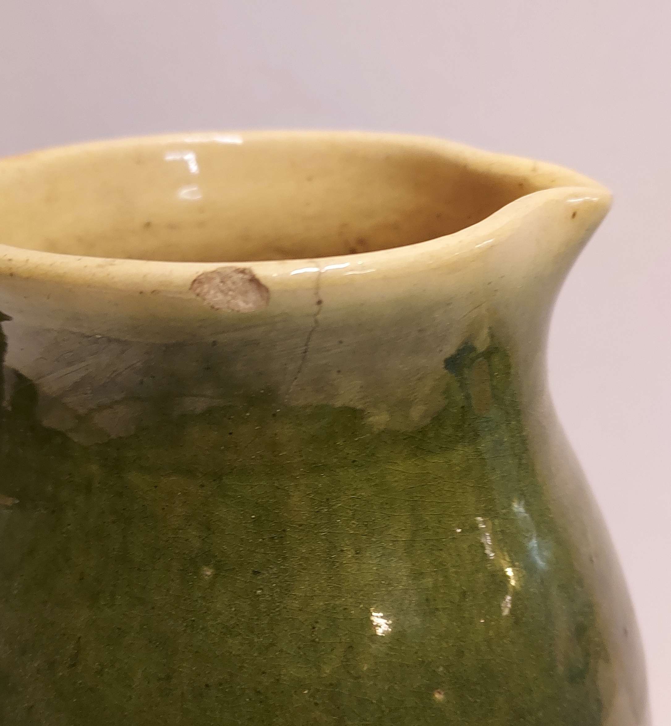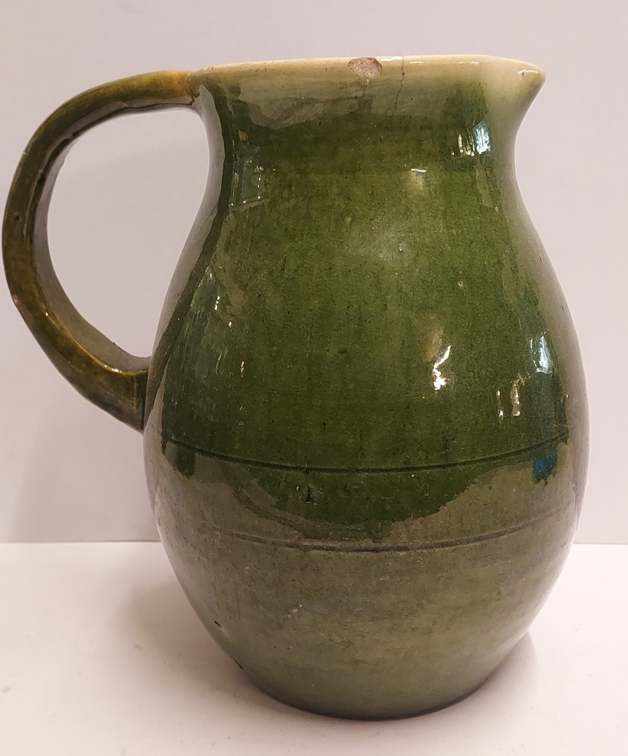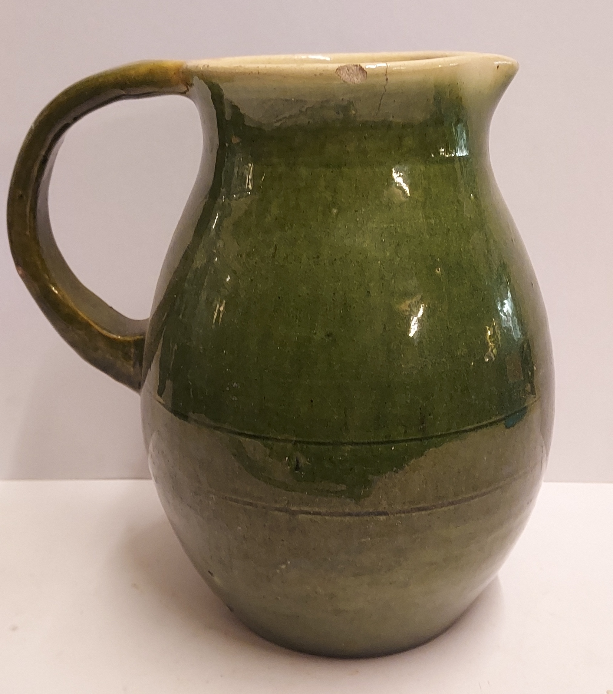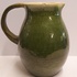 Farmer's green glazed jug with a light yellow glazed interior. Bottom with factory mark and model number.