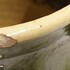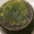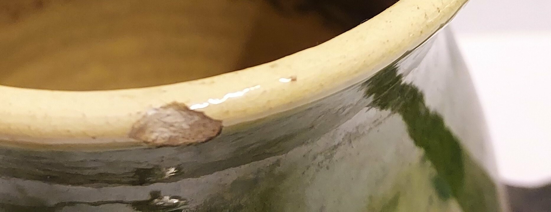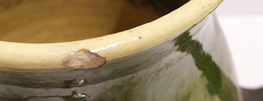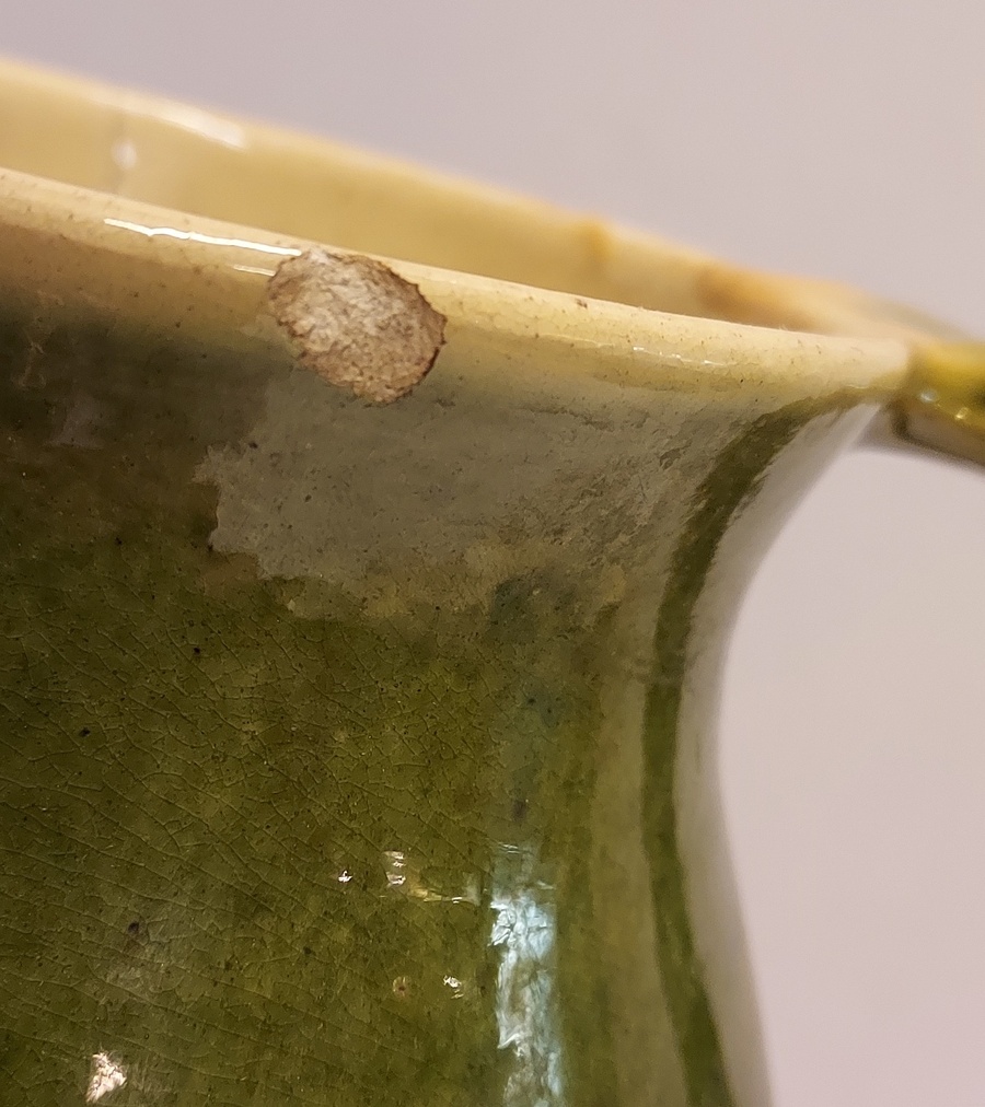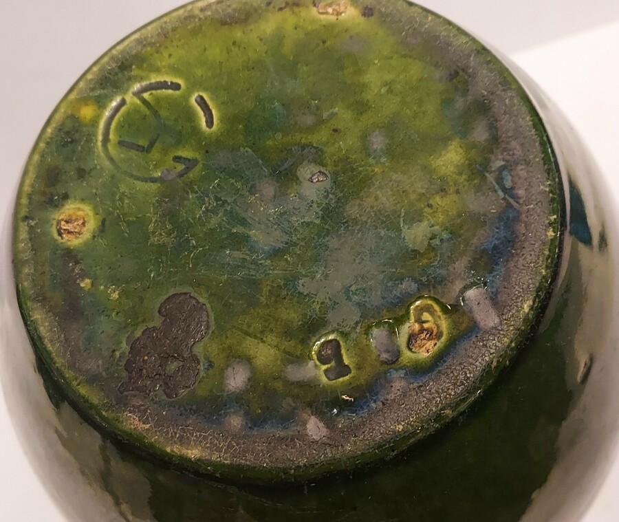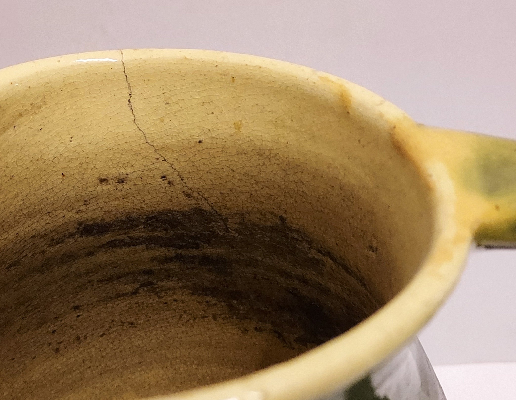 Farmer's green glazed jug with a light yellow glazed interior. Bottom with factory mark and model number.