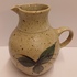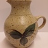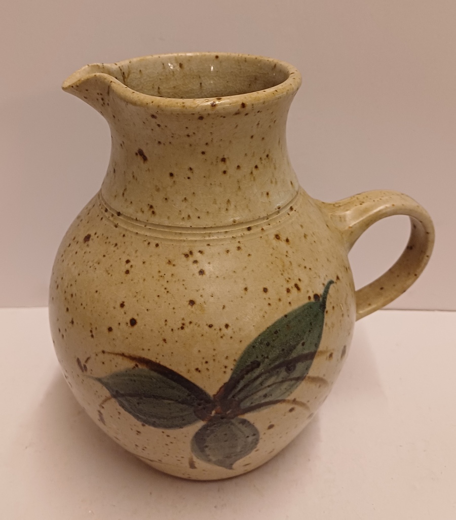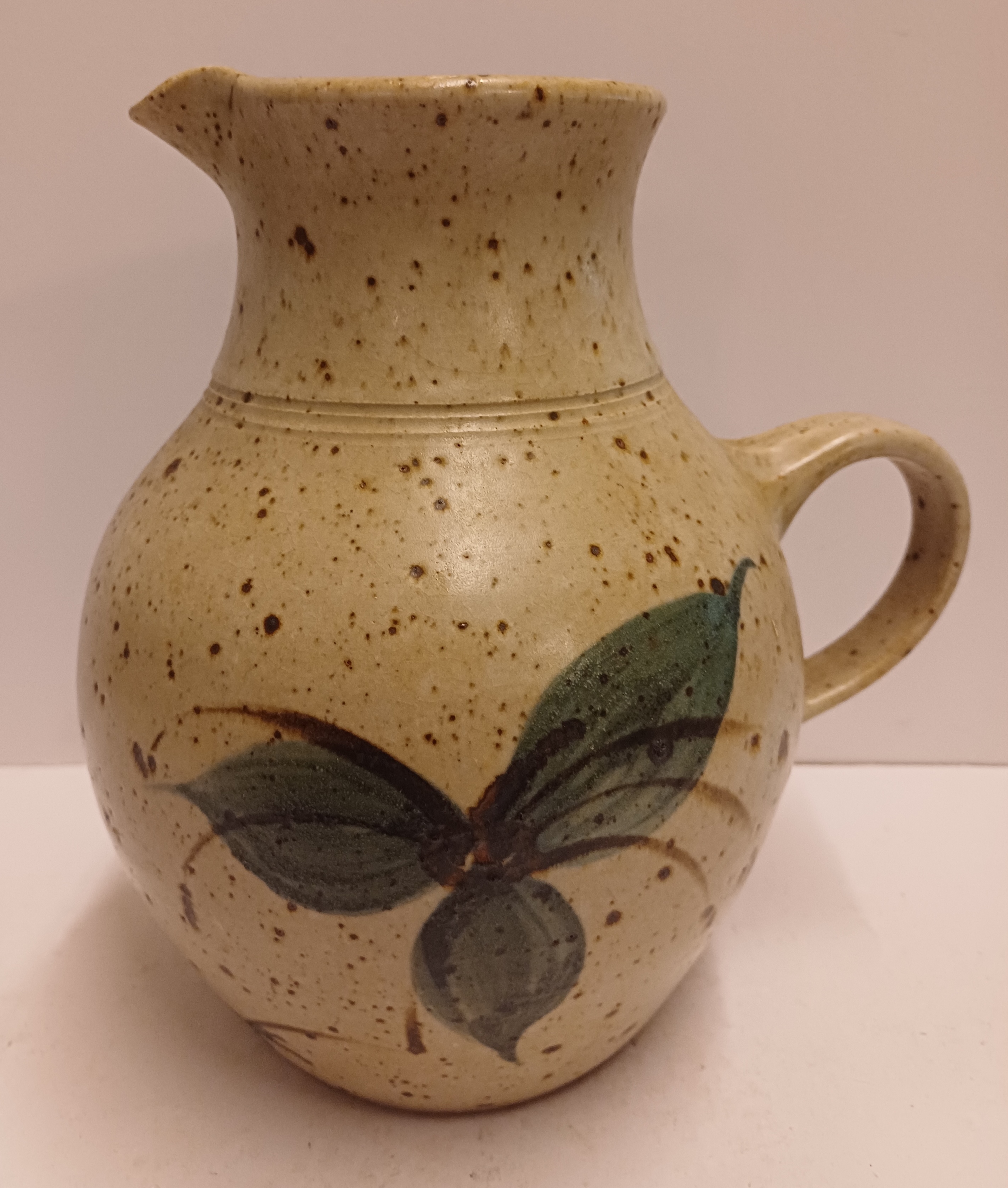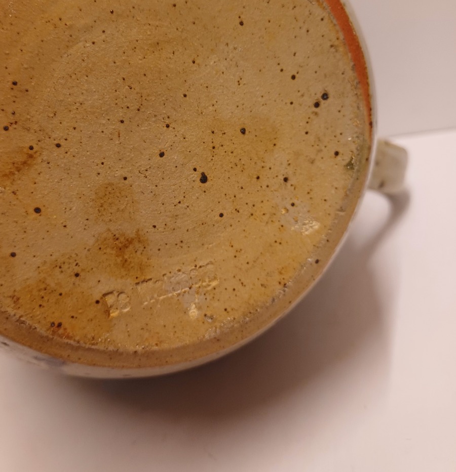 Stoneware jug with blue leaf decor on a grey background. Bottom marked De Walsberg.