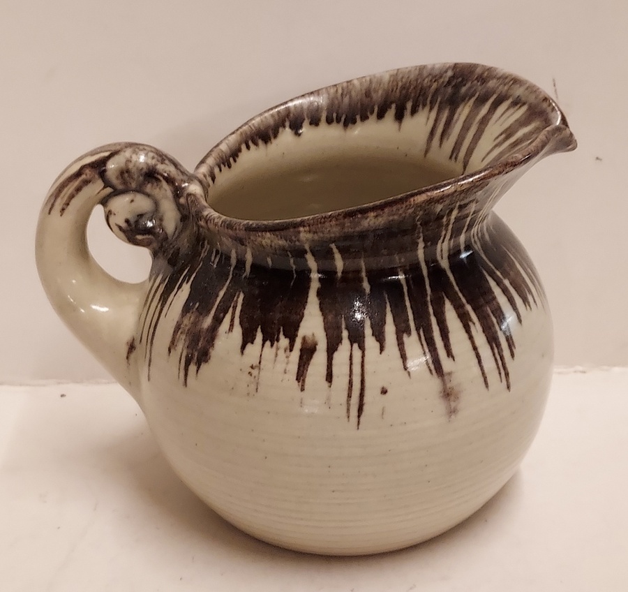 Pouring jug with beige glaze and dark brown edge. Marked on the bottom.