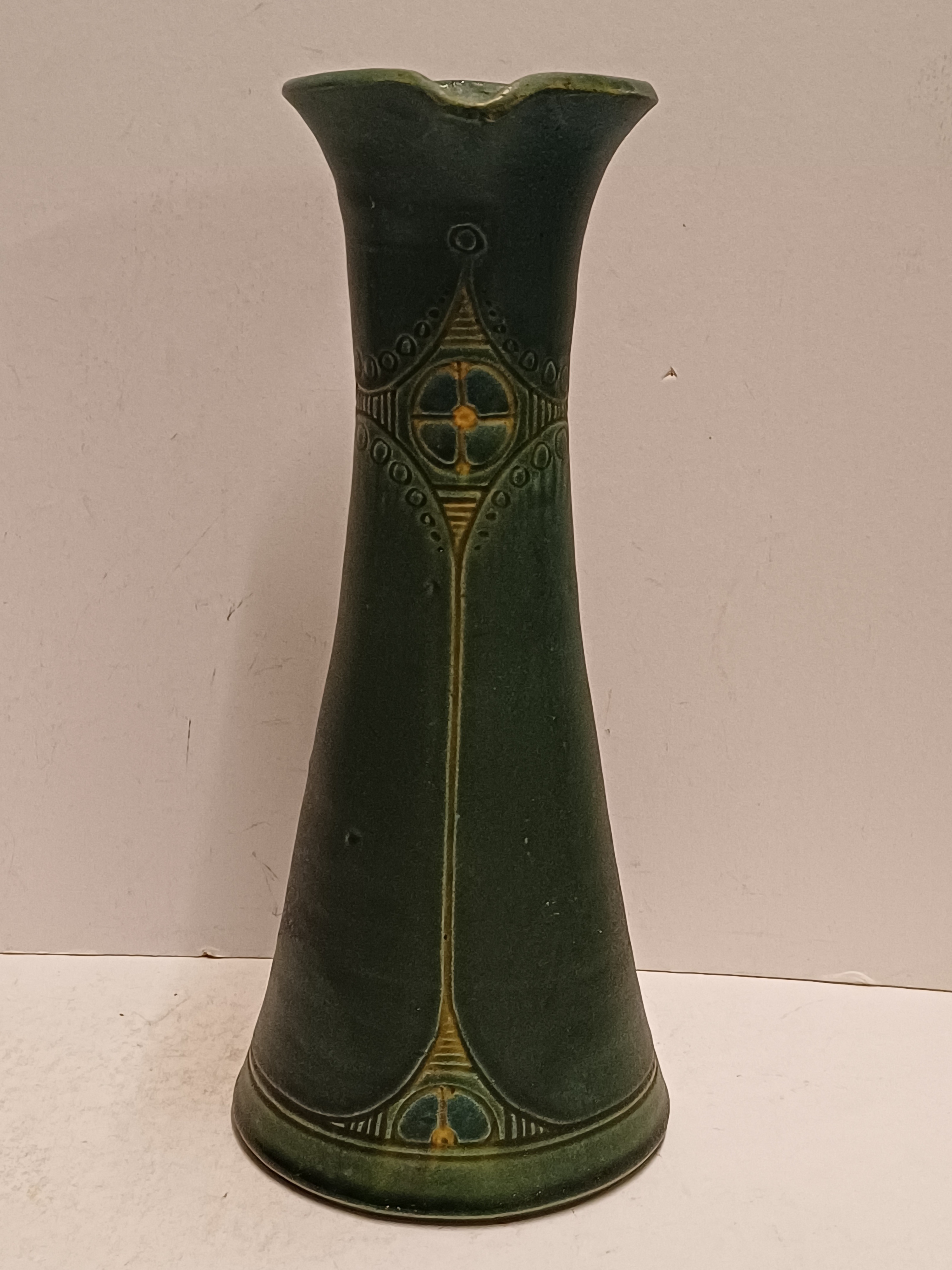 Vroege schenkkan met uitgespaarde lineair decor op blauwe ondergrond. Niet gesigneerd.