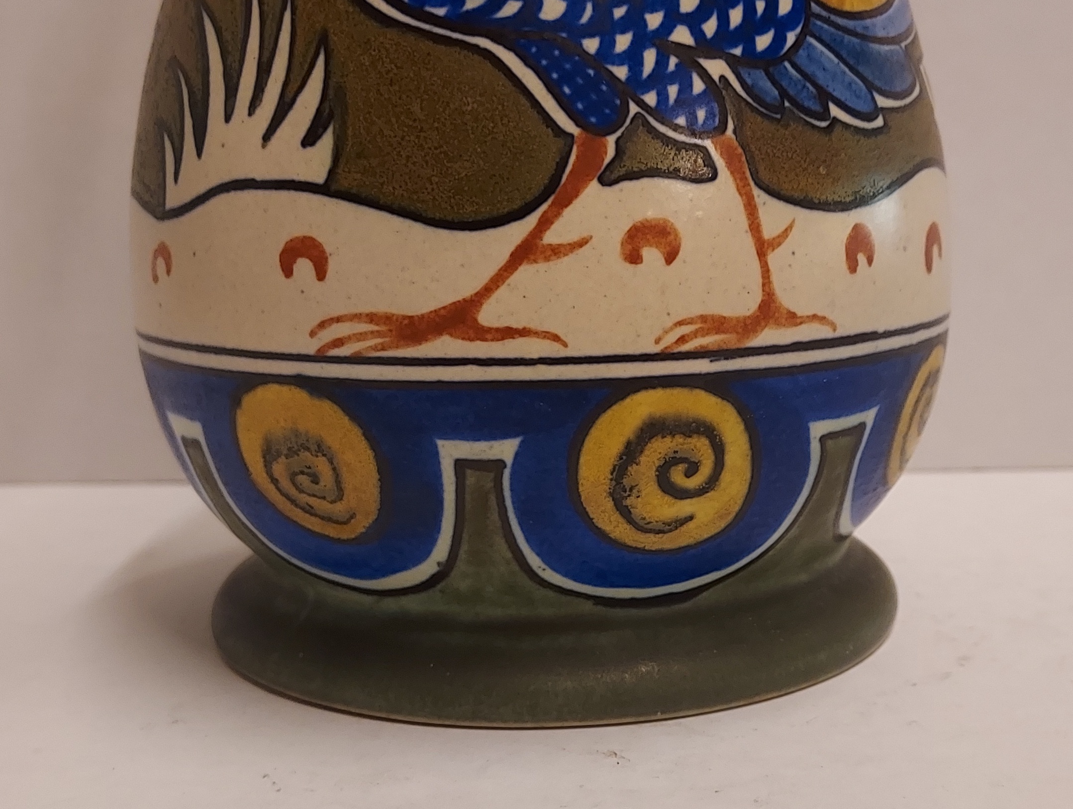 Decoration of peacocks in landscape and bands with repeating pattern. Underside with factory mark.