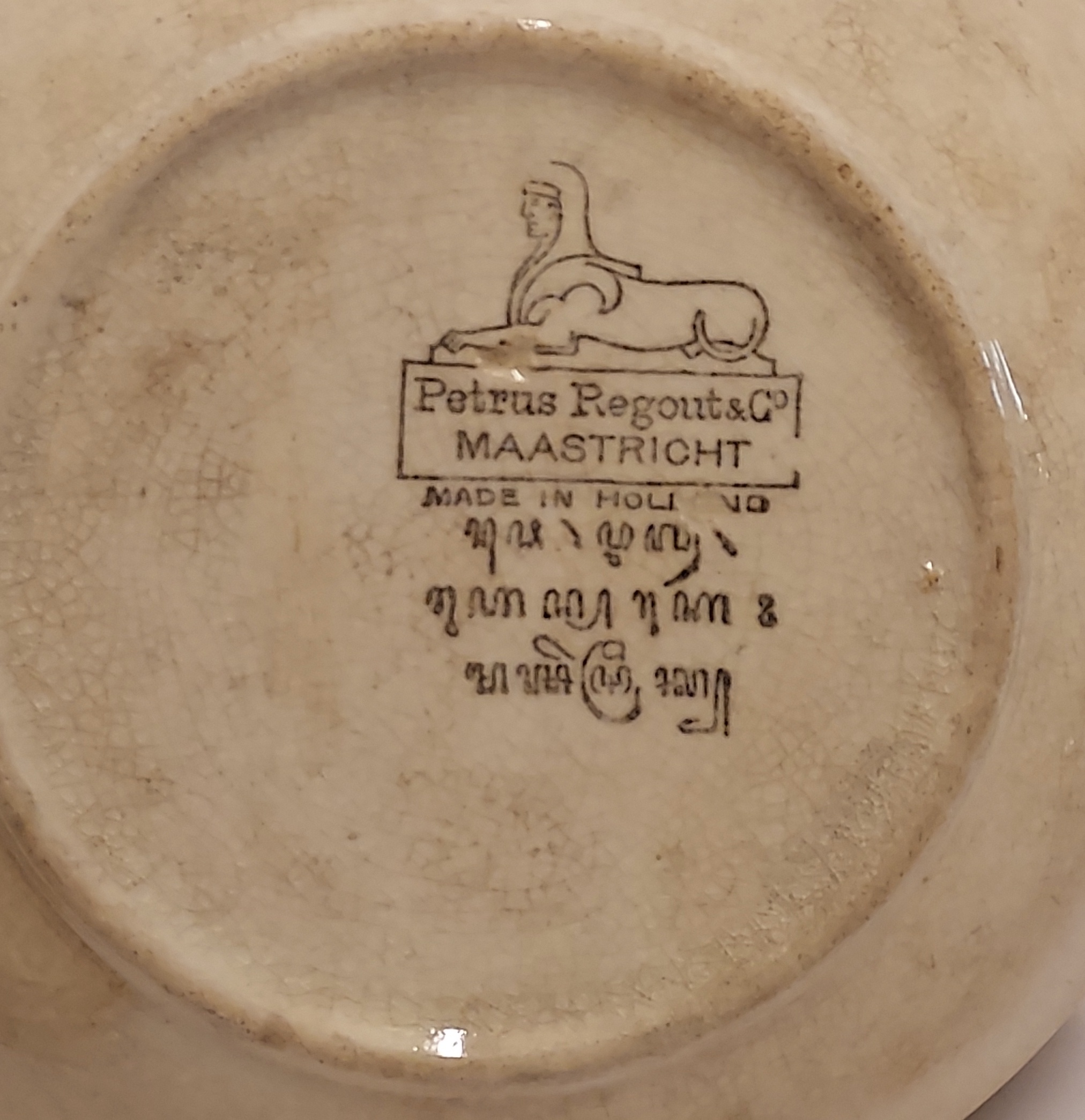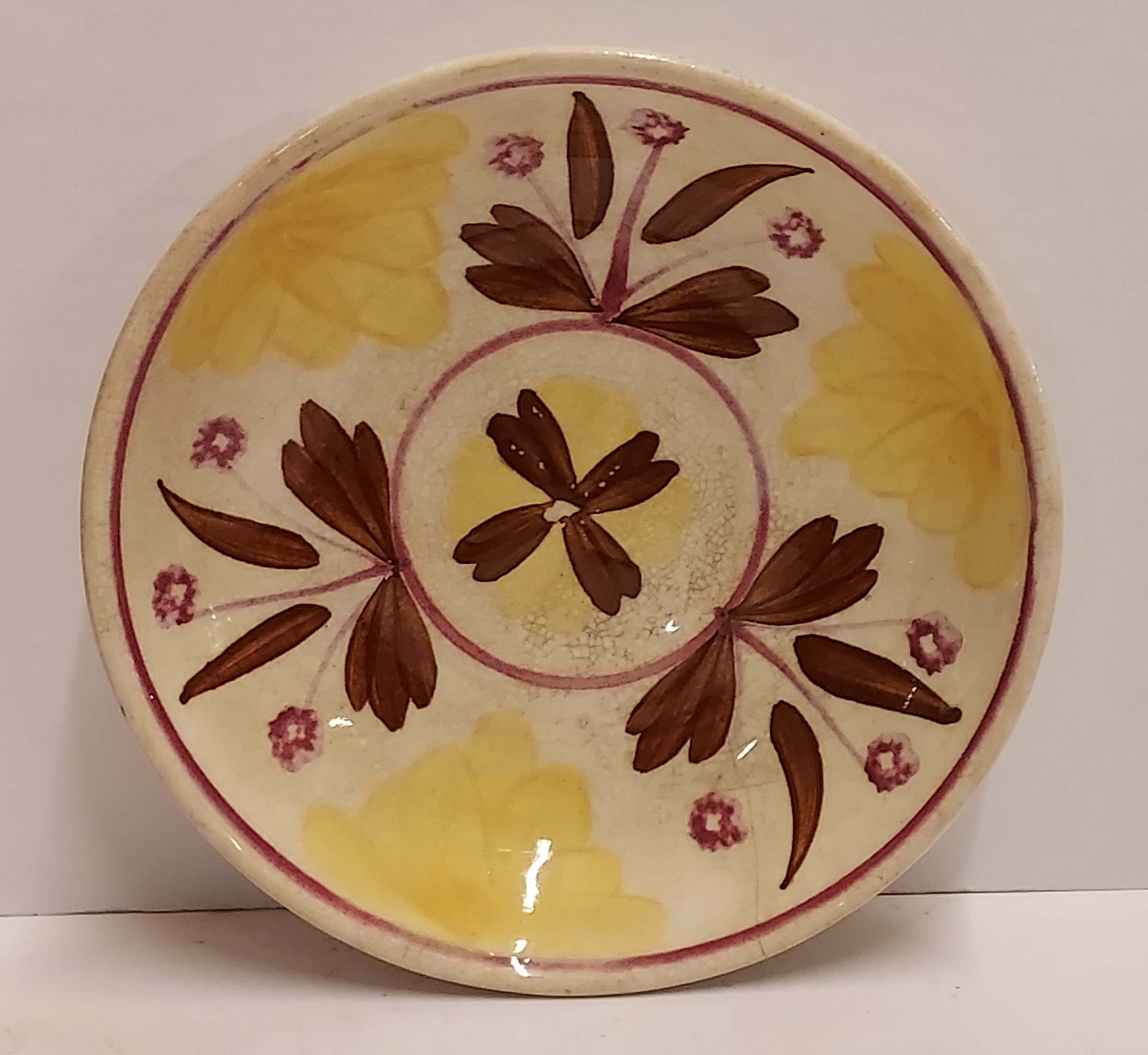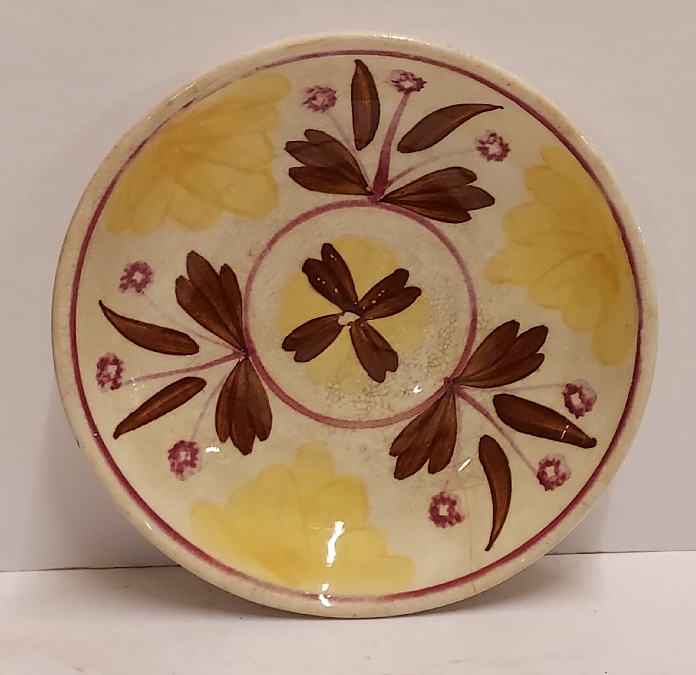 With yellow and brown floral decor. Reverse side with factory mark and Javanese export mark.