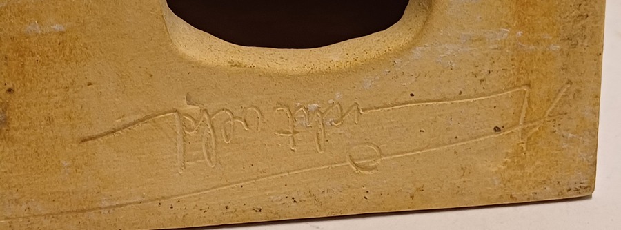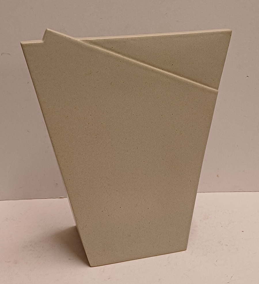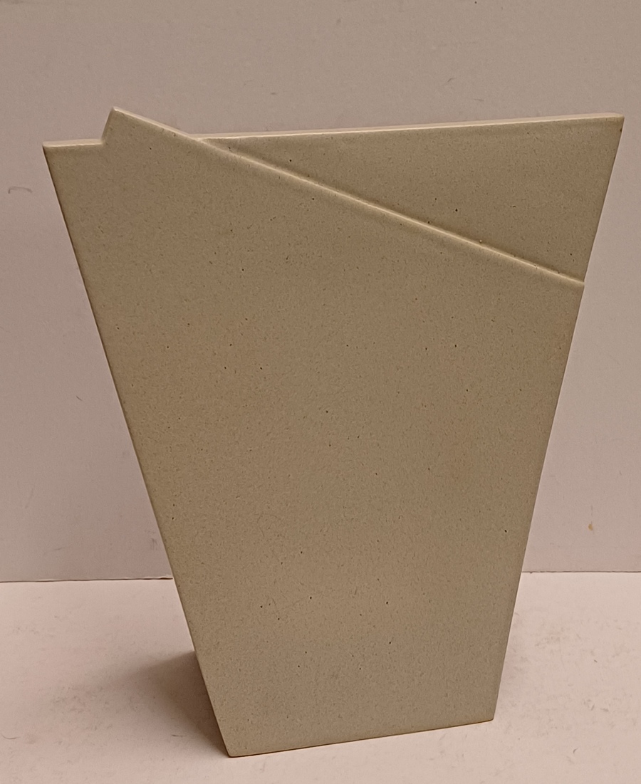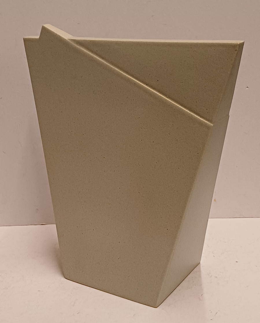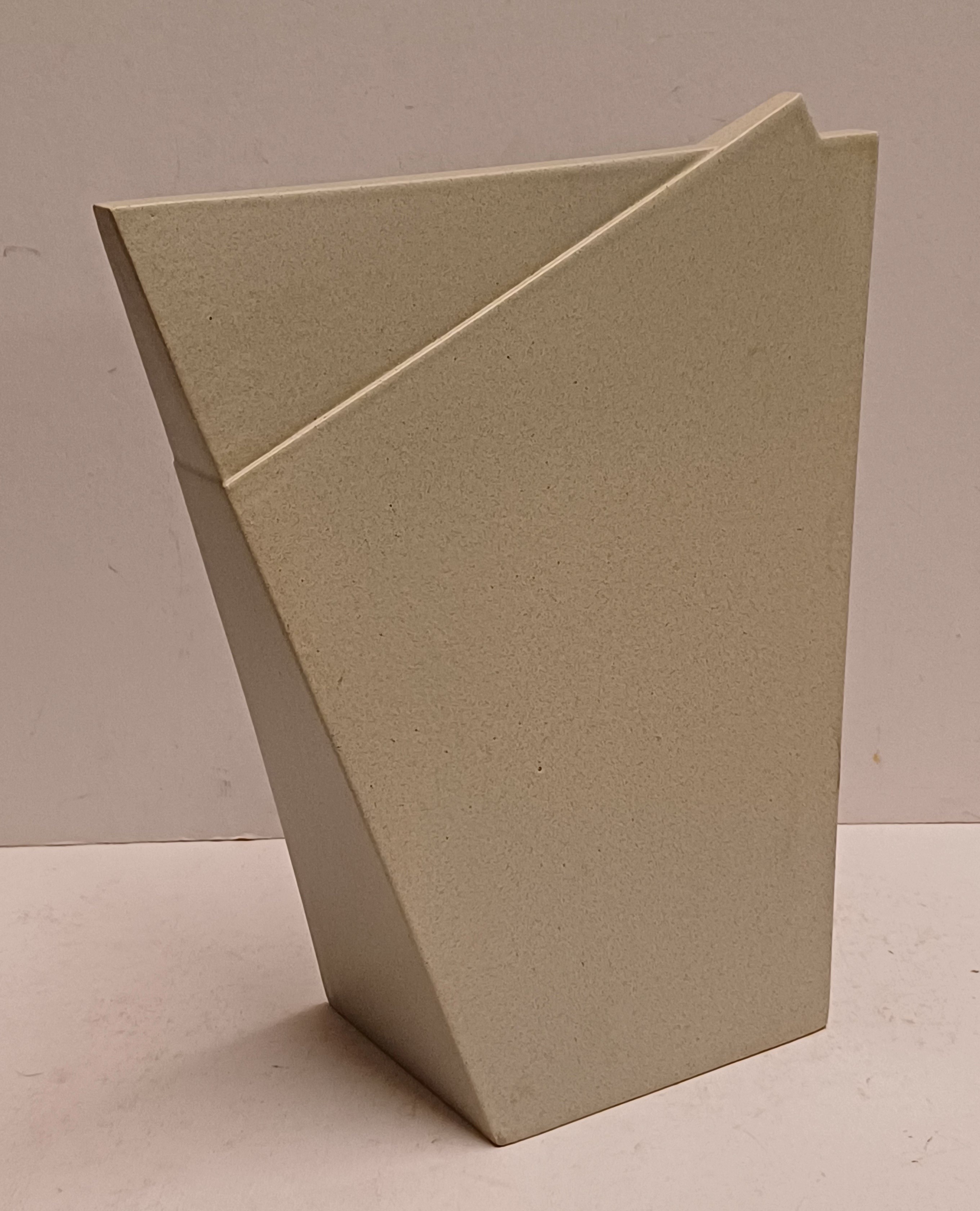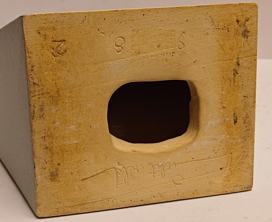 Stoneware geometric sculpture with gray glaze. Fully signed on the bottom.