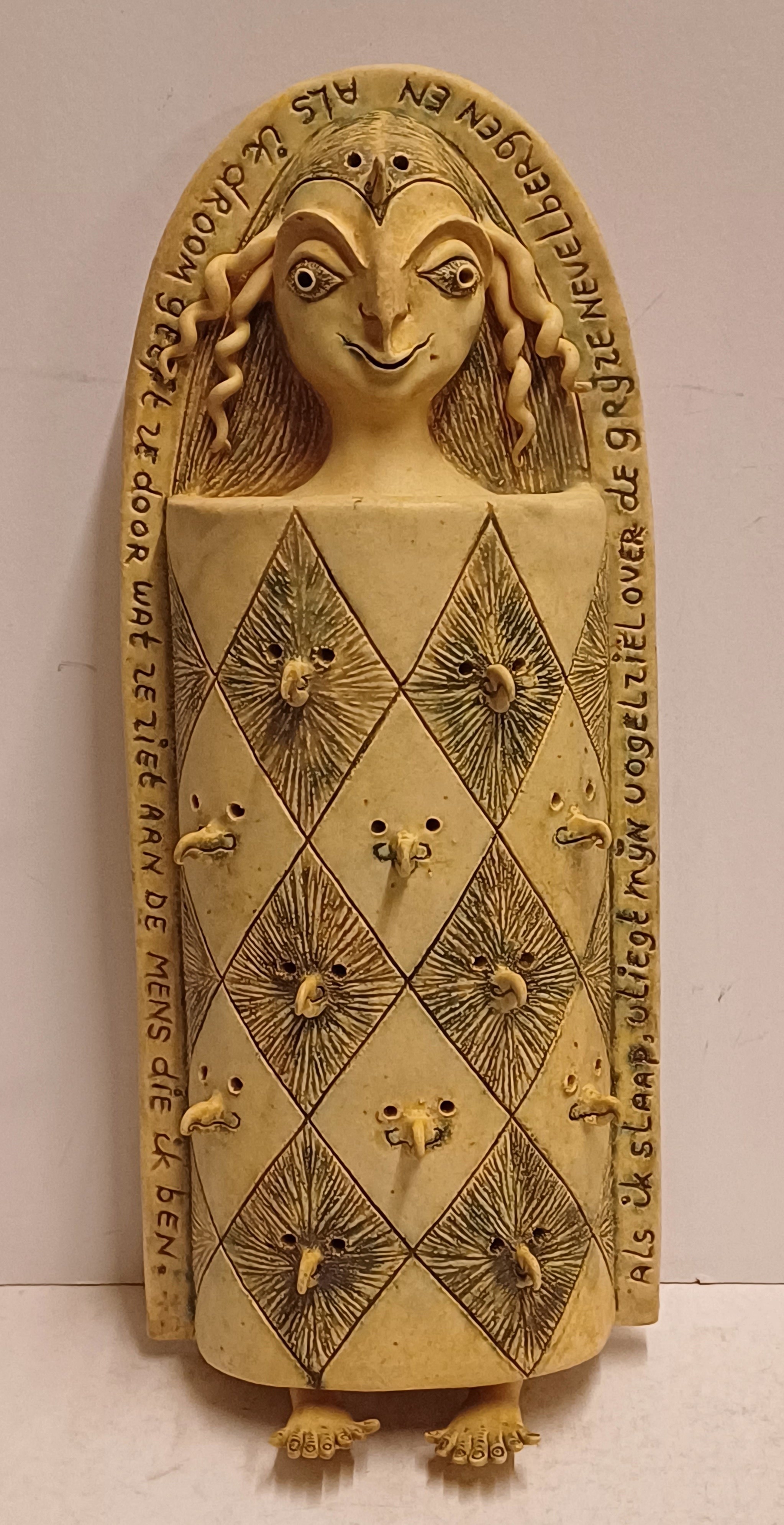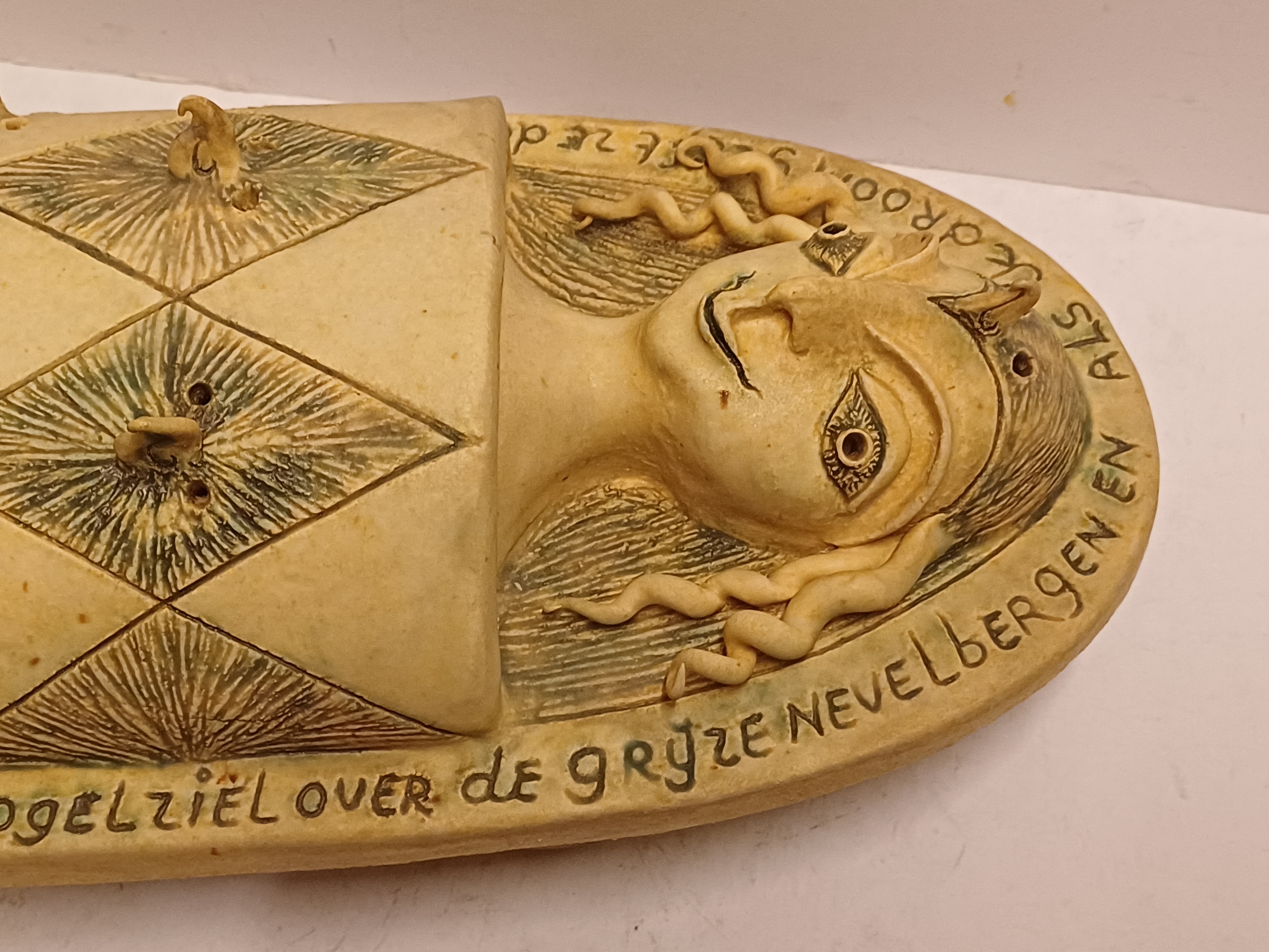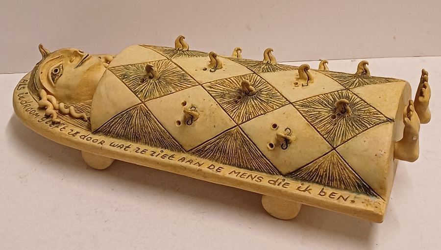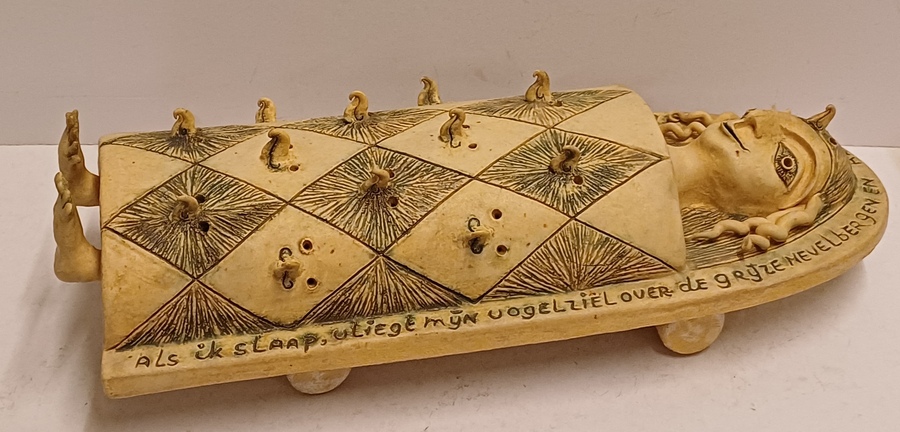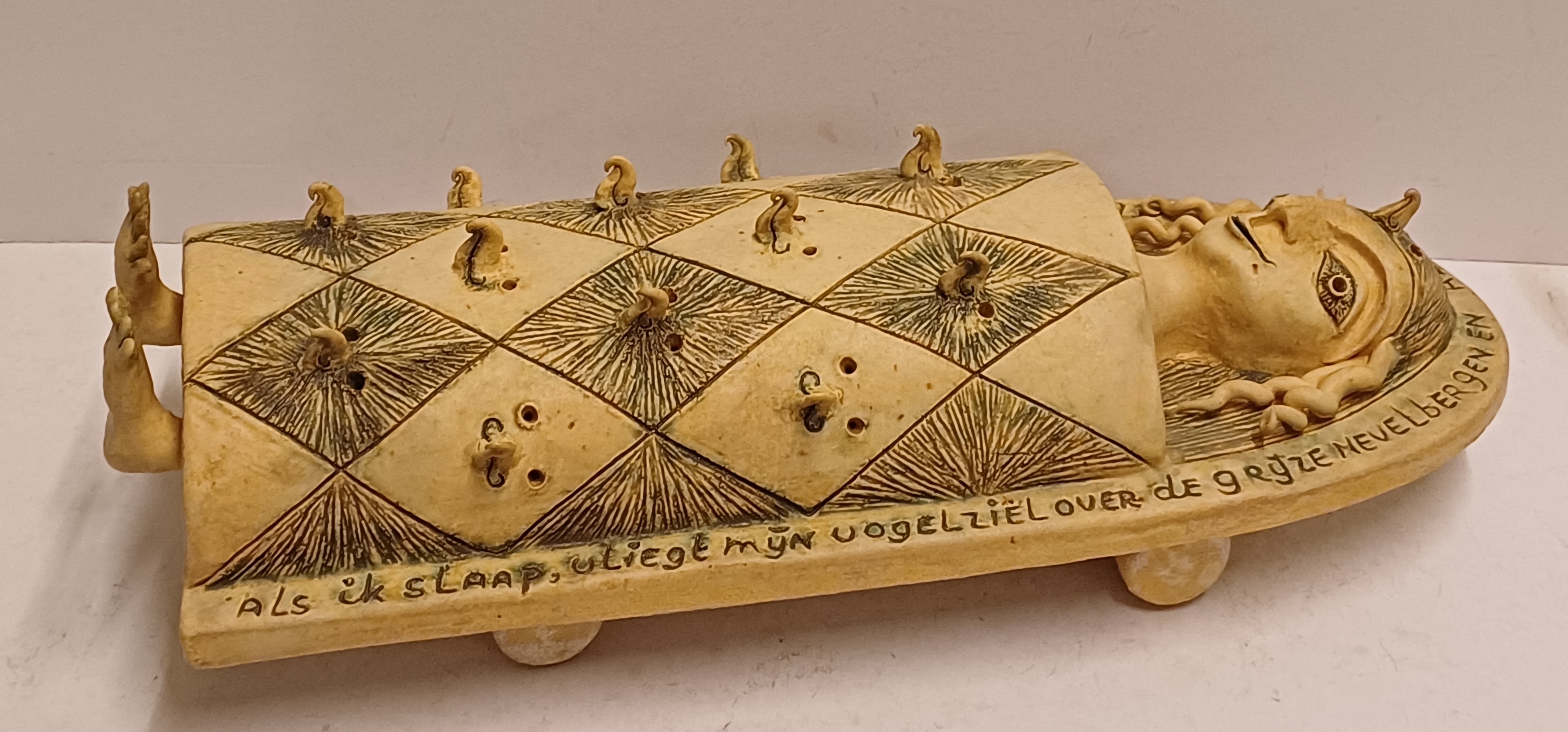 "Sleeping Girl" - Large reclining ceramic sculpture of a sleeping girl in bed. Signed and dated '72.