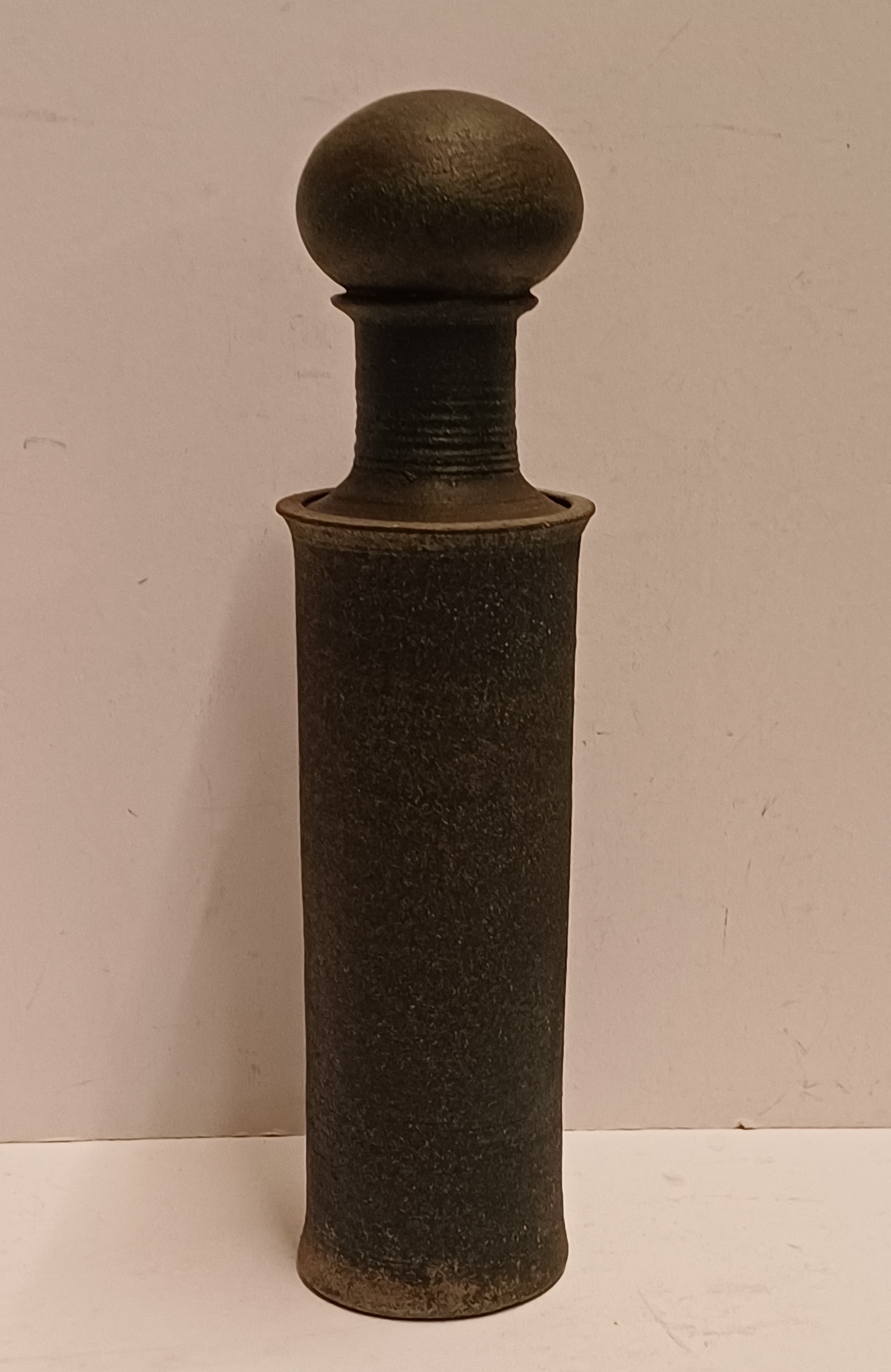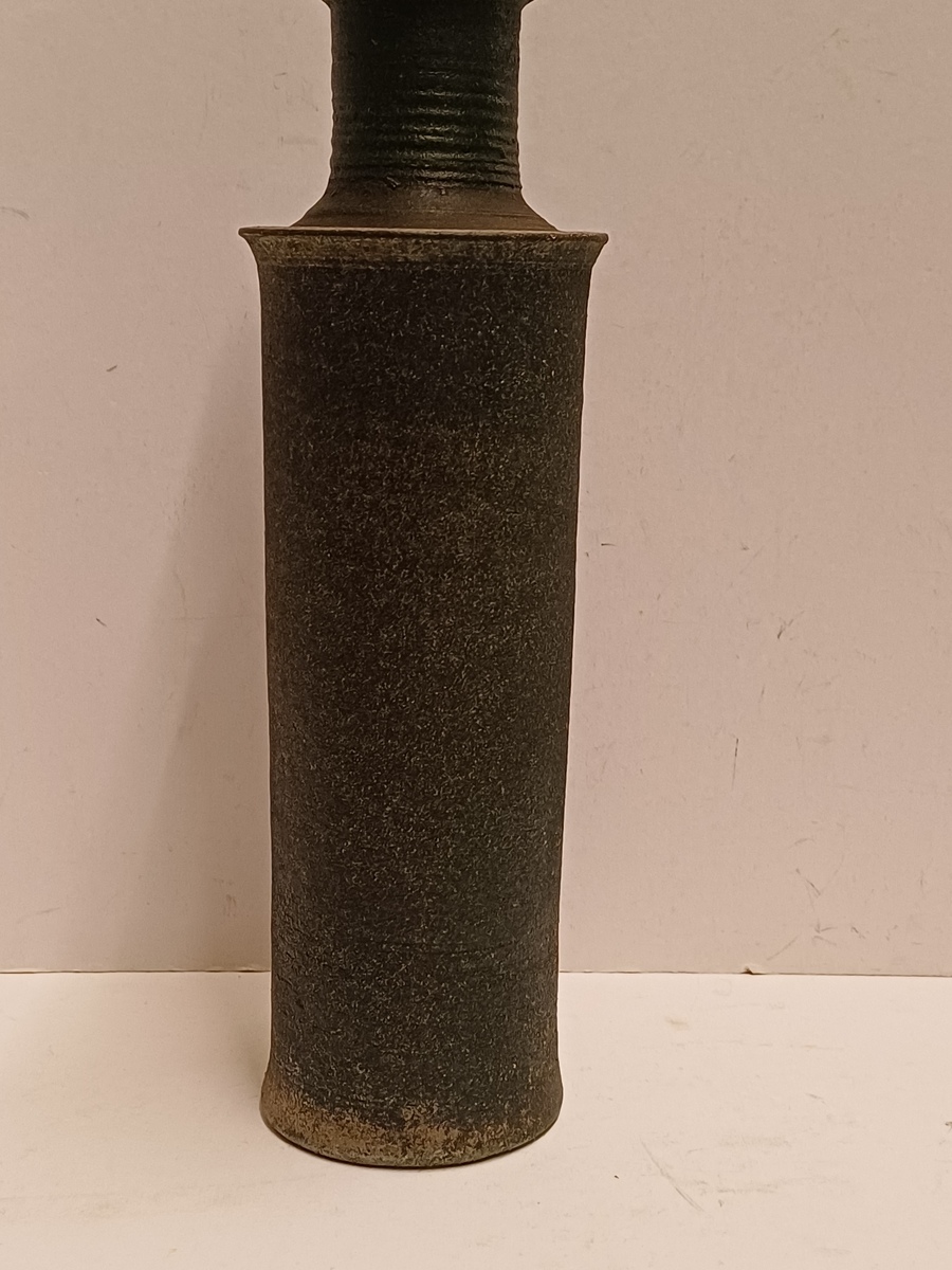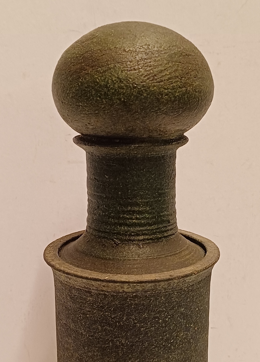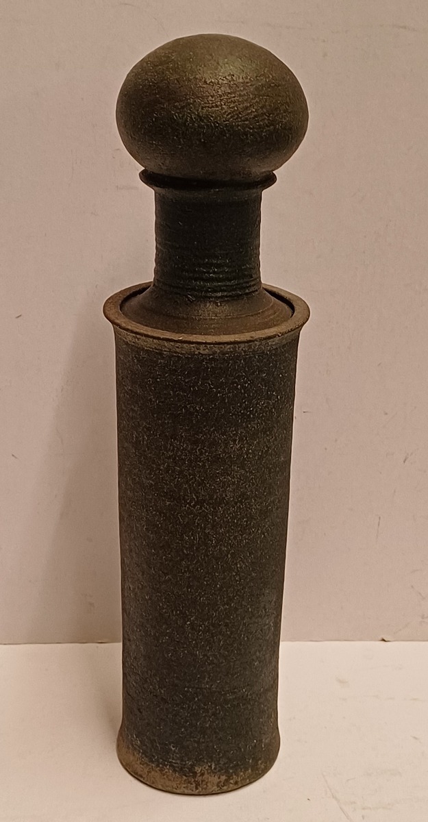 Slanke dekselpot met donkergroene glazuur op ruwe ondergrond. Onderzijde gemerkt en gedateerd.