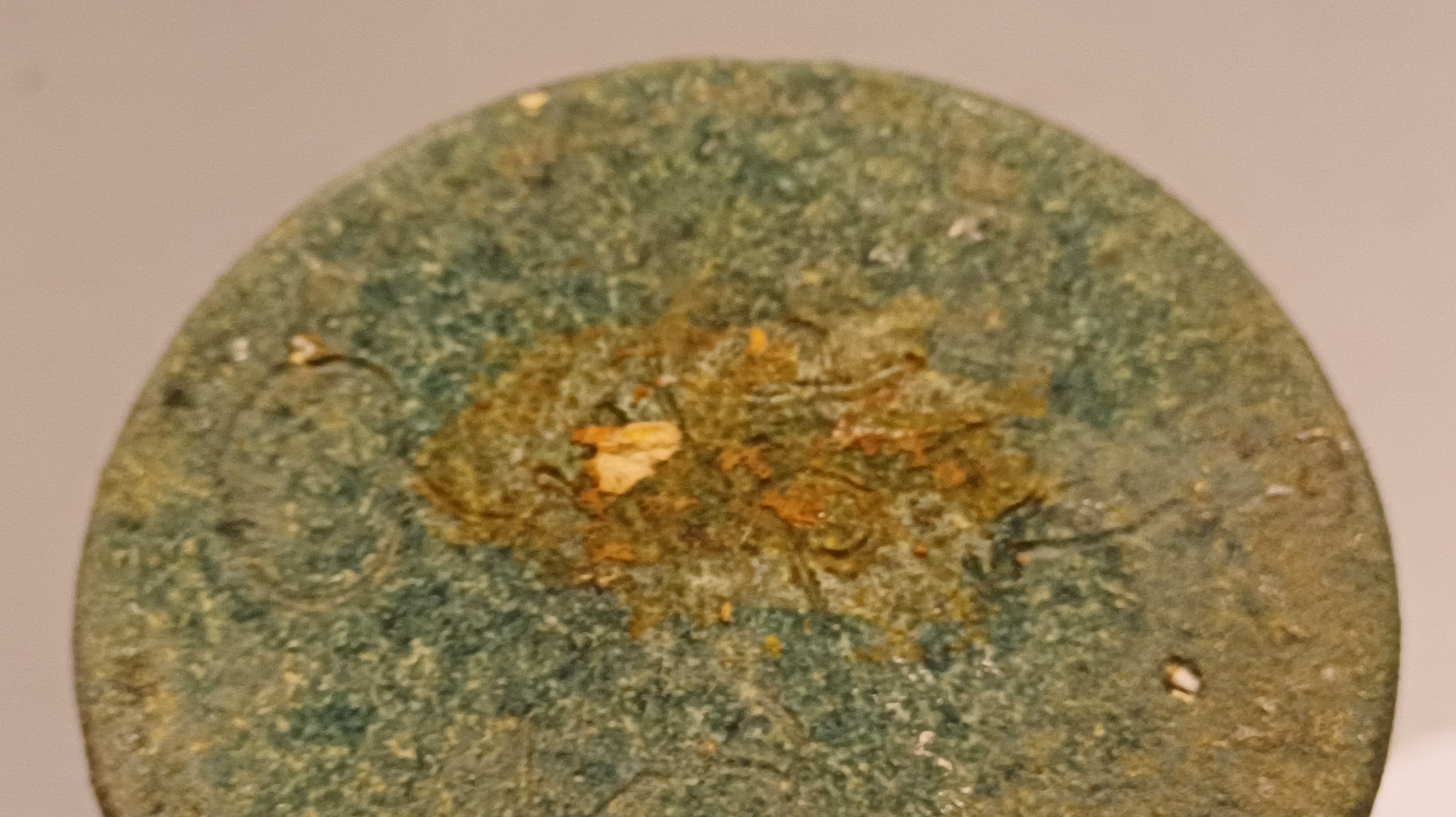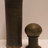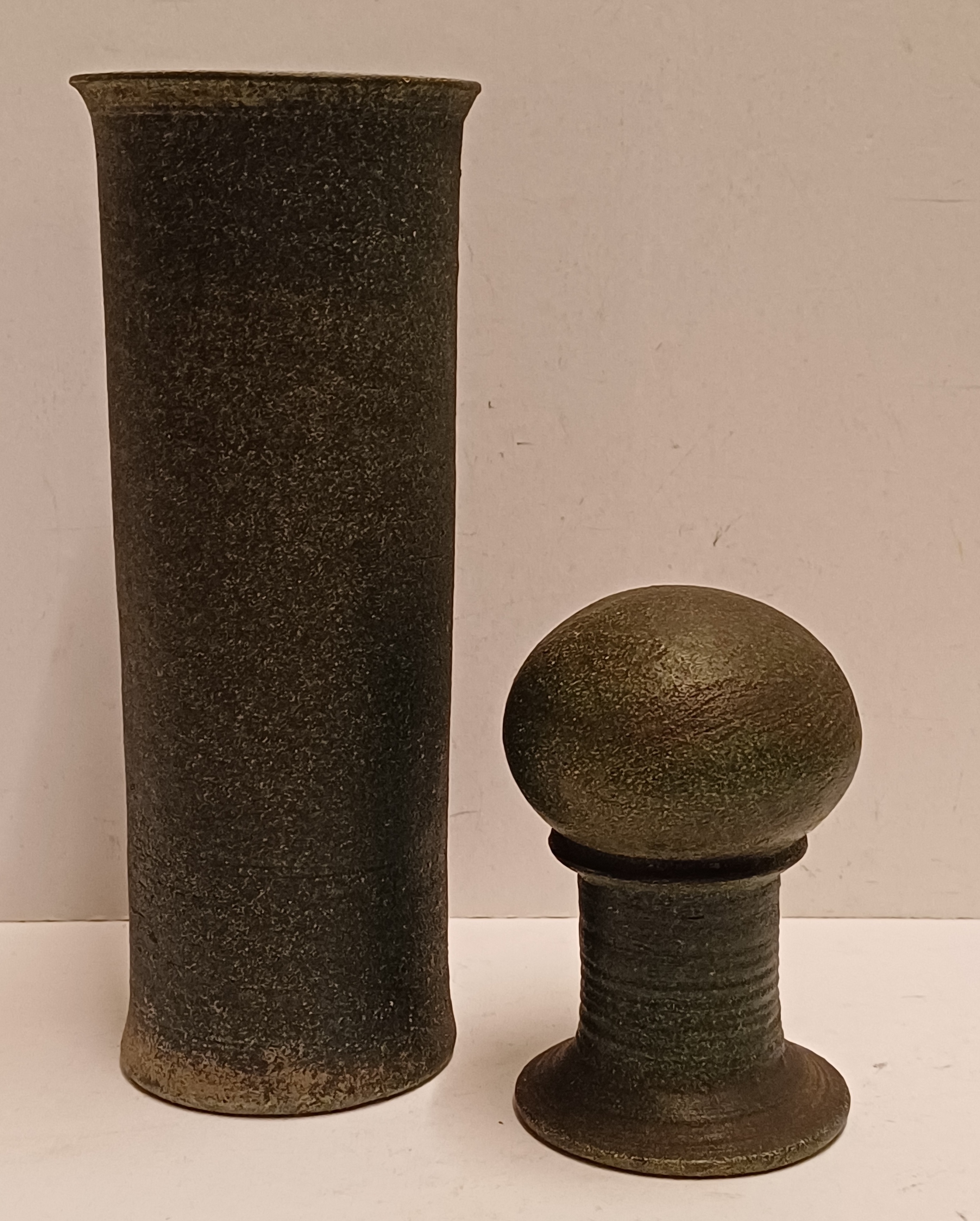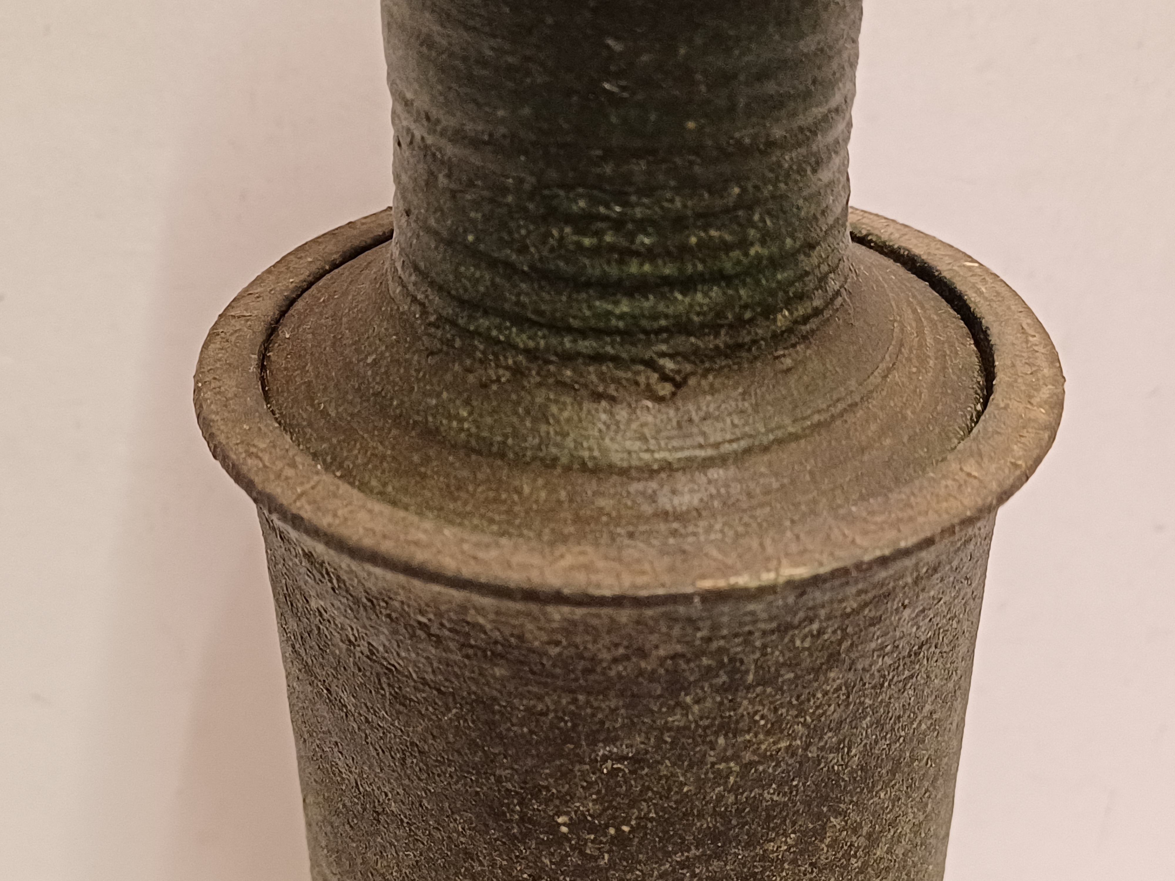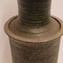 Slanke dekselpot met donkergroene glazuur op ruwe ondergrond. Onderzijde gemerkt en gedateerd.