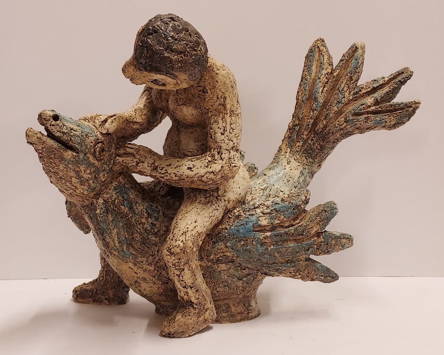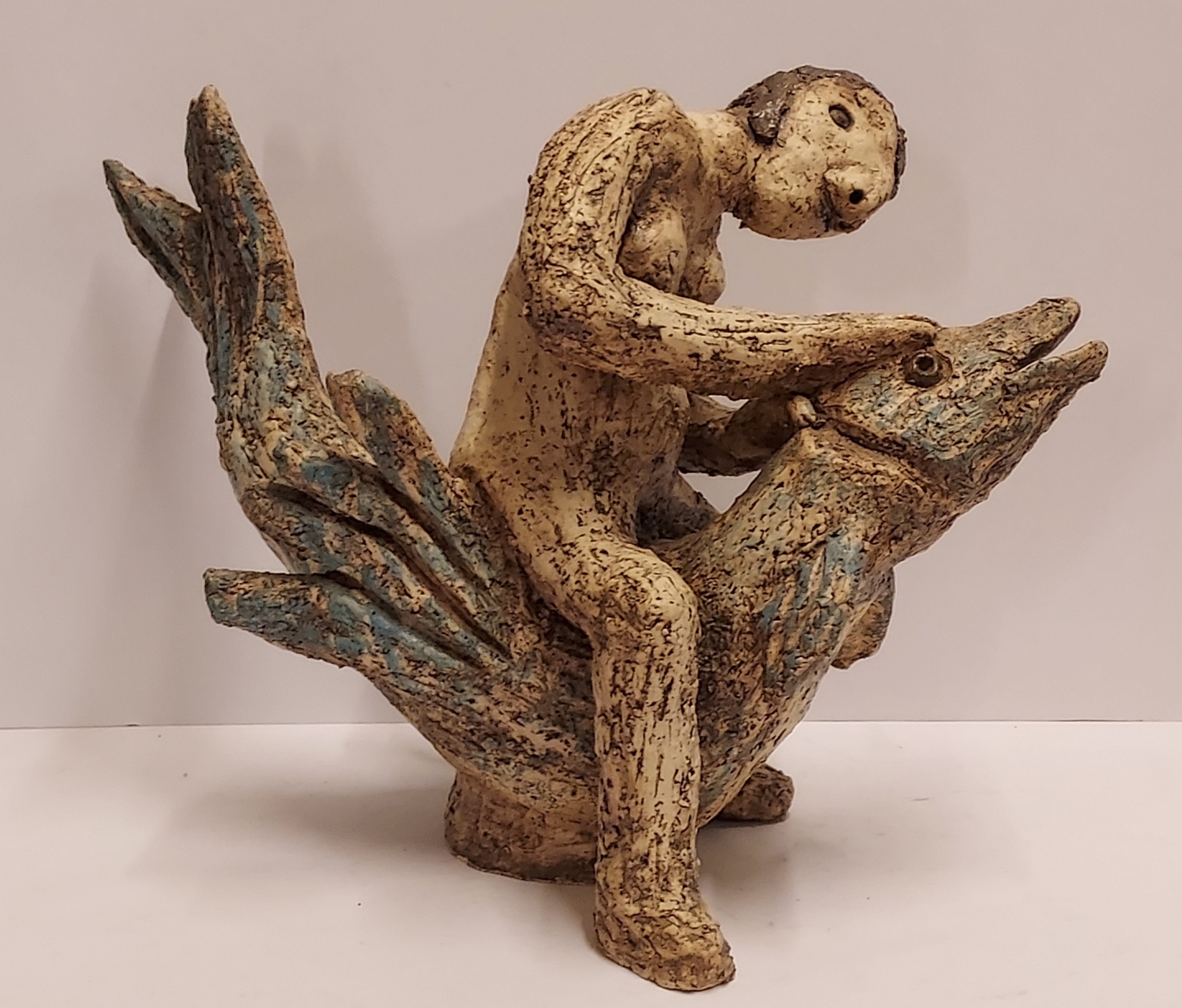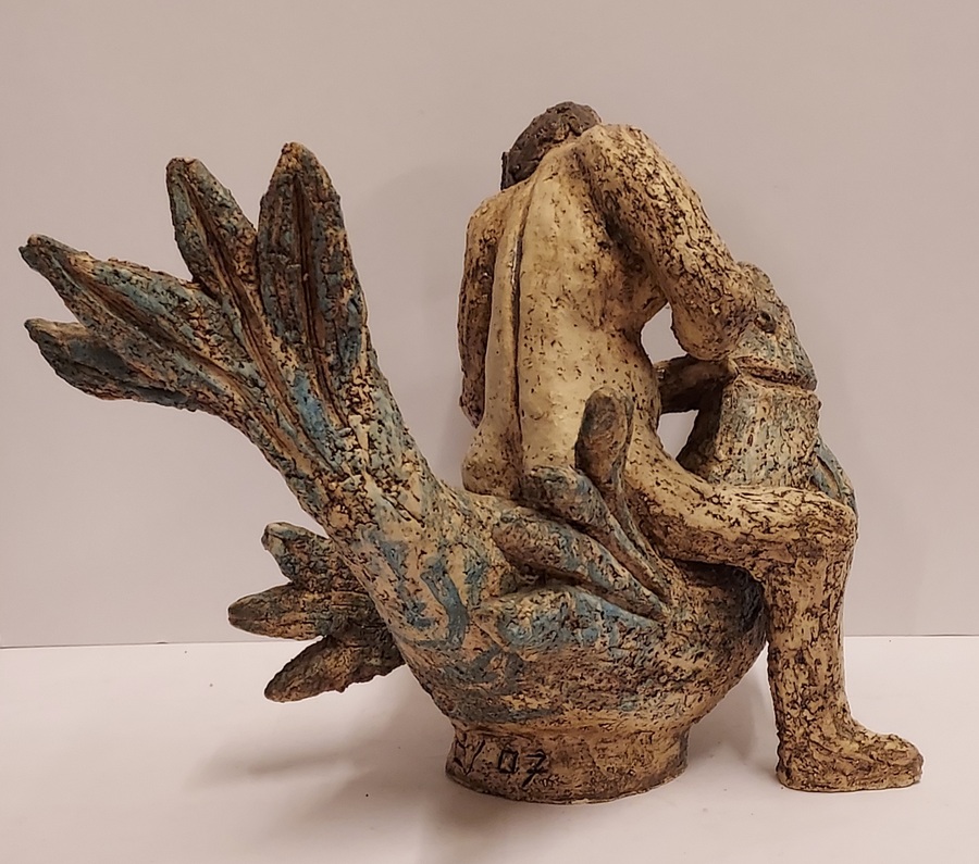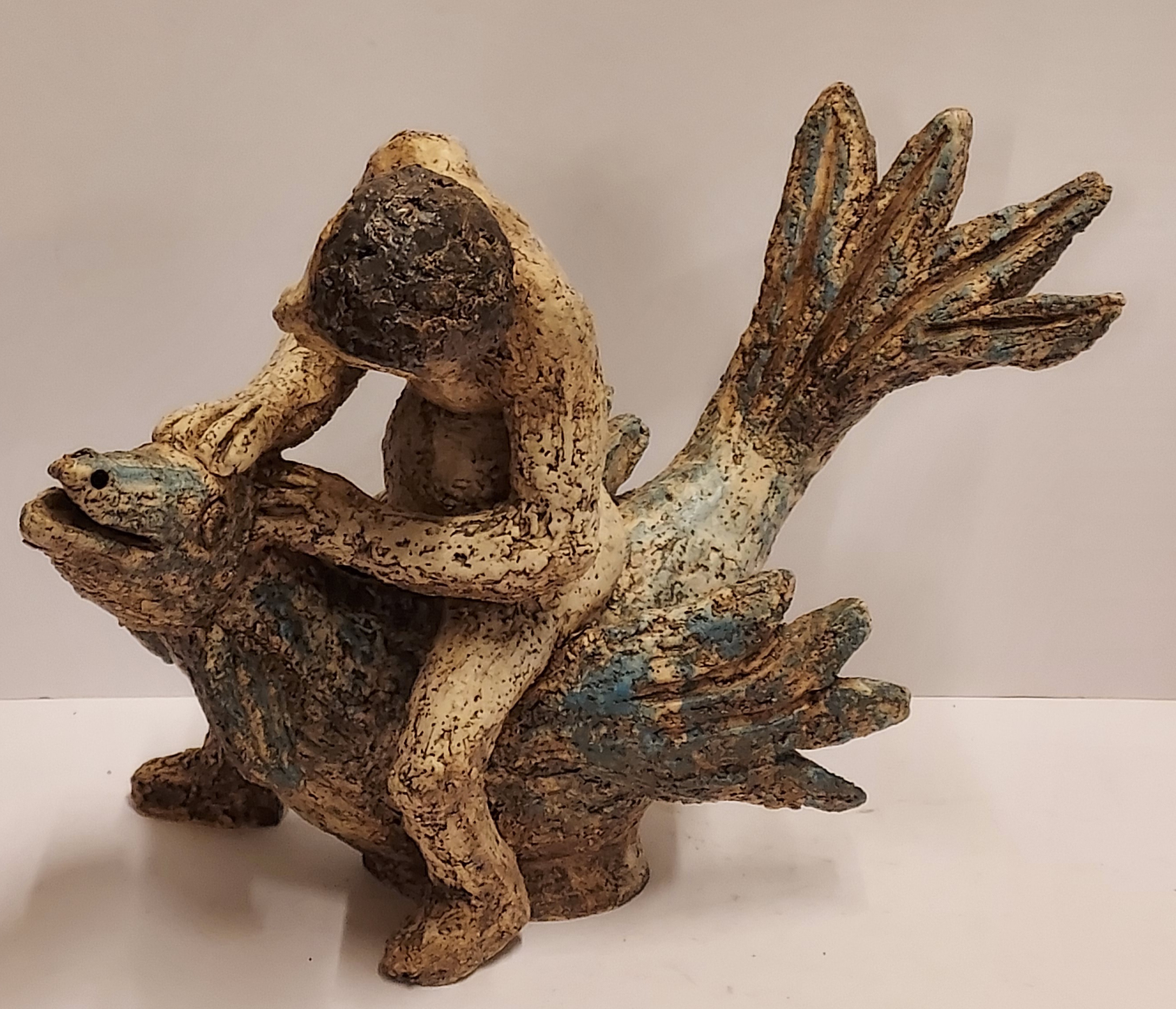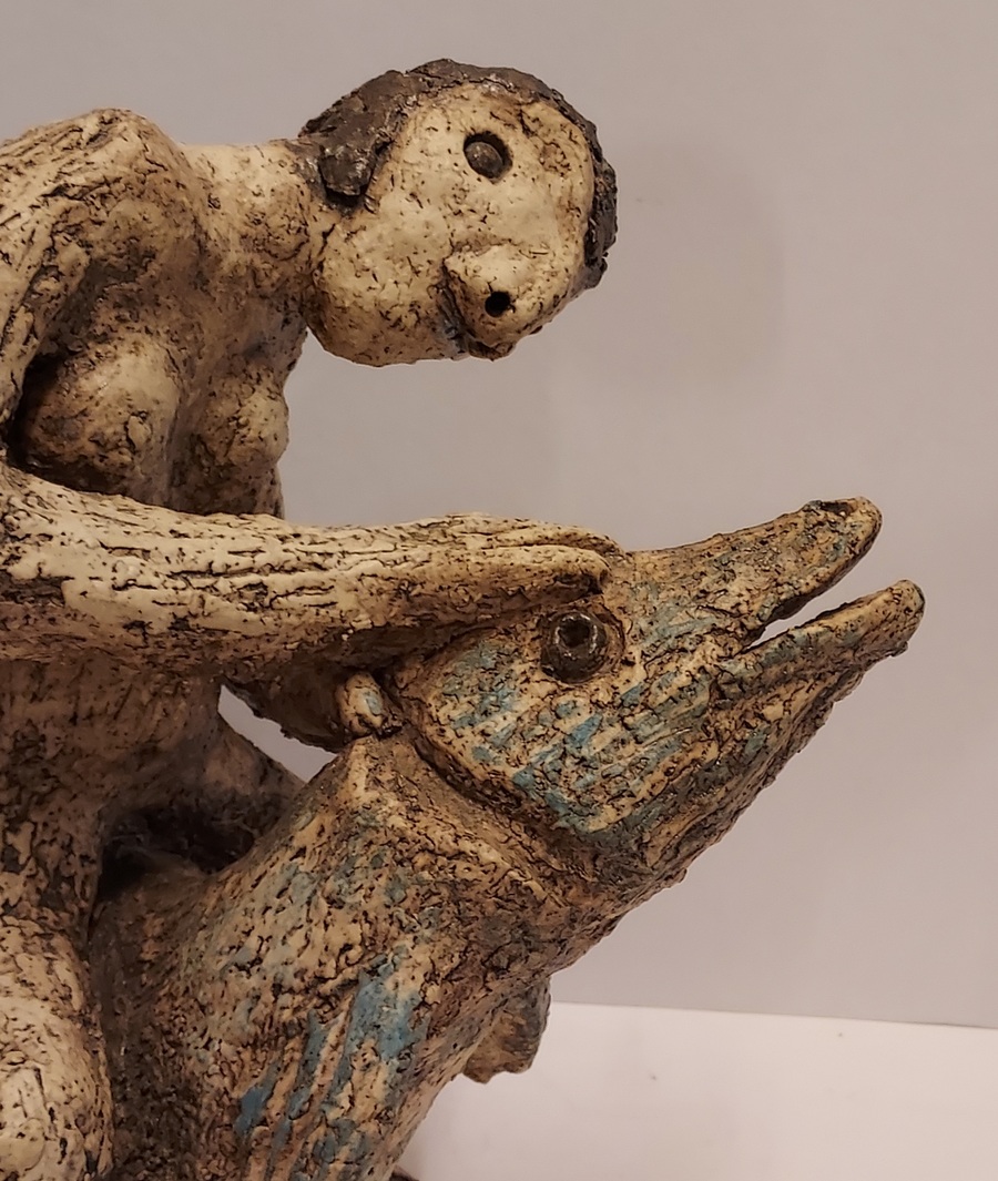 Chamotte freeform sculpture of a boy on a bird. Signed with monogram and '07.