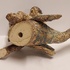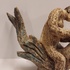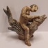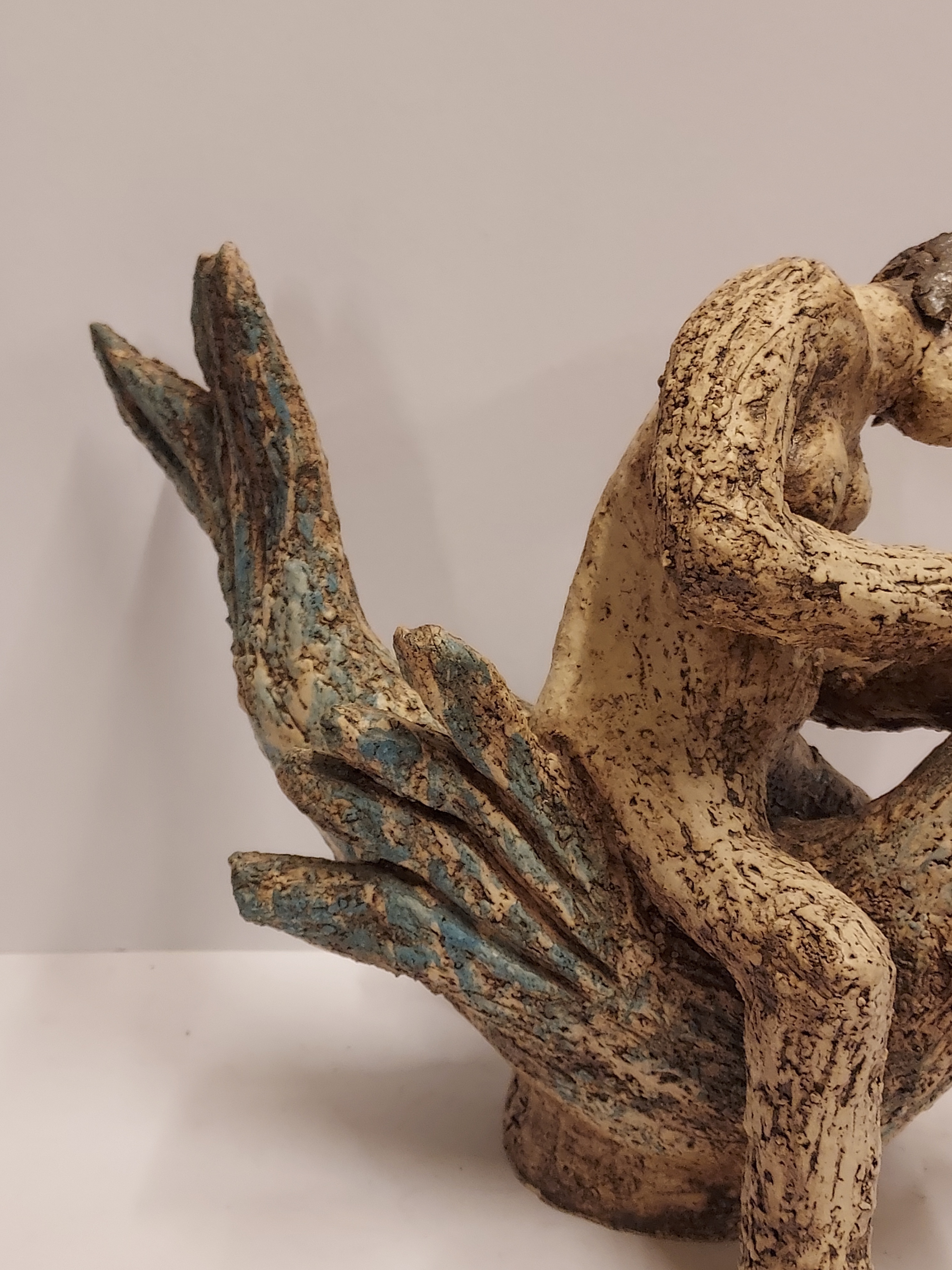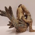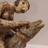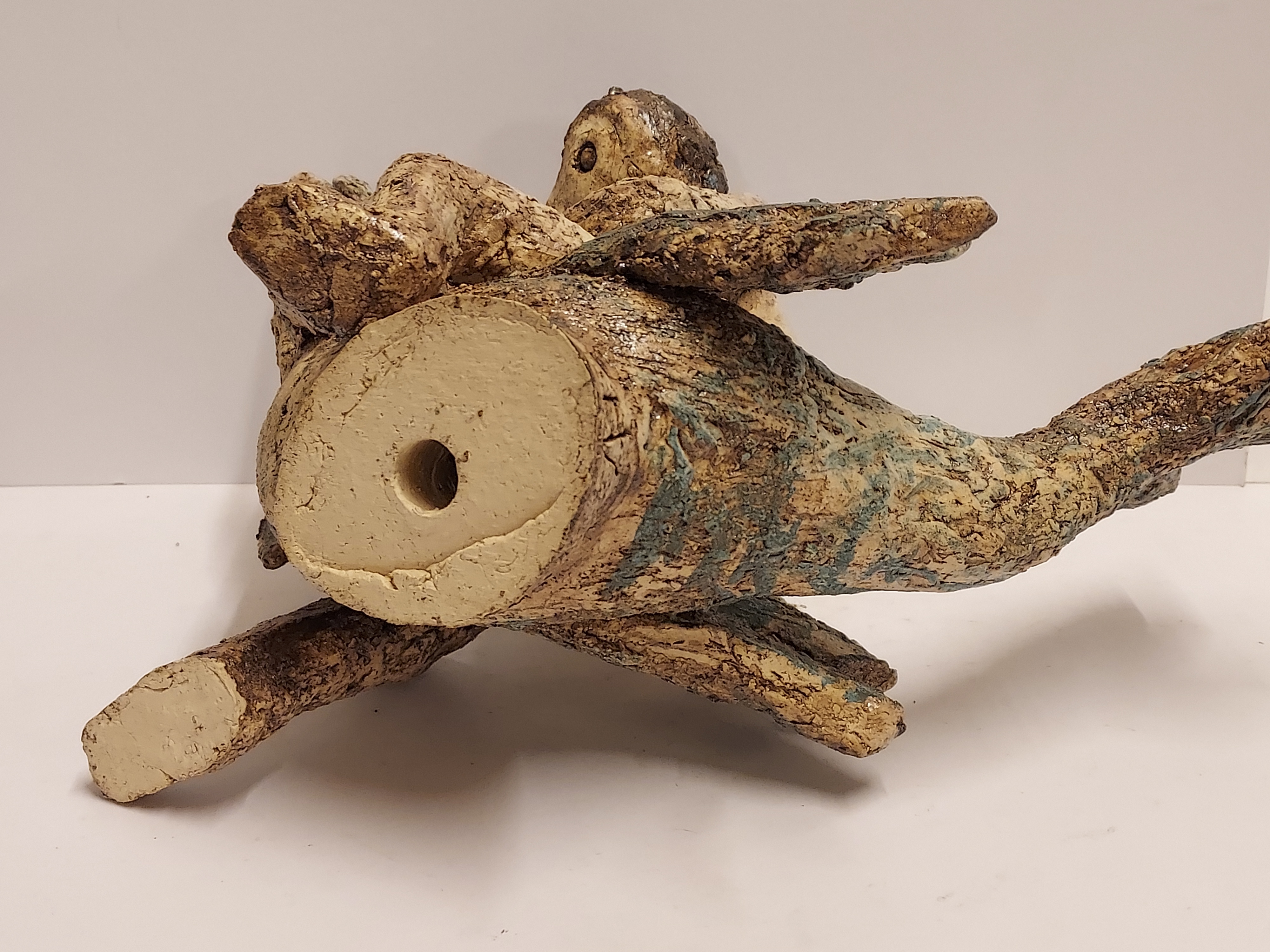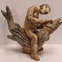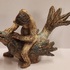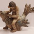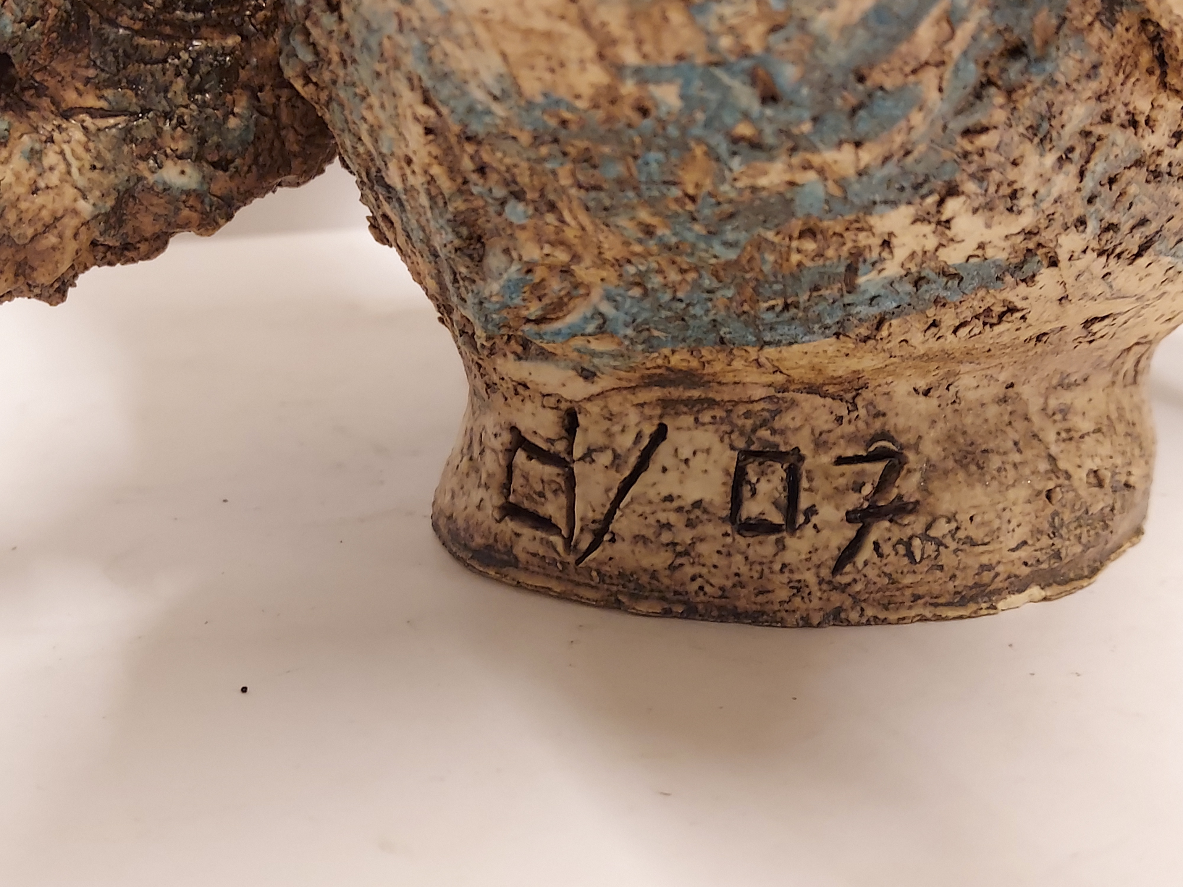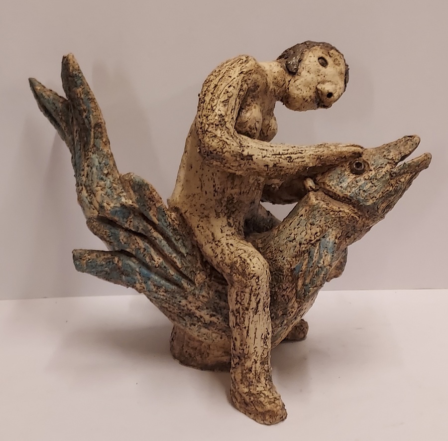 Chamotte freeform sculpture of a boy on a bird. Signed with monogram and '07.