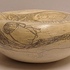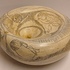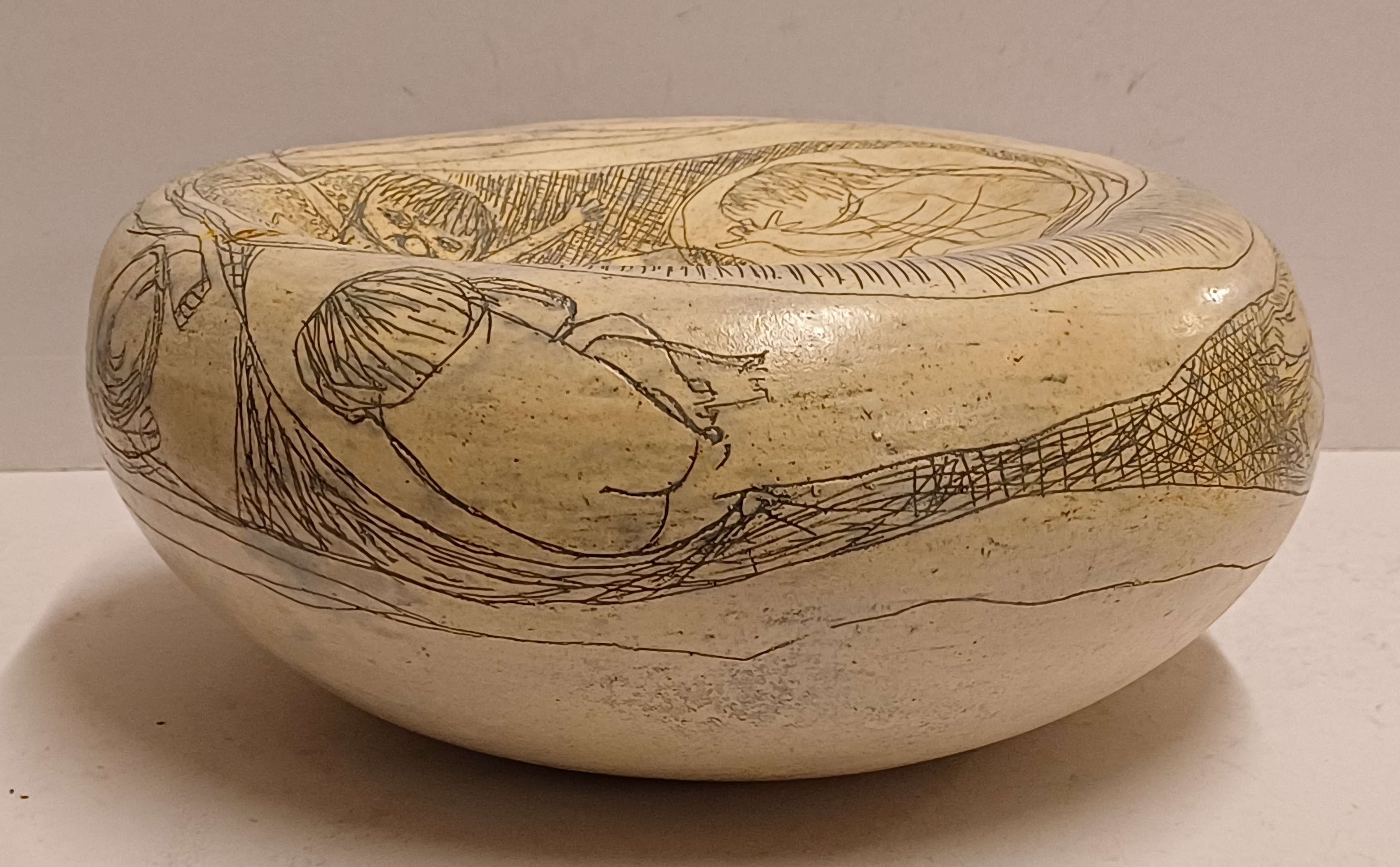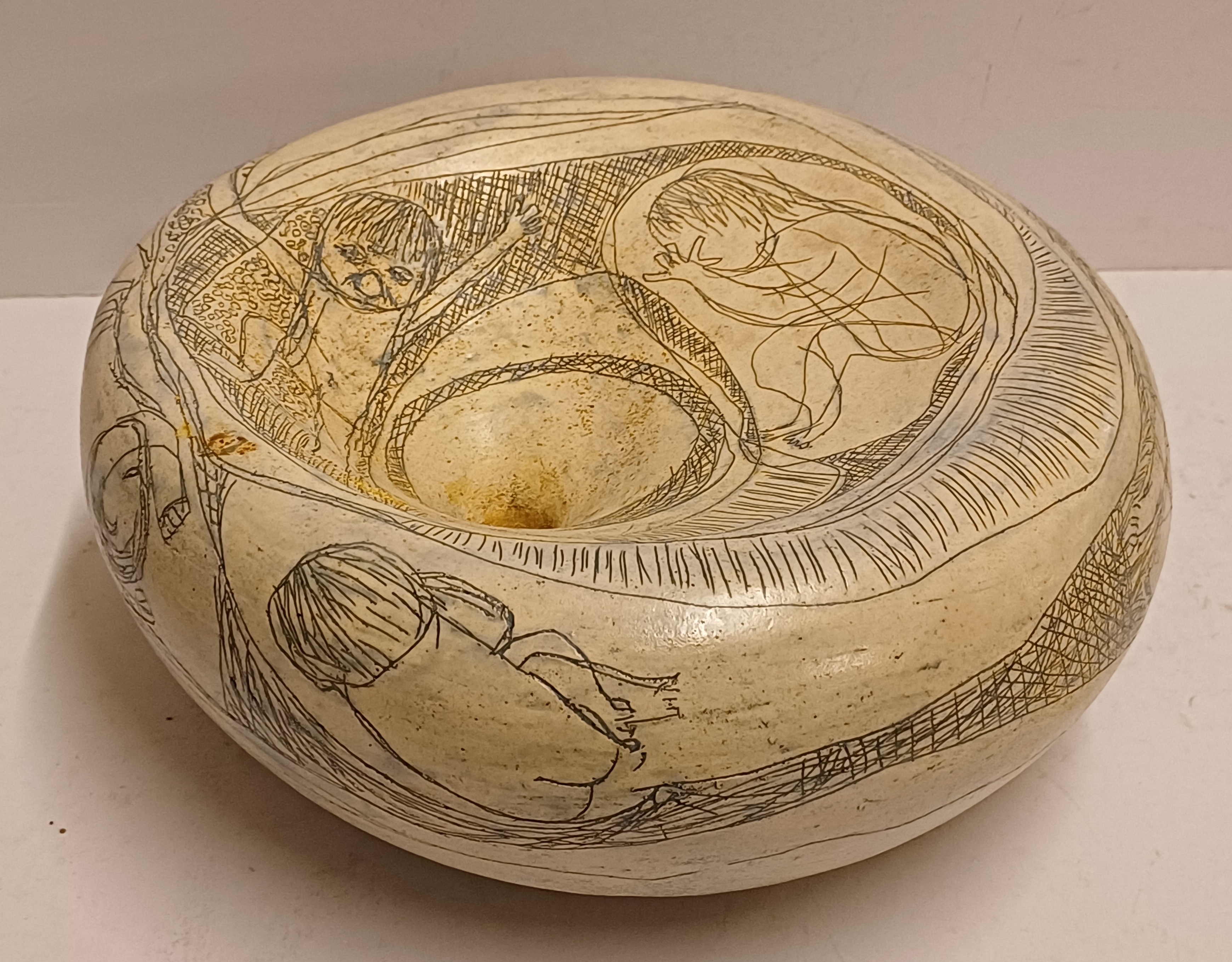 Earthenware bulbous sculpture with incised depiction of figures. Not signed.