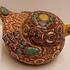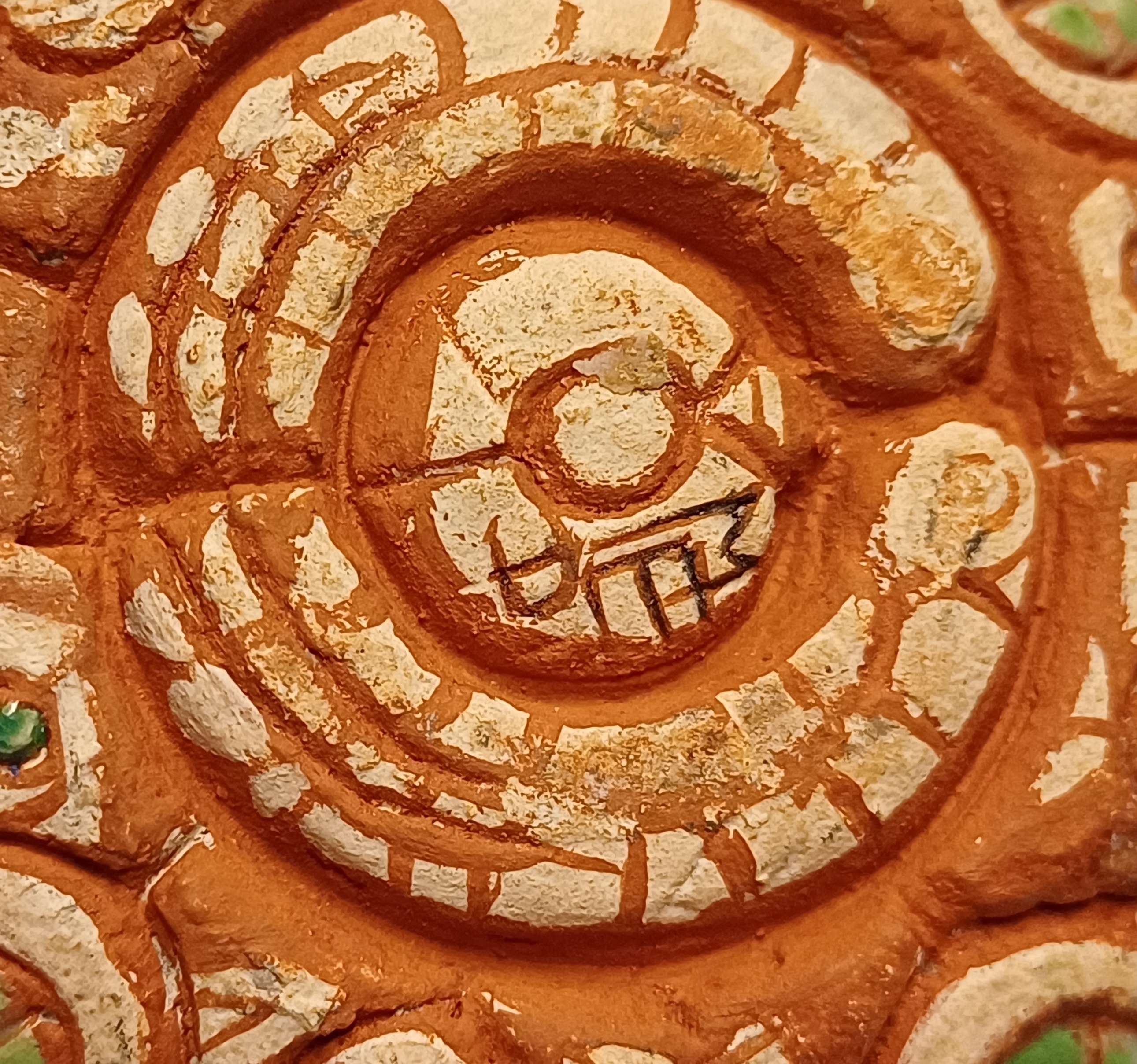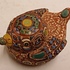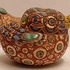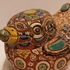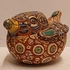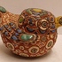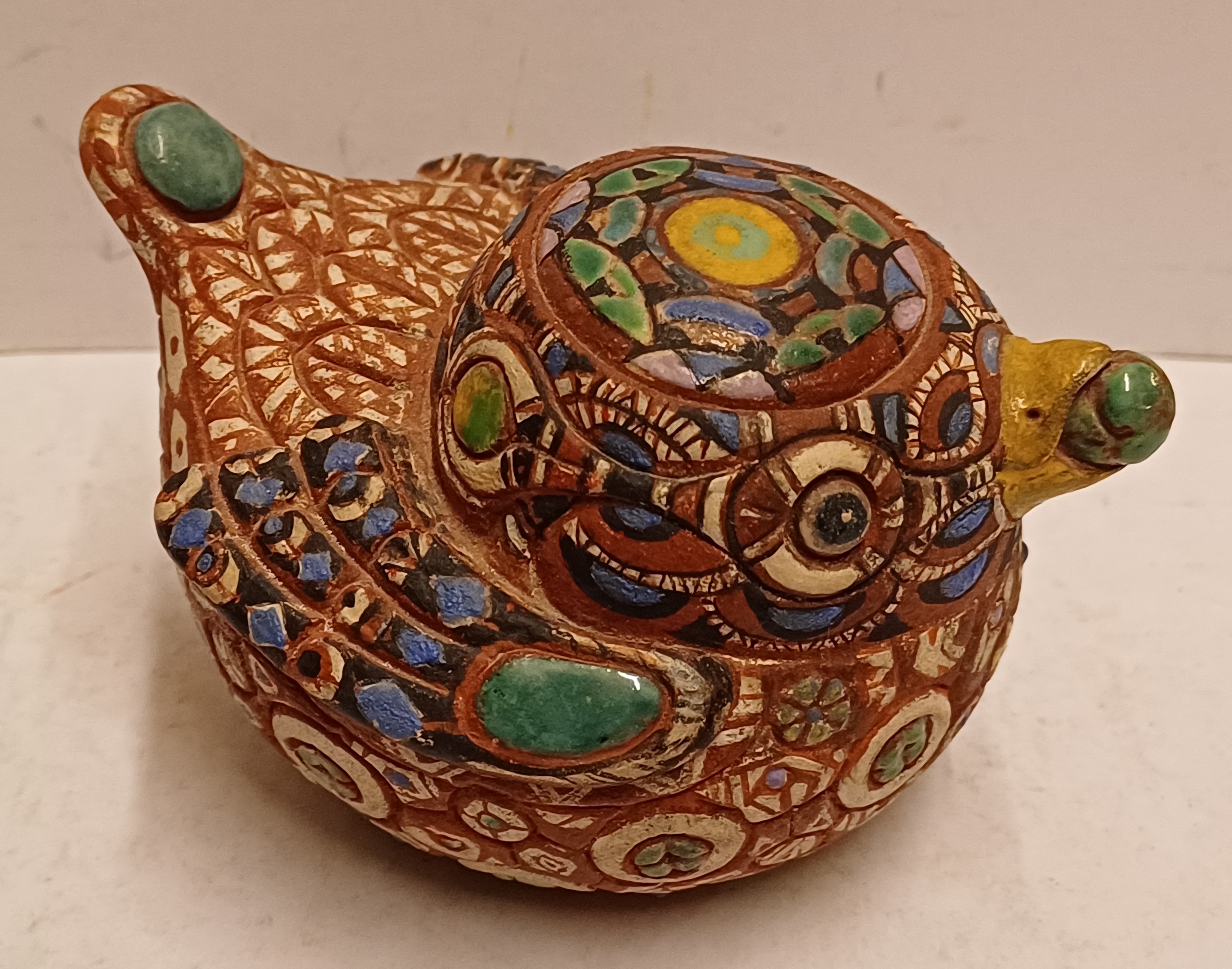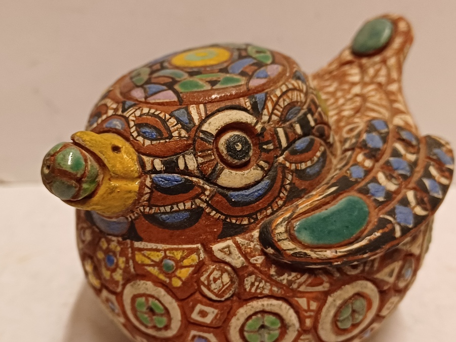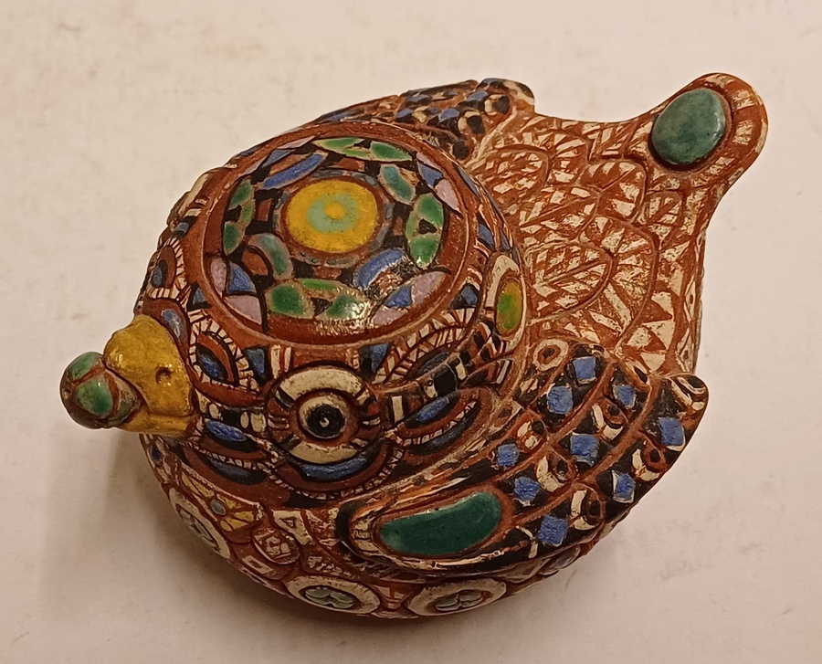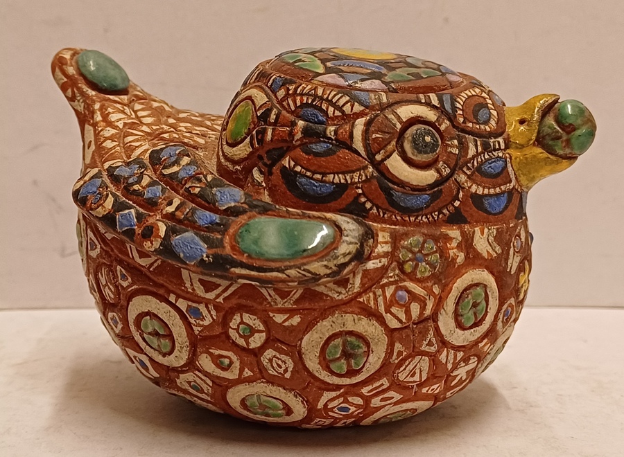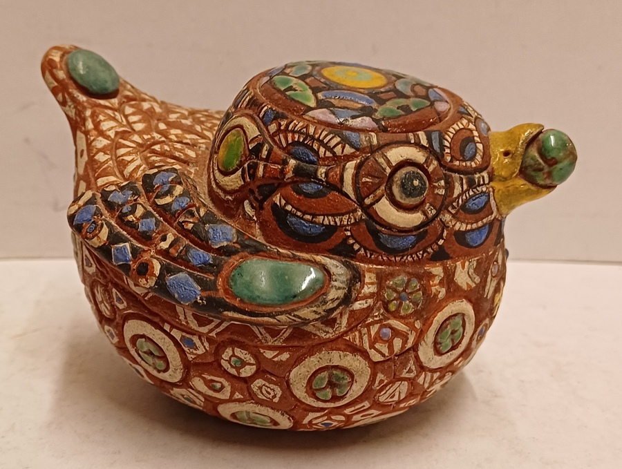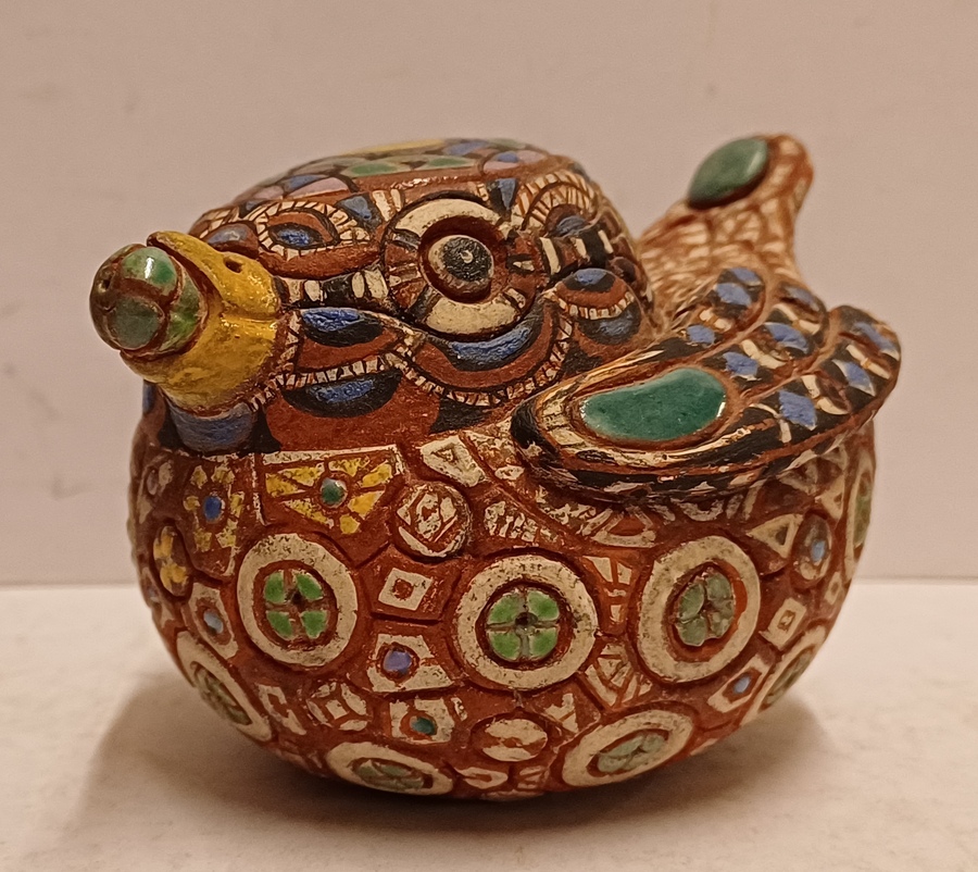 Aardewerken sculptuur van een eendje met ingekefde decoratie en polychrome inkleuring. Onderzijde gesigneerd.