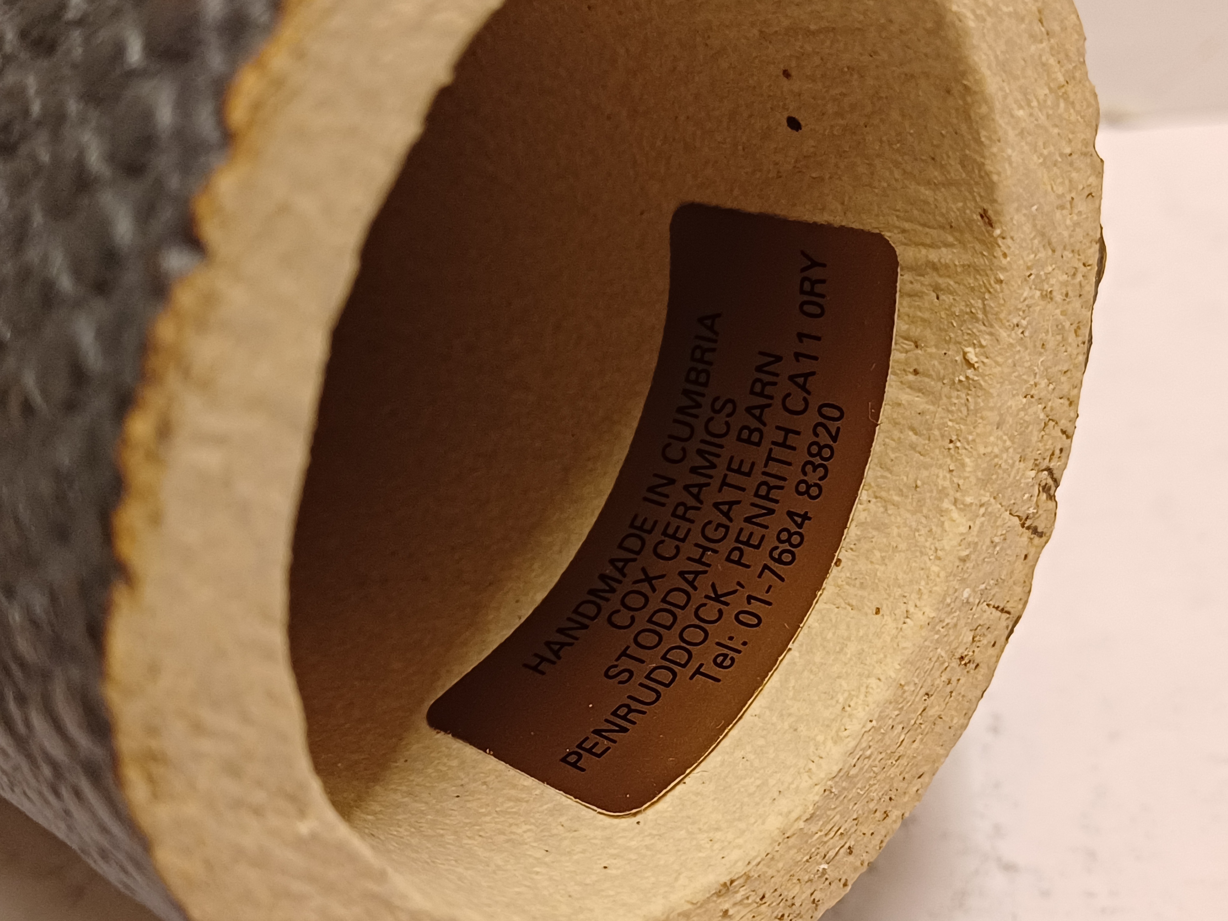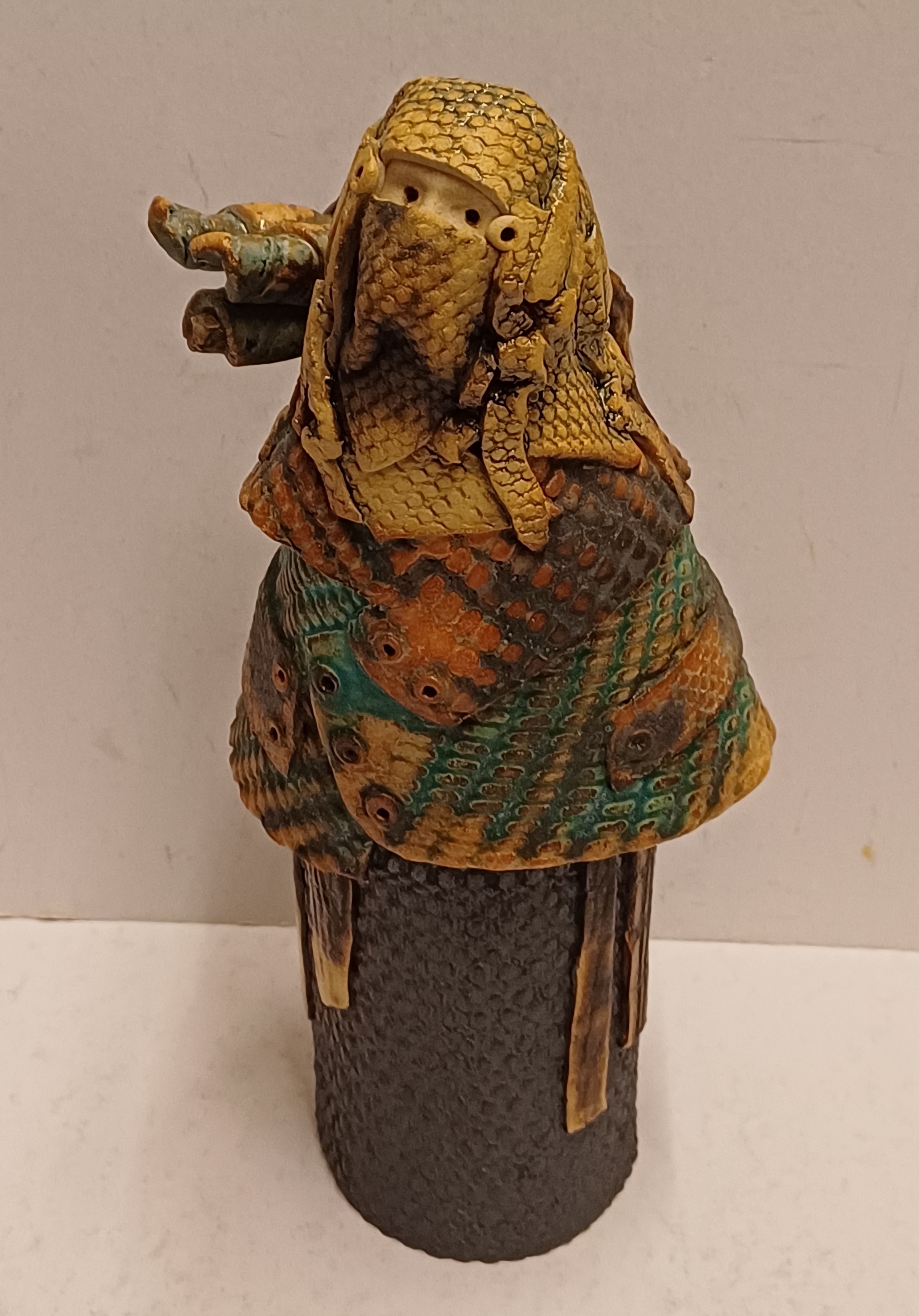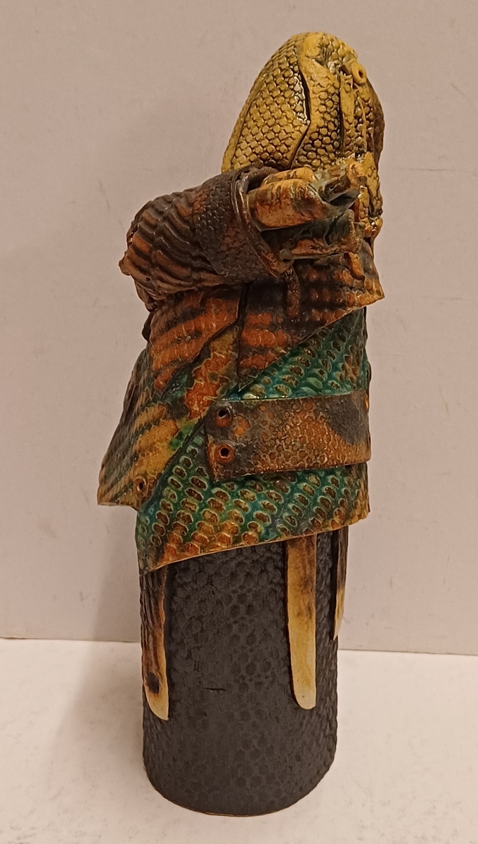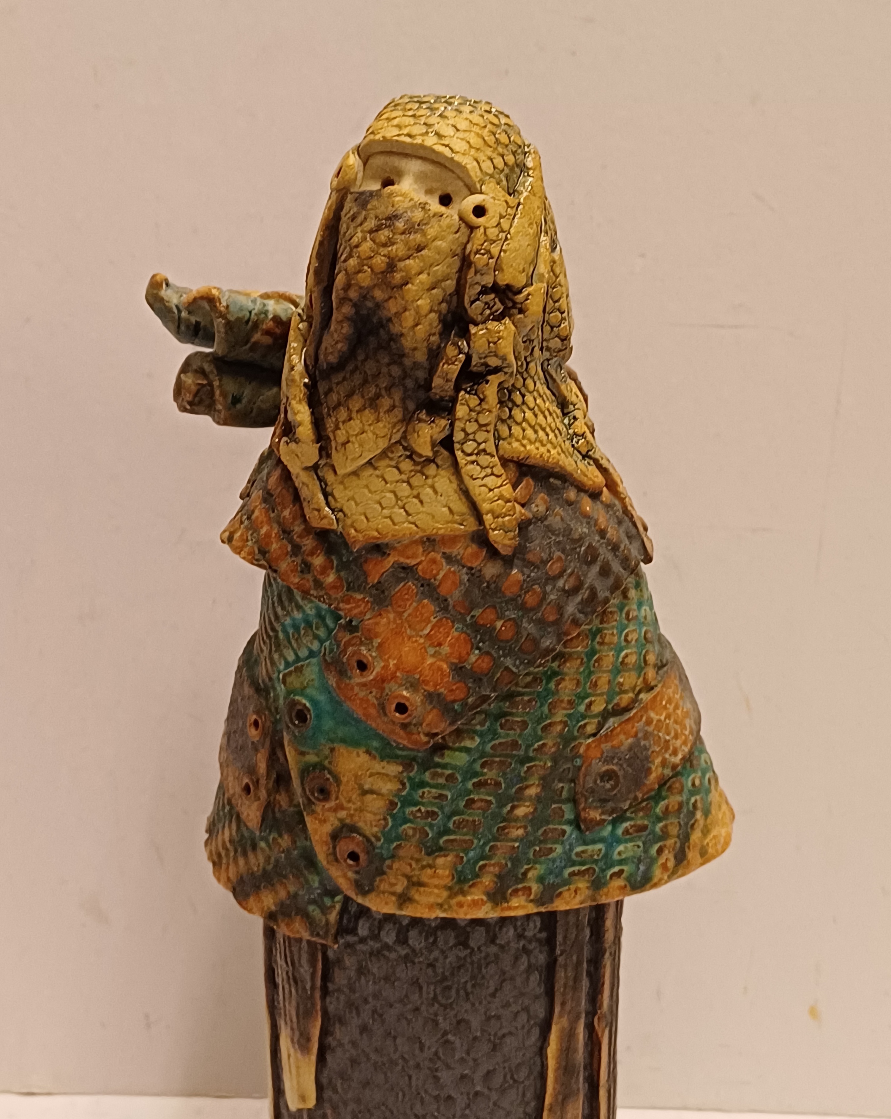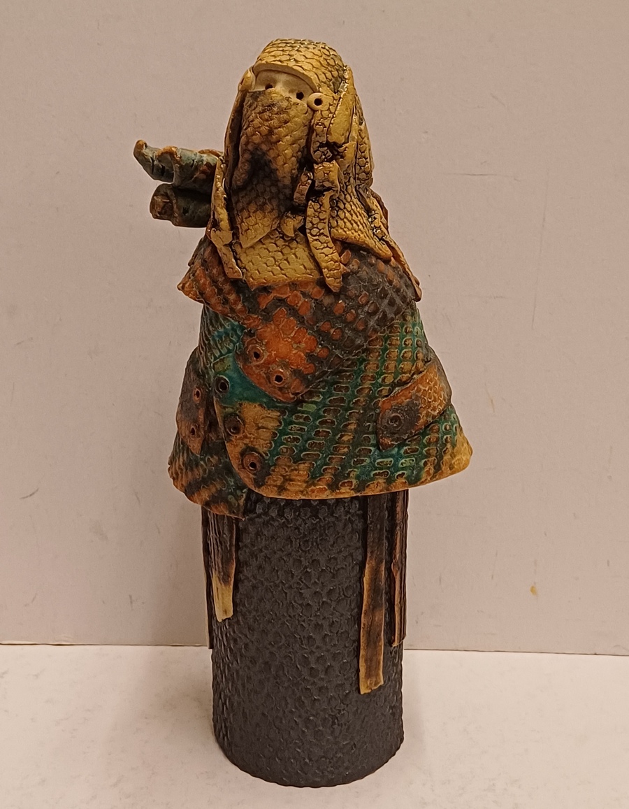 Steengoed figuur met gesluierd kostuum. Binnenzijde met etiket van de kunstenaar