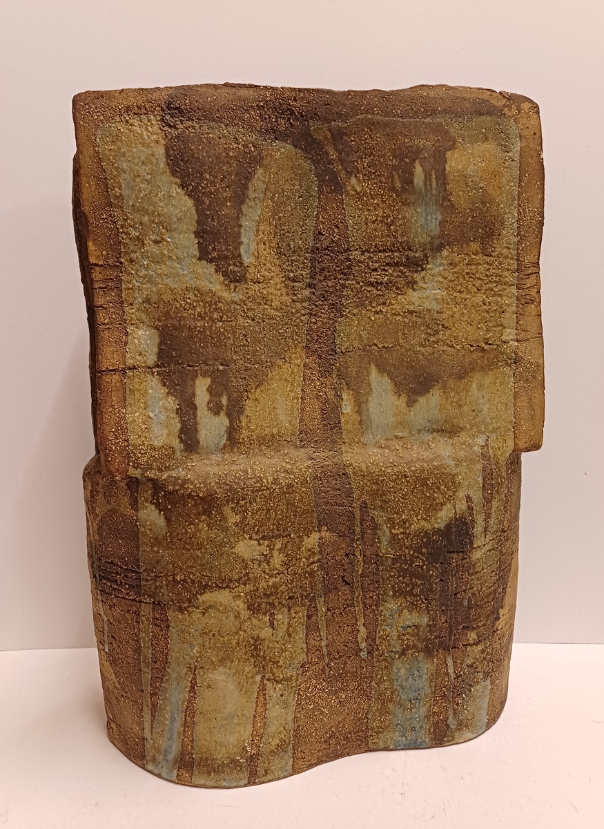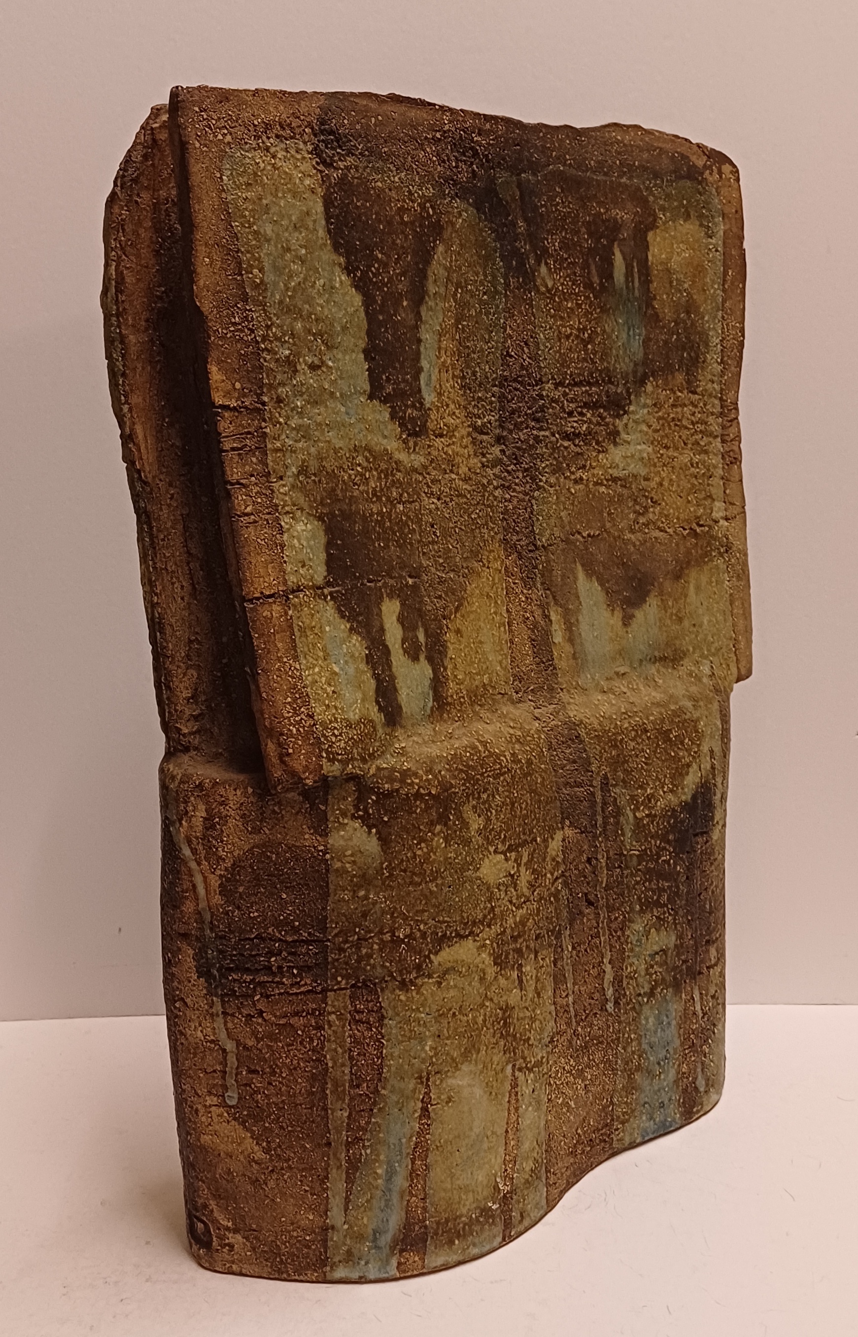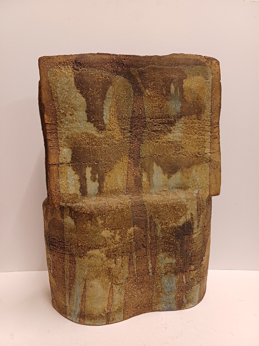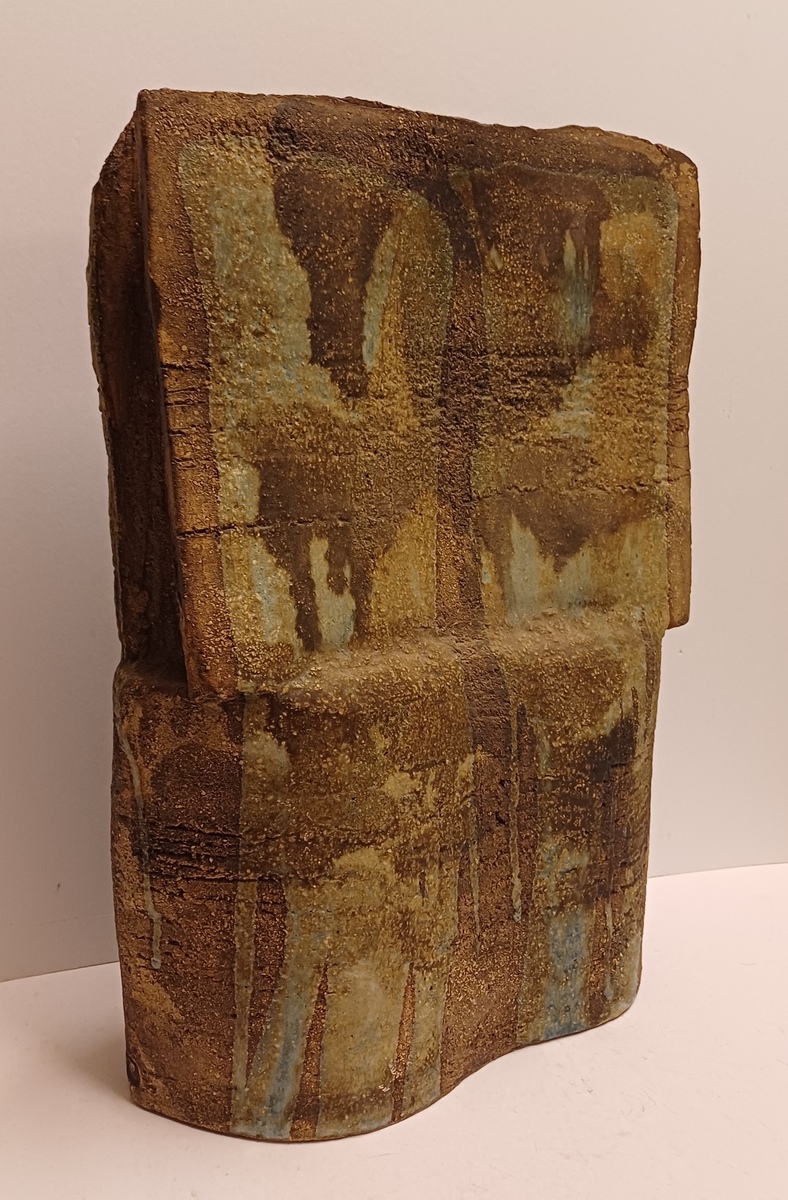 Large sculpture constructed from slabs with a green-brown glaze. Side with monogram stamp. Bottom with exhibition label.