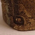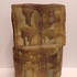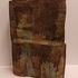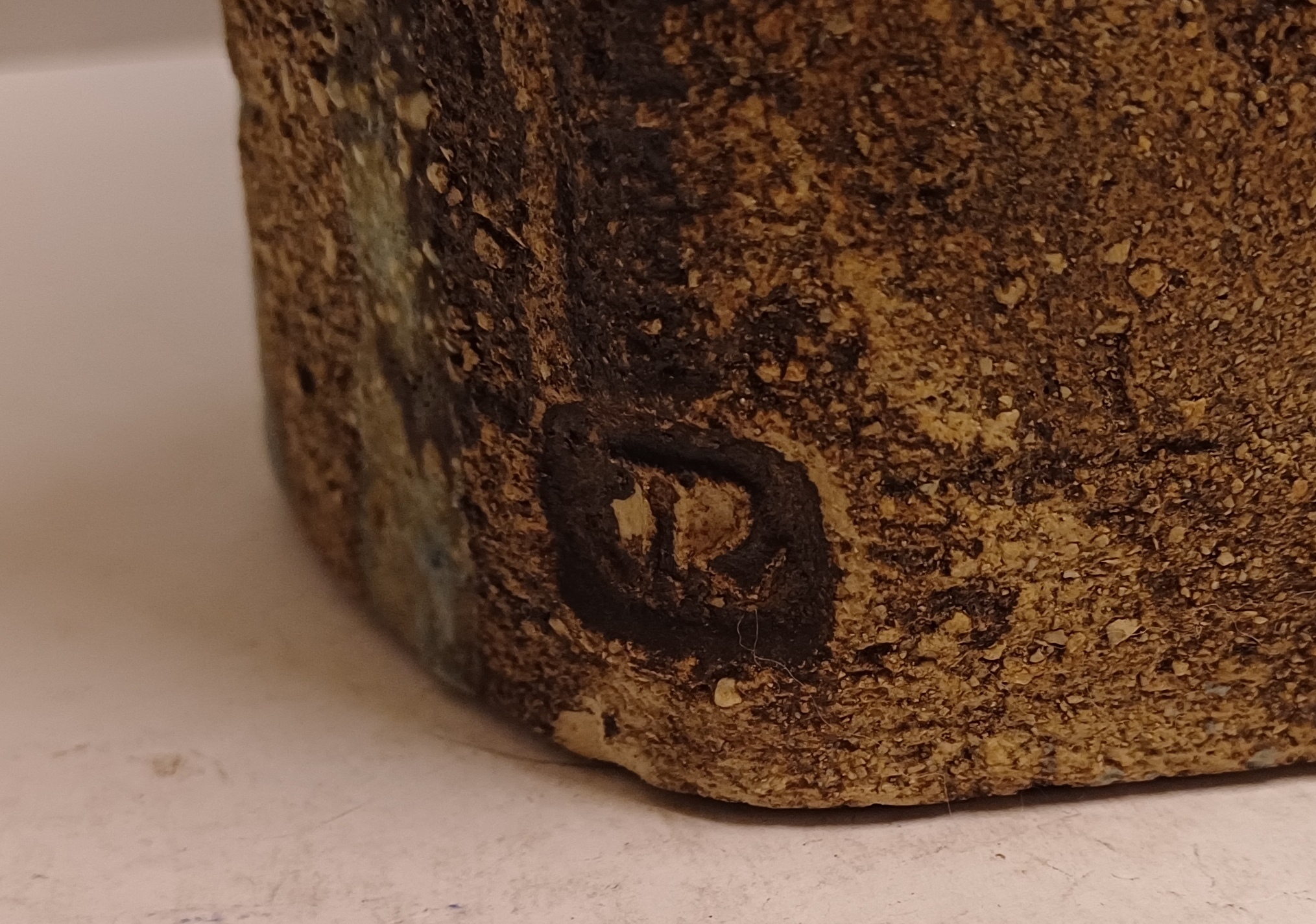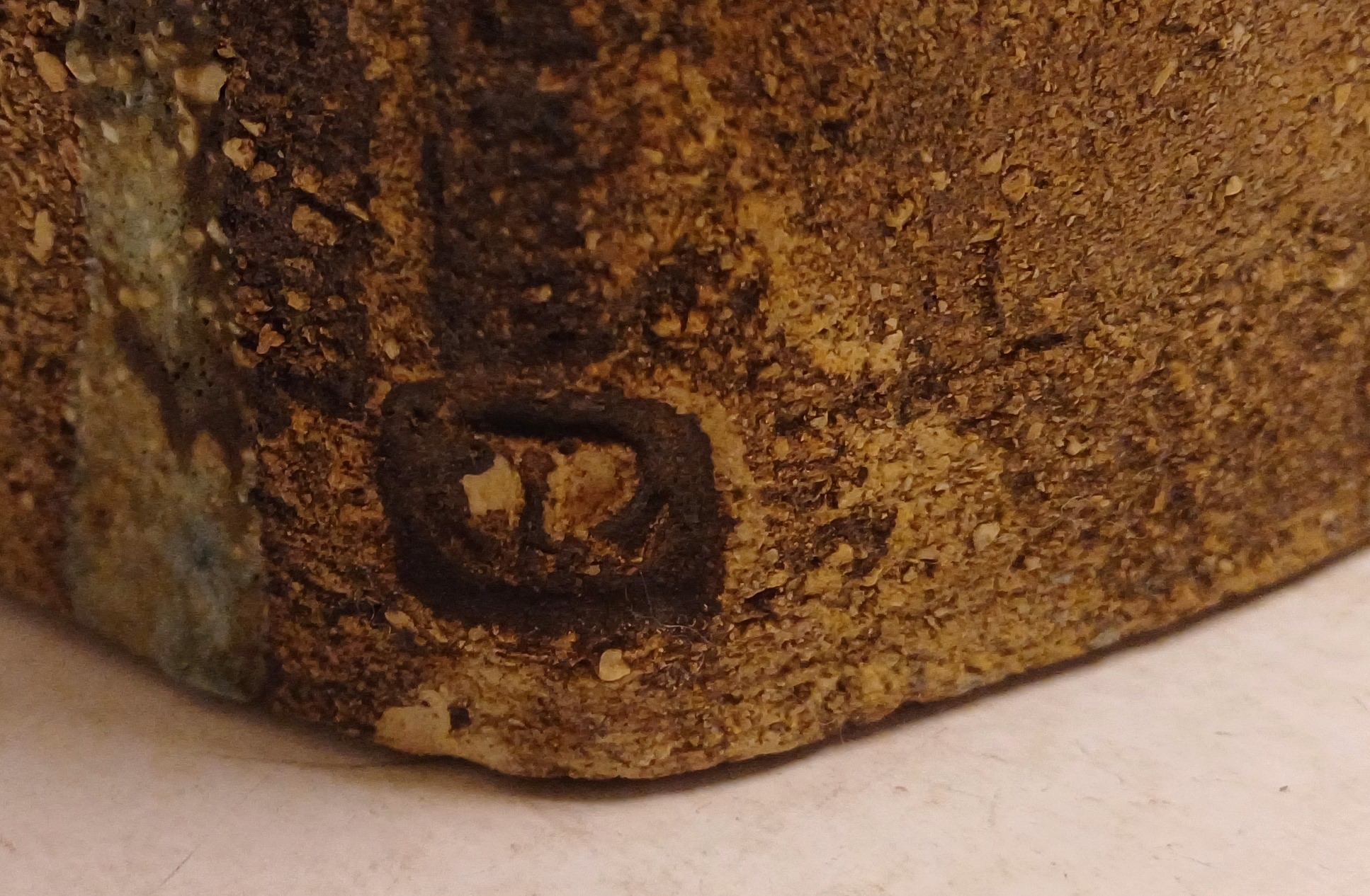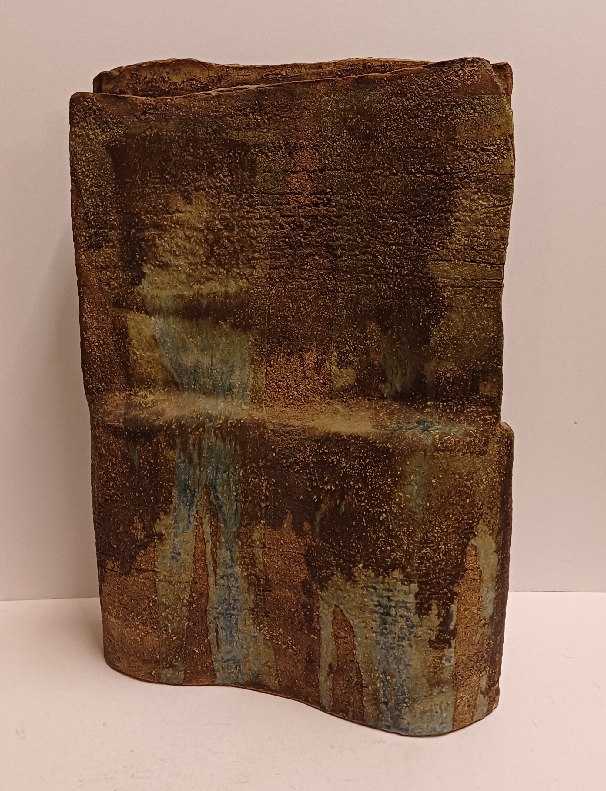 Large sculpture constructed from slabs with a green-brown glaze. Side with monogram stamp. Bottom with exhibition label.