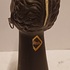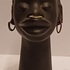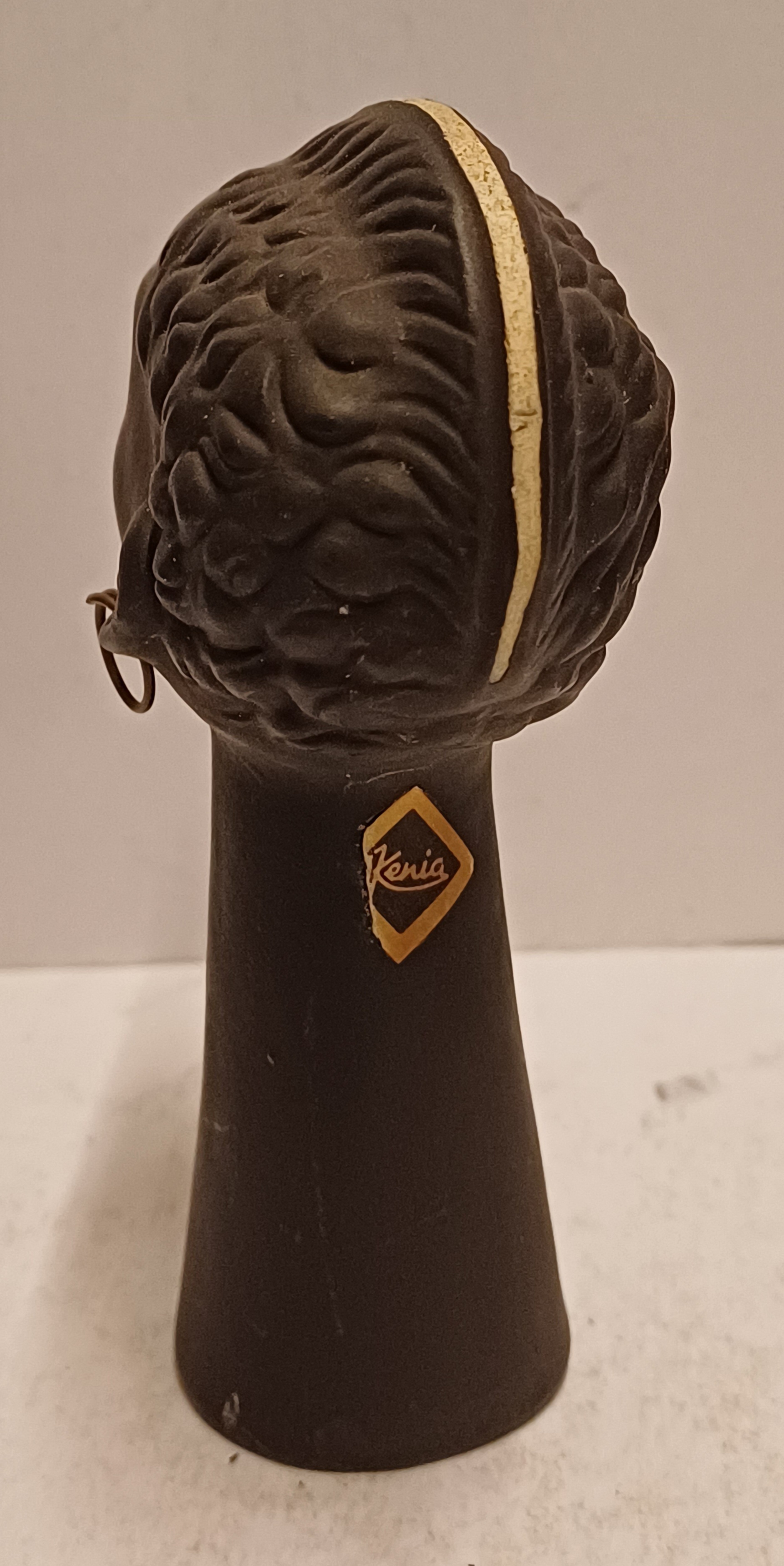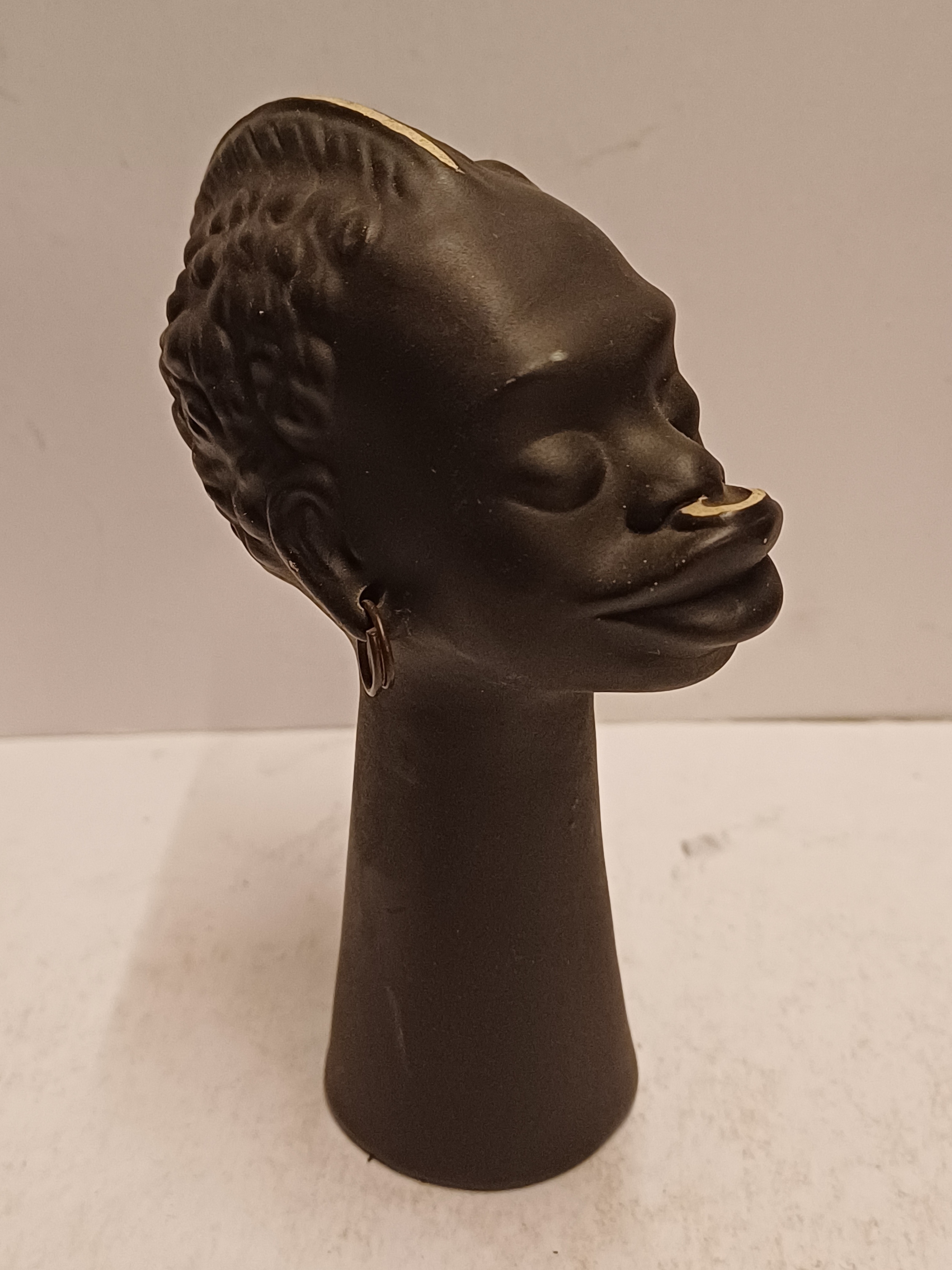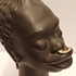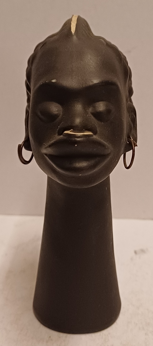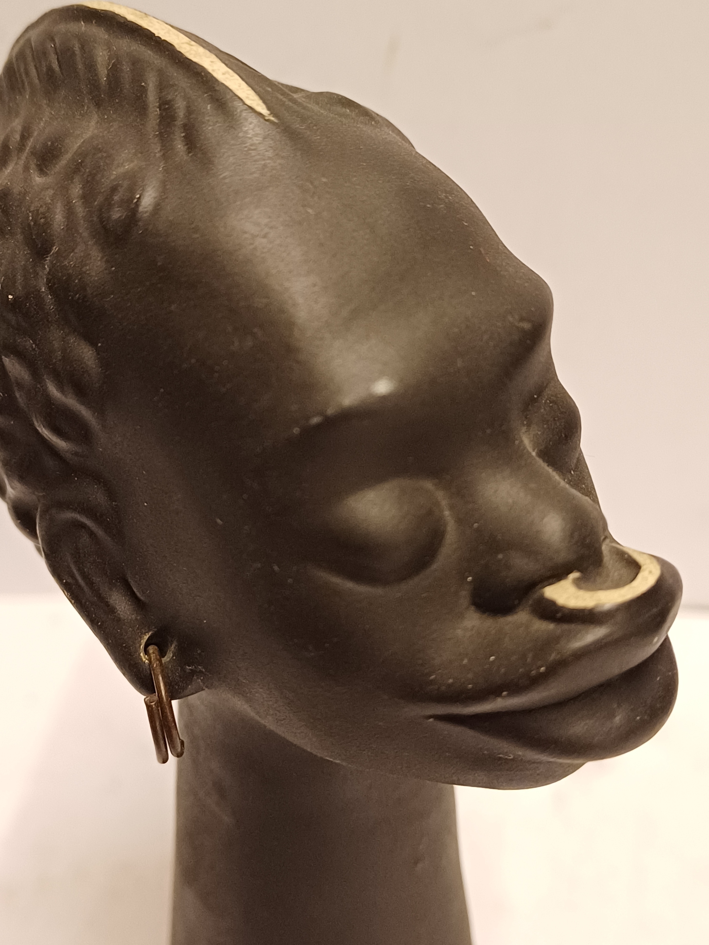 Black glazed head of an African man with metal earrings. Bottom numbered and back of the neck with a Kenya sticker.